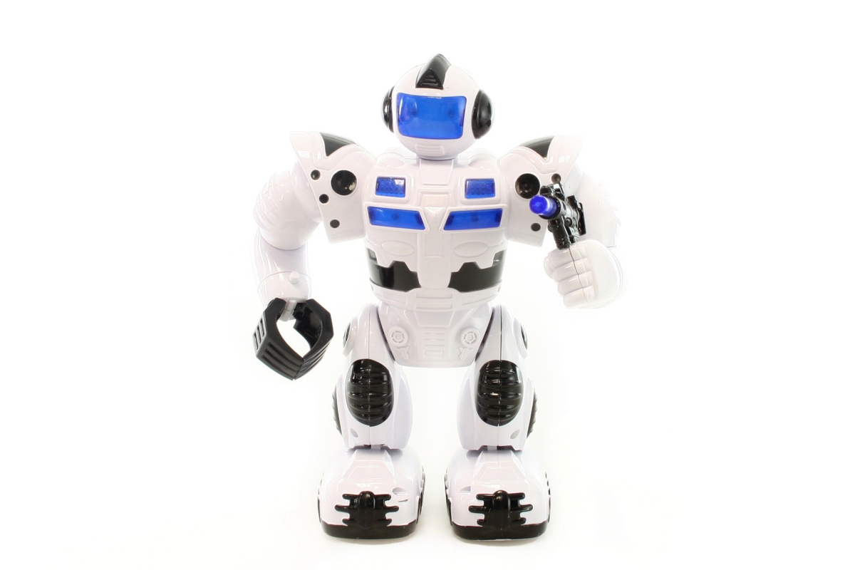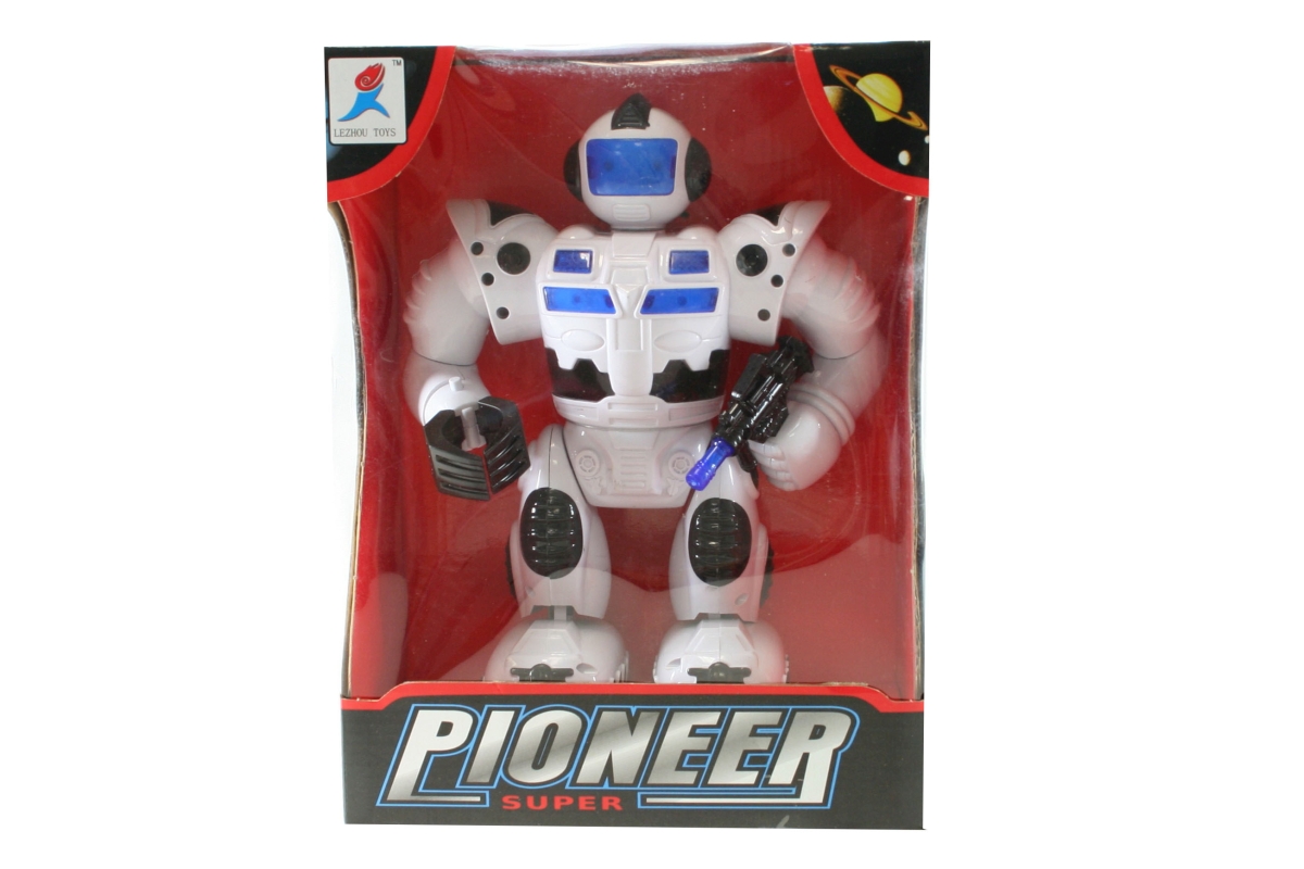 Robot na baterie chodící, svítí a vydává zvuky, pohybuje rukami a hlavou. Napájení na 4x AA baterie (nejsou součástí balení). Rozměr robota cca 23 x 1..