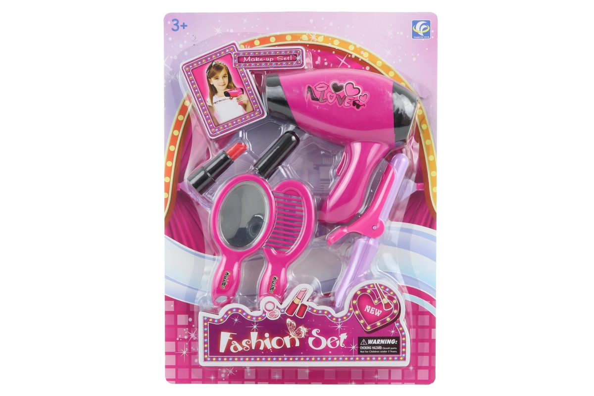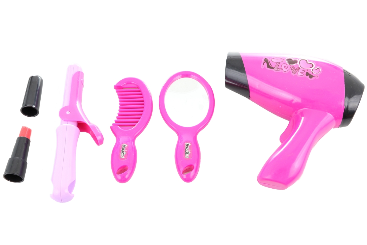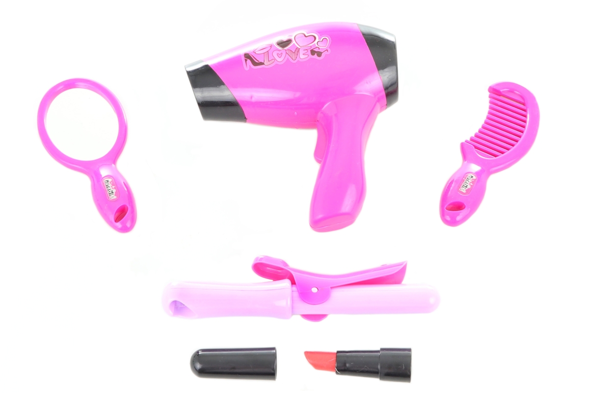 Sada krásy s fénem na baterie. Balení obsahuje fén, kulmu, hřeben a další doplňky. Napájení fénu na 1 AA baterii (není součástí). Rozměry balení cca 2..