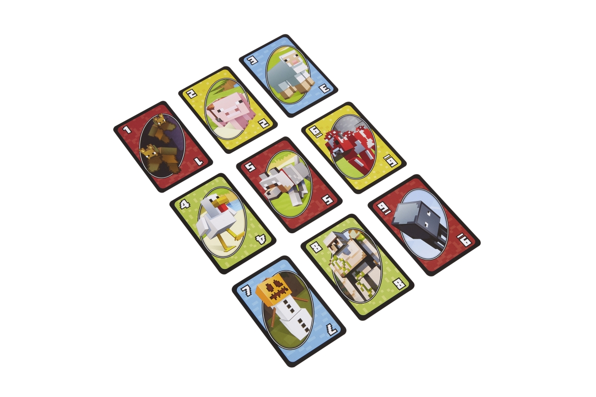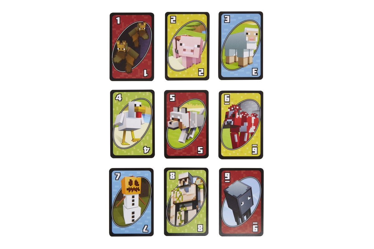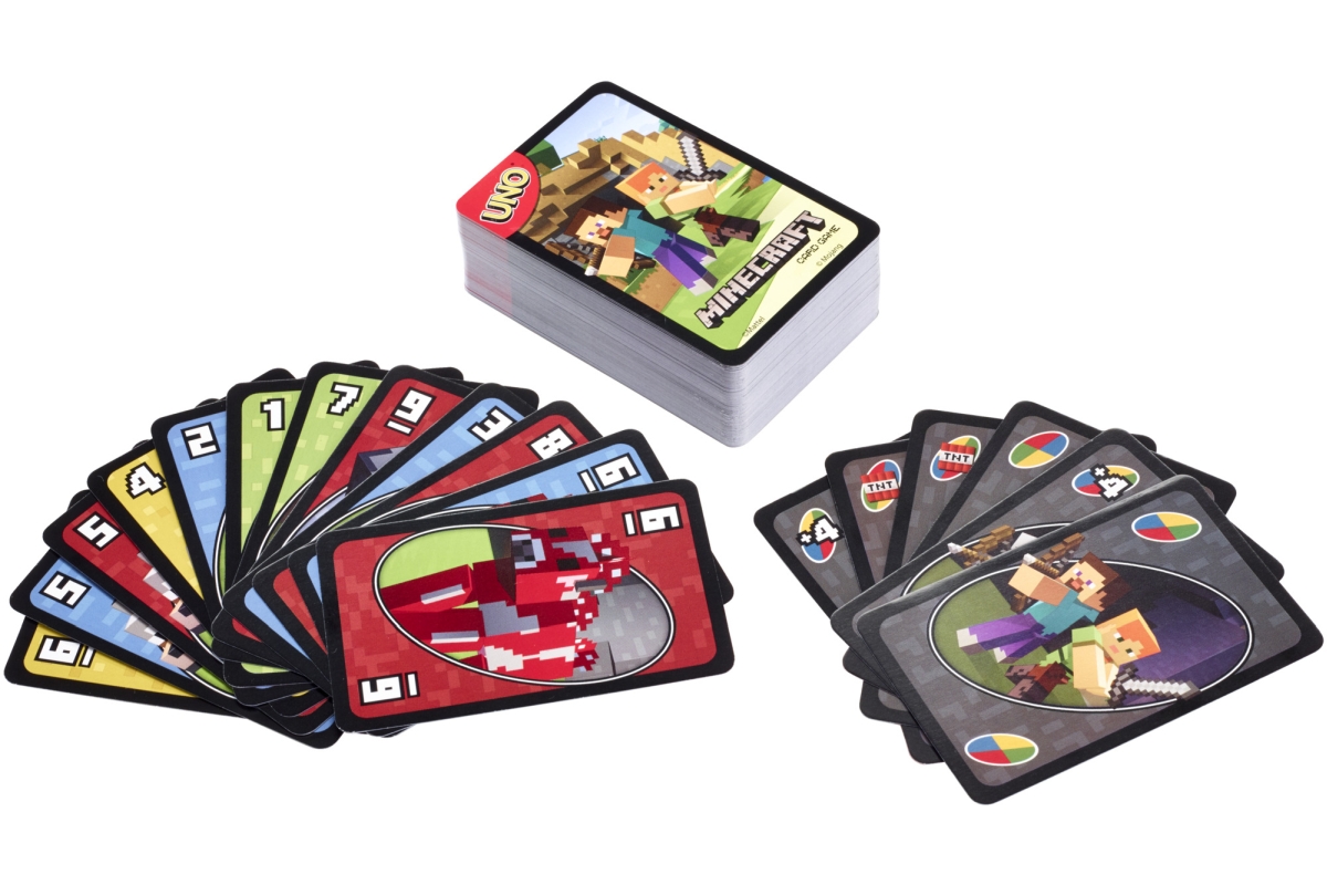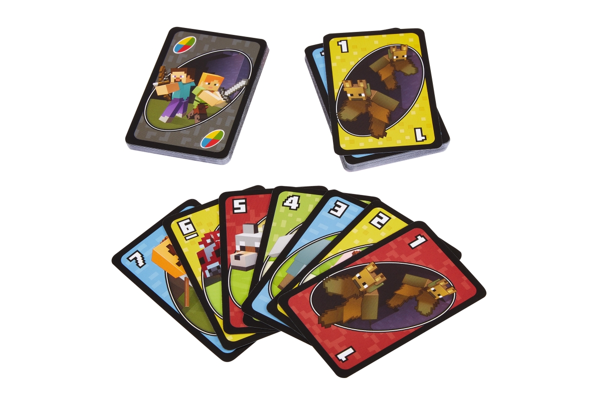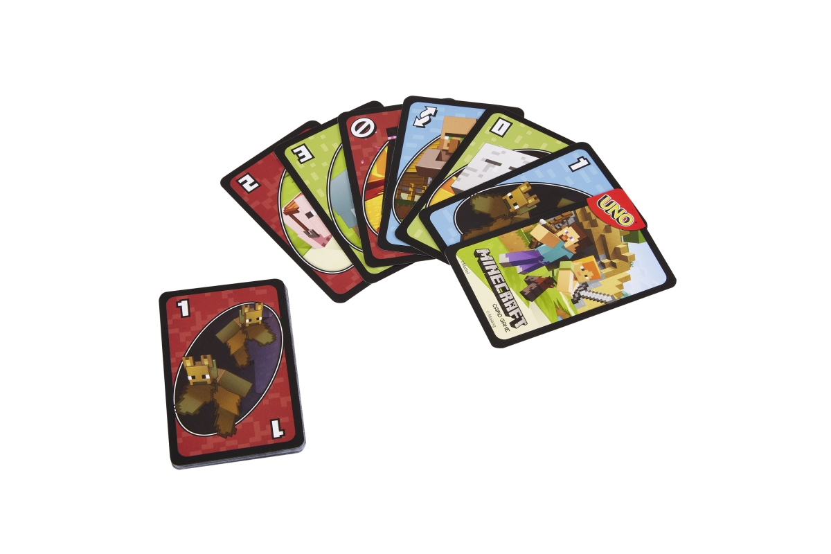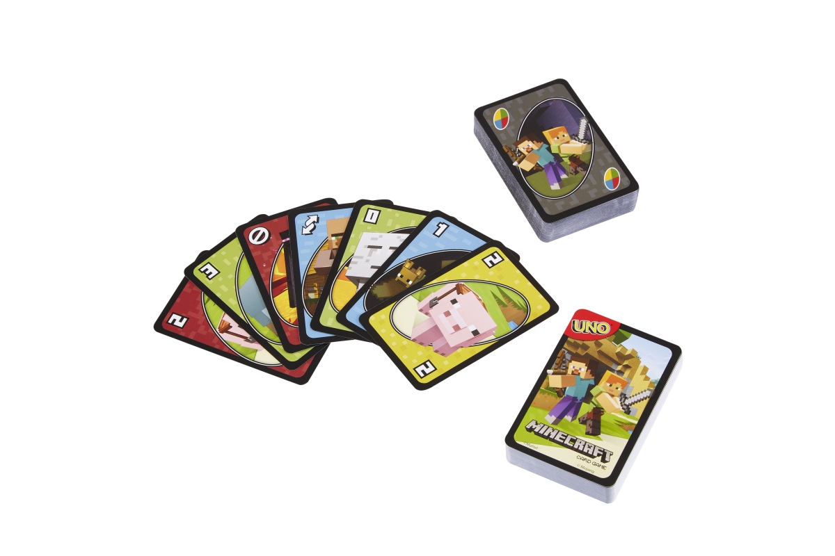Stejně jako ve hře UNO , kterou máte rádi, účastní se hry UNO ™ Minecraft hráči snažící se co nejrychleji zbavit všech svých karet, ale tato verze obsahuje karty s postavami a obrázky Minecraftu a speciální pravidlo! Snažíte se přiřadit kartu ve své ruce k aktuální kartě, která je odkryta navrchu balíčku odložených karet a získáte body za karty, které vašim soupeřům zůstanou v držení. A v UNO ™ Minecraft existuje také nový typ akční karty, když si vytáhnete kartu Creeper, ukažte ji ostatním hráčům a oni si budou muset nabrat další tři karty! První hráč, který dosáhne 500 bodů, vyhrává. Když už máte jen jednu kartu, nezapomeňte zakřičet „UNO!“ Obsahuje 112 karet plus pokyny. Pro 2 až 10 hráčů ve věku od 7 let. Snadné vytáhnout, nemožné odložit. Barvy a dekorace se mohou lišit.