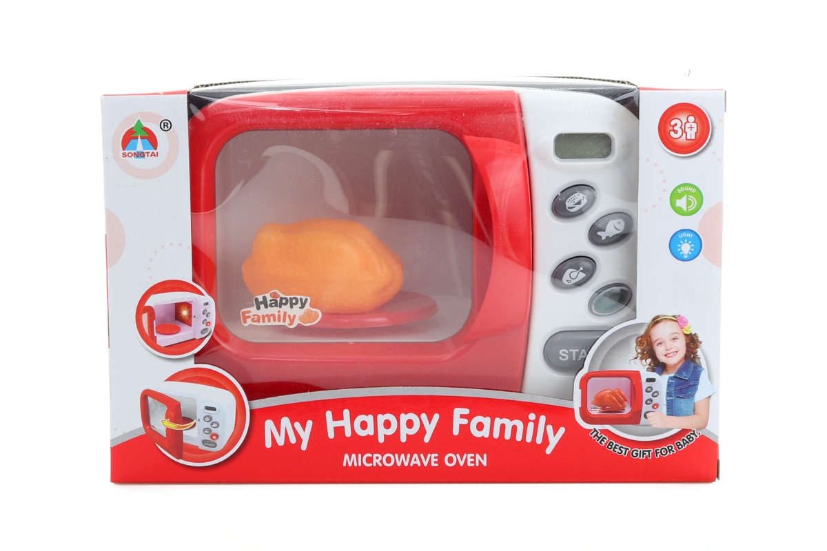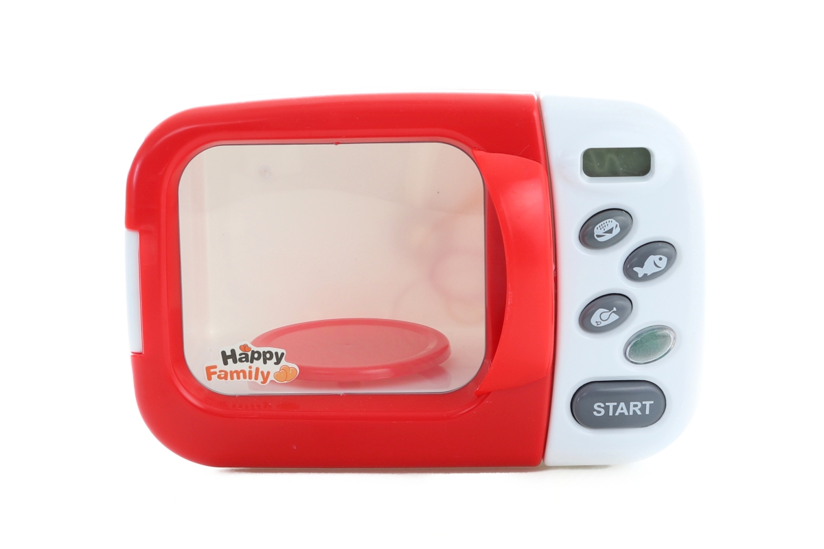 Plastová mikrovlnka na baterie. Mikrovlnka svítí, otáčí se jí vnitřní talíř a vydává zvuky. Rozměr mikrovlnky cca 21 x 13 cm. Rozměry balení cca 28 x ..