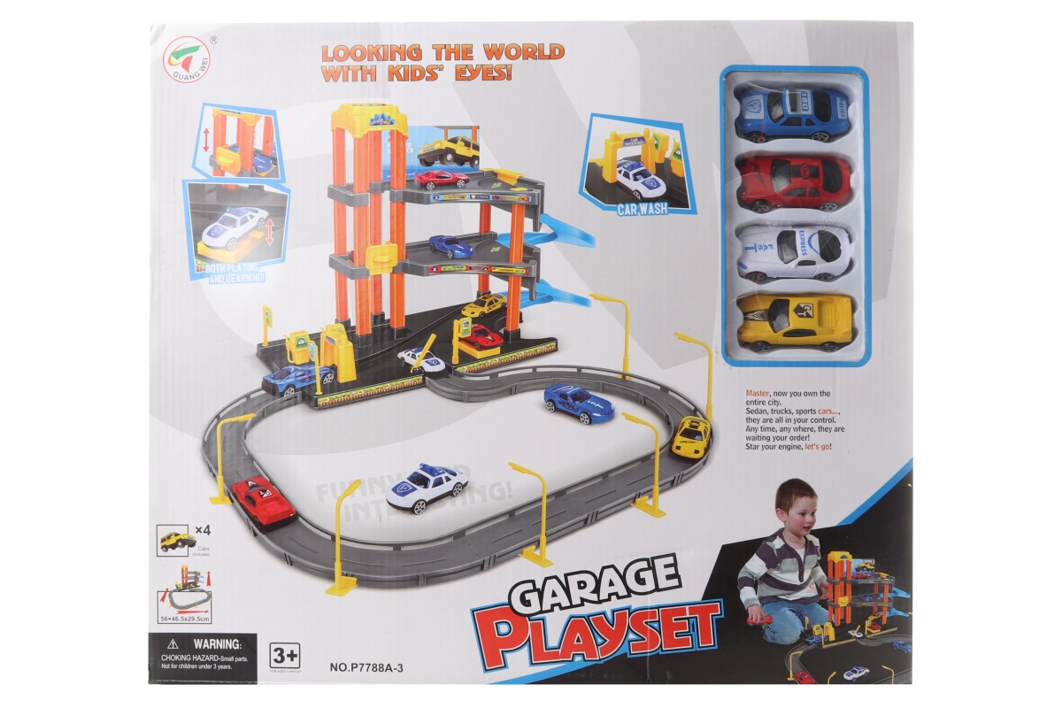 Plastová garáž s autíčky. Balení obsahuje 4 autíčka. Rozměry balení cca 43,5 x 38 x 7,5 cm. Věk 3+..