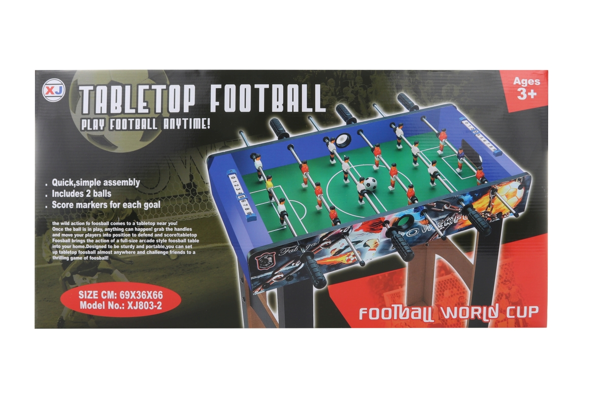 Stolní fotbálek v kvalitním dřevěném provedení. Protiskluzová madla. Každá branka je vybavena ručním počítadlem gólů. Rozměry rozloženého fotbálku cca 69 x 36 x 66 cm. Baleno v krabici o rozměrech cca 70 x 35,5 x 7 cm. Věk 3+