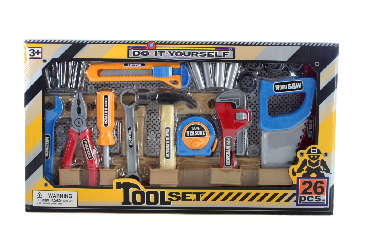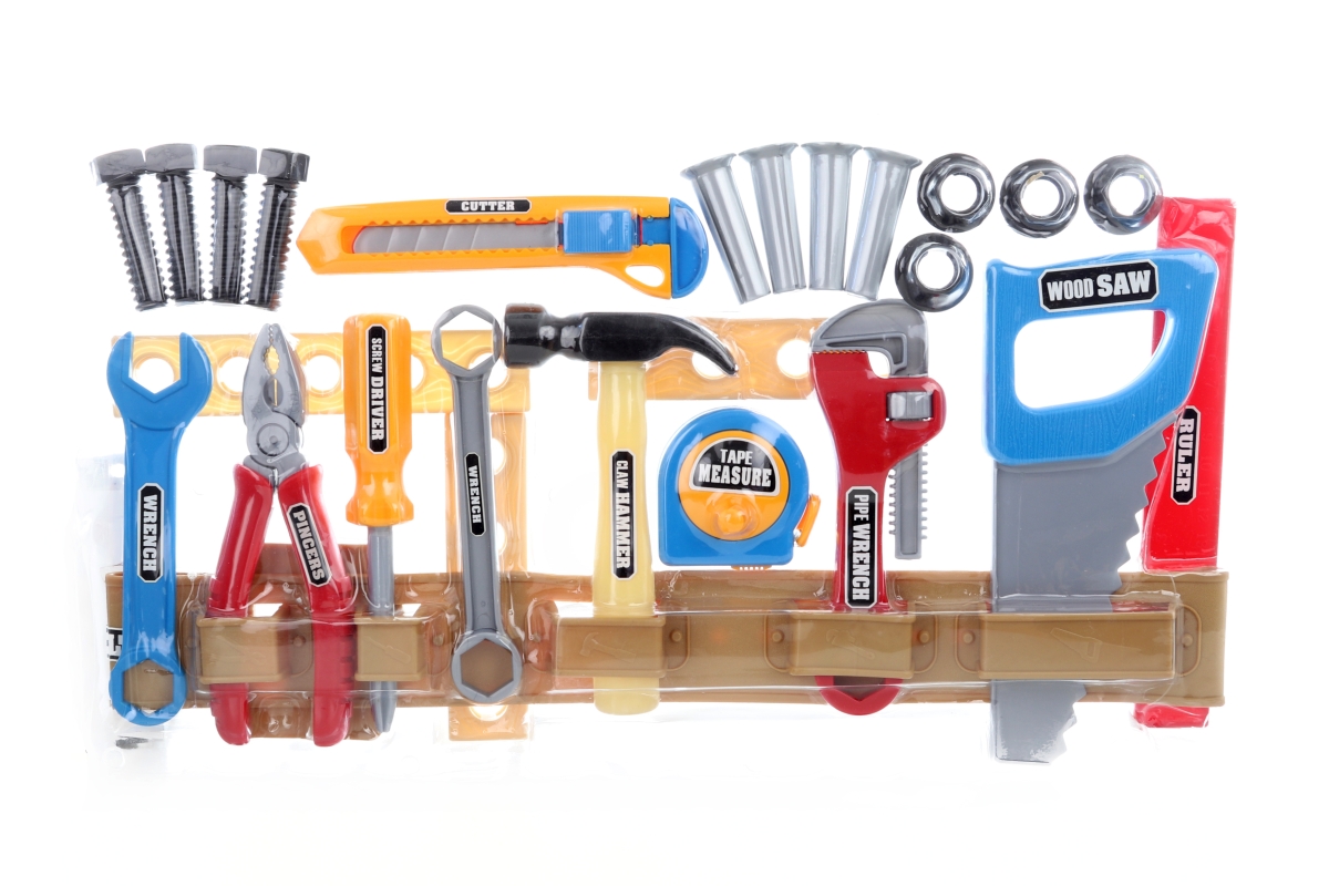 Plastová sada nářadí pro malého kutila. Obsahuje pilku, kleště, kladívko, hasák, šroubovák, klíč, nožík, pás na uspořádání a další nářadí. Rozměry bal..