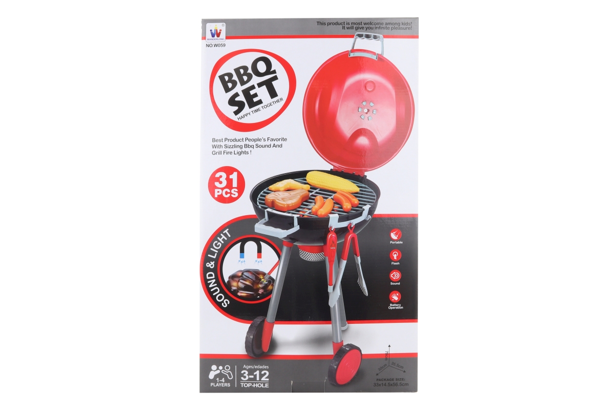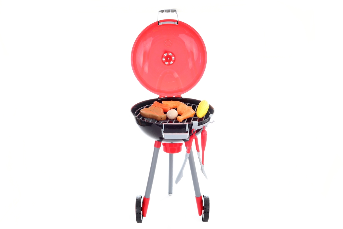 Plastový gril velký s doplňky a jídlem na grilování. Po zapnutí uhlíků v grilu začnou vydávát zvuk a svítit. Napájení na 3AAA baterie (nejsou součástí..