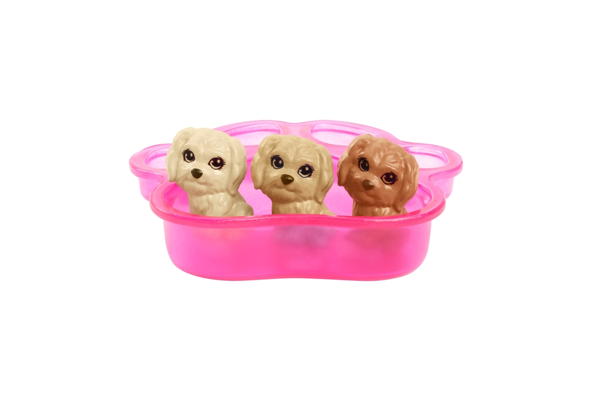 Herní set Barbie® Novorozená štěňátka umožňuje fantazii prozkoumat péči o domácí mazlíčky! Tento herní set obsahuje fenku, která je připravena porodit..
