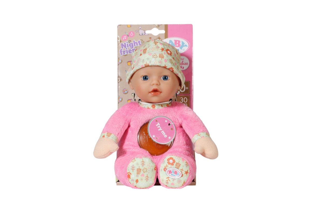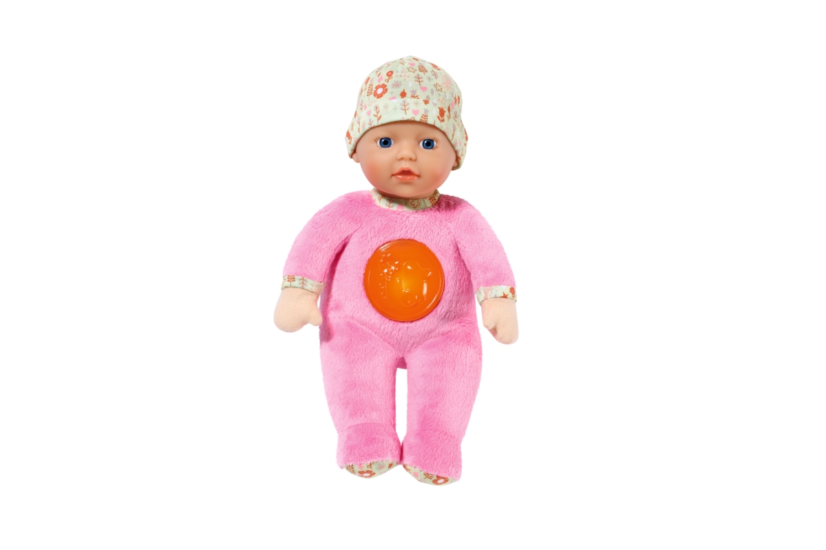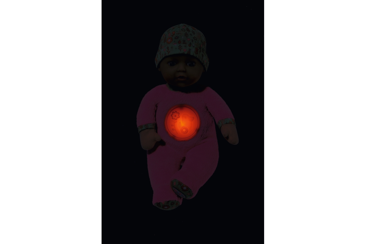 Díky rozkošné panence „Svítí ve tmě“ se z usínání stane dětská hra. Látkovou panenku ve velikosti 30 cm můžete umístit do kolébky nebo do dětské postýlky těch nejmenších dětiček už od narození. Má měkké tělíčko a rozkošné plyšové dupačky. Stisknutím kolečka na bříšku se aktivuje noční světýlko s kačenkou a rozezní se uklidňující melodie. Měkkou vinylovou hlavičku panenky chrání čepička s roztomilým potiskem. Různé textury materiálů na panence povzbuzují malé děti k hraní a objevování. A když se děti rozhodnou ručičku nebo nožičku panenky použít jako kousací kroužek, panenka se dá jednoduše vyprat v ruce, stačí z ní jen vyjmout zvukový modul. Napájení na 2xAAA baterie (nejsou součástí balení). Věk 0+