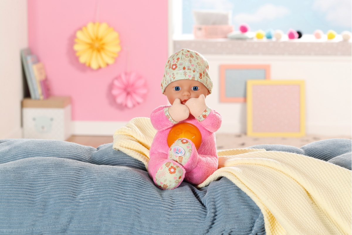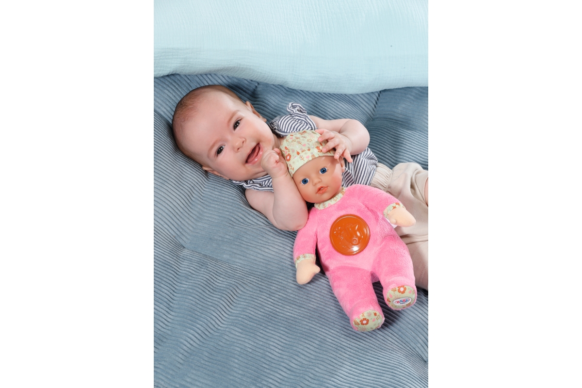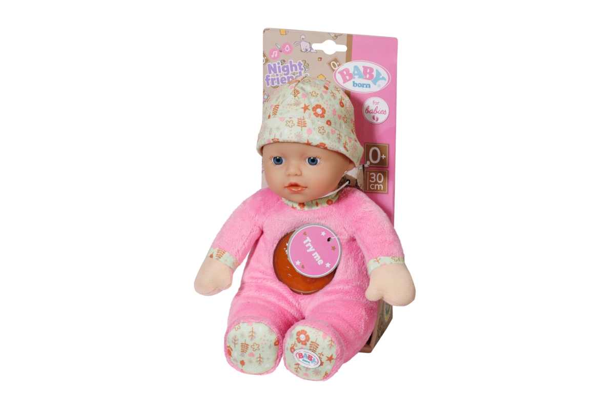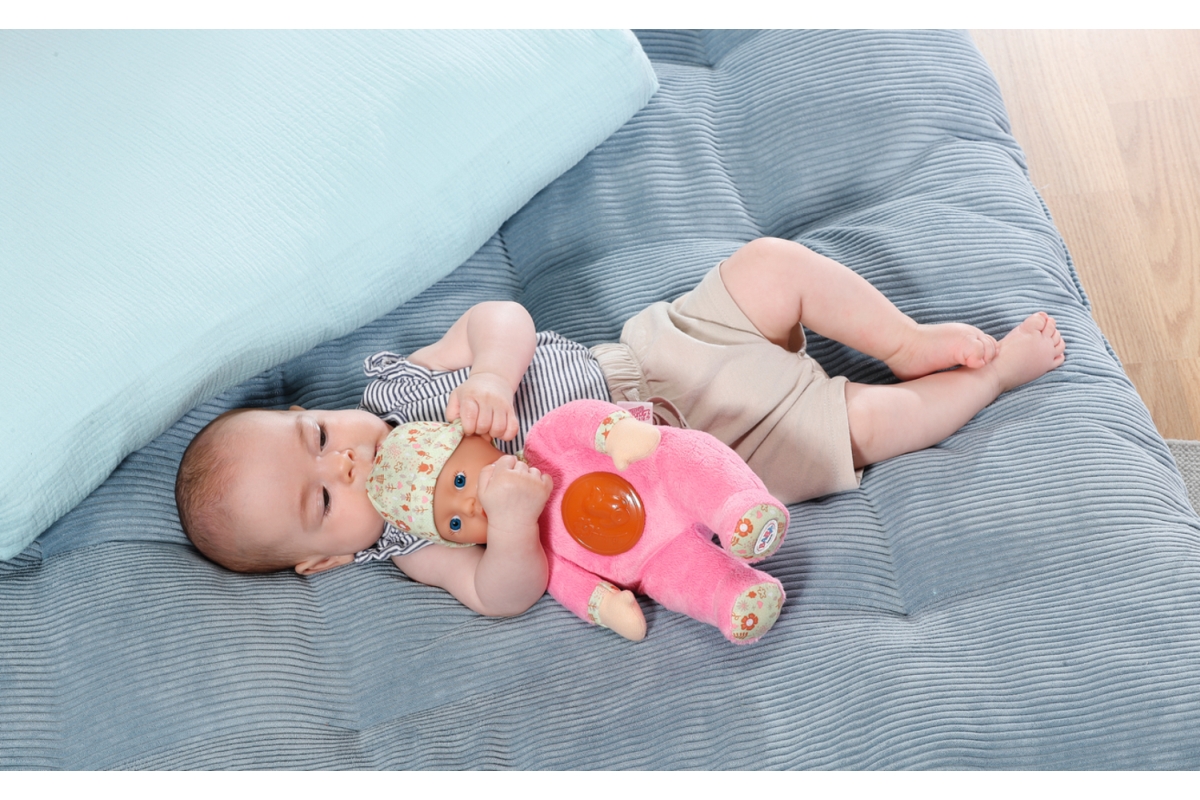 Díky rozkošné panence „Svítí ve tmě“ se z usínání stane dětská hra. Látkovou panenku ve velikosti 30 cm můžete umístit do kolébky nebo do dětské postýlky těch nejmenších dětiček už od narození. Má měkké tělíčko a rozkošné plyšové dupačky. Stisknutím kolečka na bříšku se aktivuje noční světýlko s kačenkou a rozezní se uklidňující melodie. Měkkou vinylovou hlavičku panenky chrání čepička s roztomilým potiskem. Různé textury materiálů na panence povzbuzují malé děti k hraní a objevování. A když se děti rozhodnou ručičku nebo nožičku panenky použít jako kousací kroužek, panenka se dá jednoduše vyprat v ruce, stačí z ní jen vyjmout zvukový modul. Napájení na 2xAAA baterie (nejsou součástí balení). Věk 0+