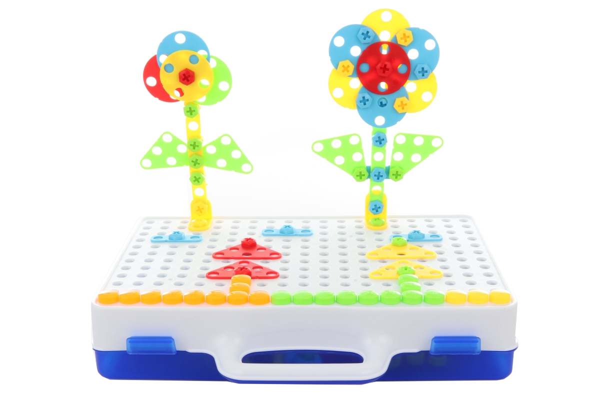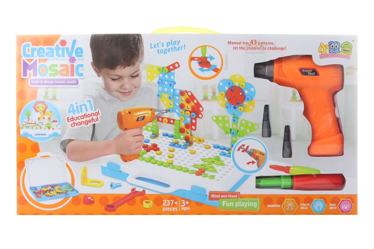 Šroubovací stavebnice s vrtačkou. Balení obsahuje celkem 237 dílů, vrtačku, šroubovák a praktický plastový kufřík, do kterého lze díly uschovat. Součástí balení je také návod. Napájení vrtačky je na 2 AA baterie (nejsou součástí balení). Rozměry balení cca 46 x 24,5 x 7 cm. Věk 3+