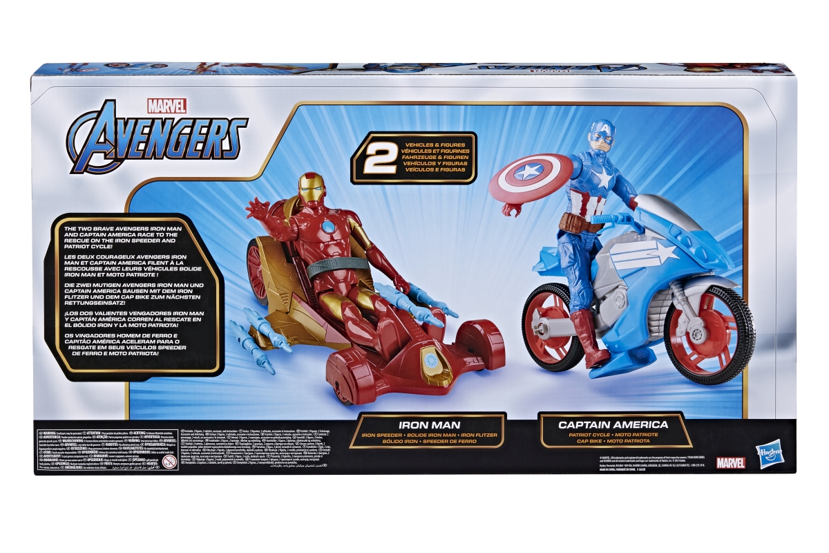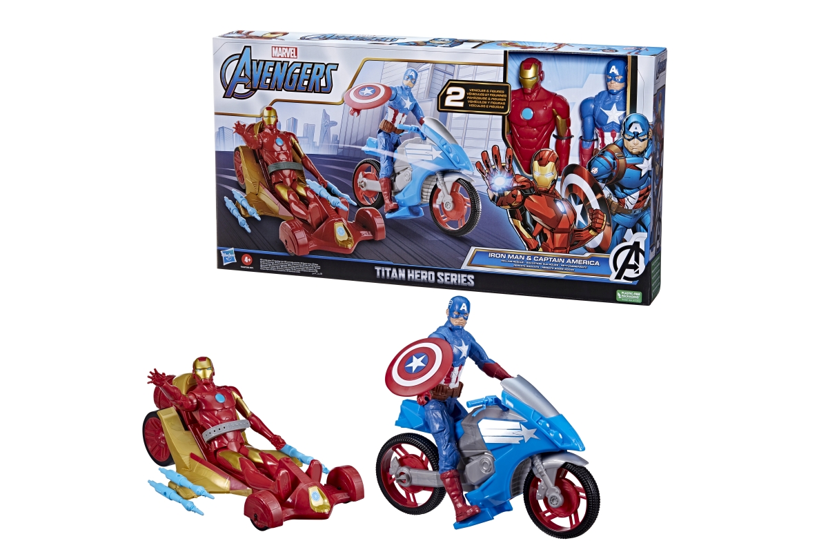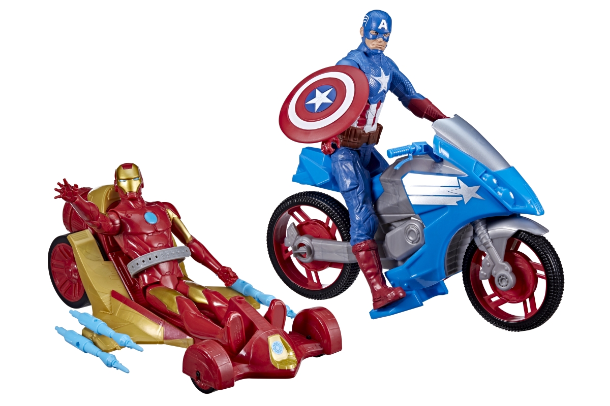 Sada figurek Avengers Kapitán Amerika a Iron man. Balení obsahuje 2 figurky o velikosti cca 30 cm, motorku a vozidlo. Figurky mají pohyblivé ruce a no..