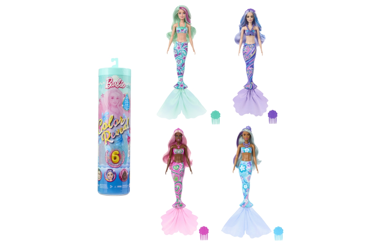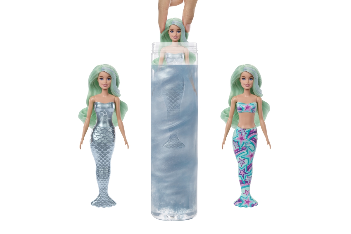 Panenky Barbie® Color Reveal™ mořská panna přinášejí zážitek z rozbalování plného překvapení (je jich hned šest)! Děti v této sérii mořských panen najdou jednu ze čtyř jedinečných panenek - každá má dlouhé vlasy s výrazným proužkem měnícím barvu. Kterou panenku odhalíte? Odstraňte vnější vrstvu obalu, otevřete tubu a vytáhněte panenku Barbie®, která je pokrytá speciální vrstvou a nezapomeňte na sáčky s překvapením. Mezi doplňky najdete odnímatelnou ocasní ploutev, náhrdelník s mořskými přívěsky, čelenku a hřeben s mušlemi. K uložení těchto a dalších dílků použijte tubu. Děti je mohou sbírat všechny a bavit se jejich kombinováním. Panenky se prodávají samostatně, v závislosti na dostupnosti. Panenky nemohou stát samostatně. Barvy a provedení se mohou lišit. Věk 3+