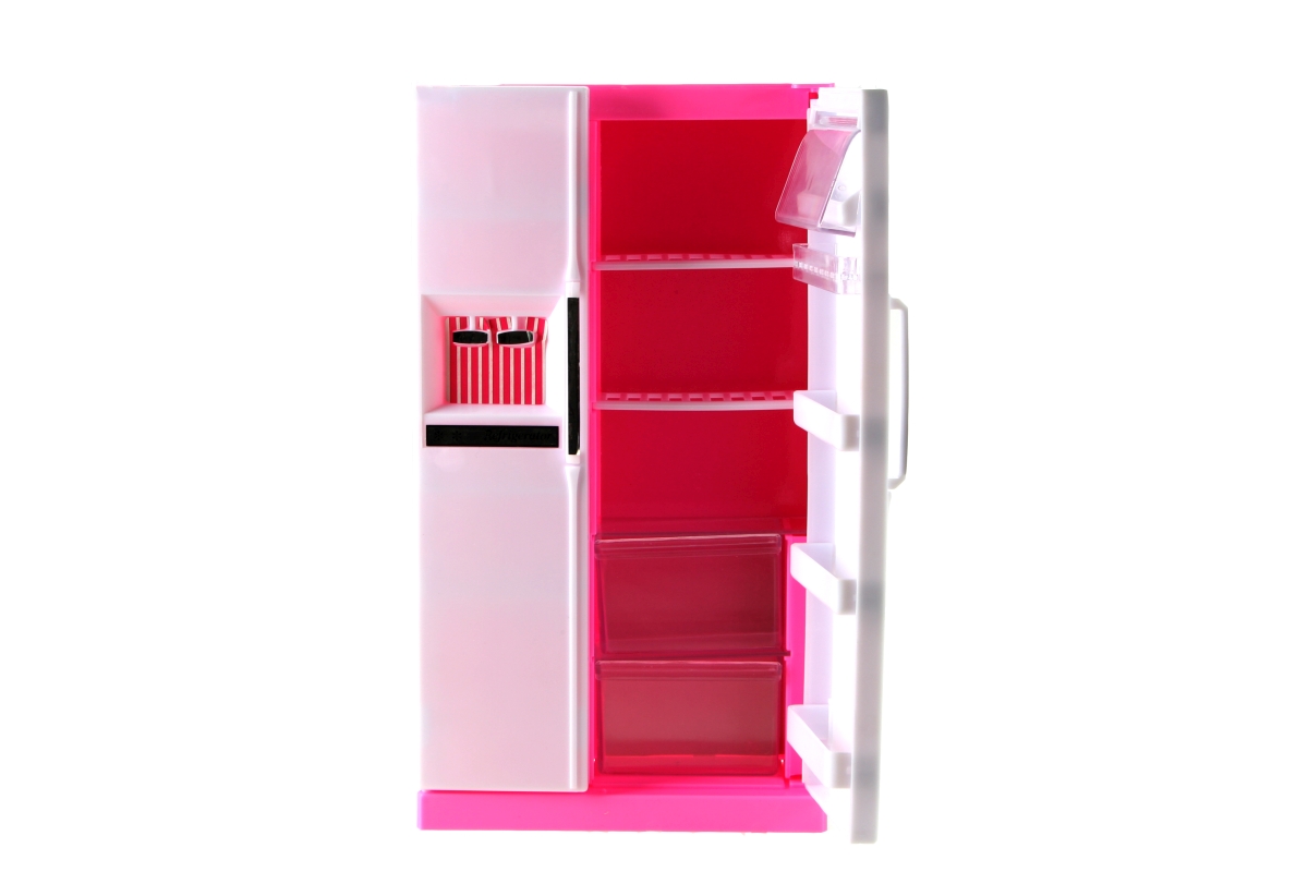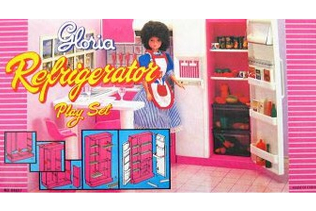 Glorie Lednice - balení obsahuje plastovu lednici o rozměru cca 17,5 cm X 6 cm X 31 cm rozměr uzavřené lednice.Uvnitř přihrádky,poličky a šuplíčky na ..