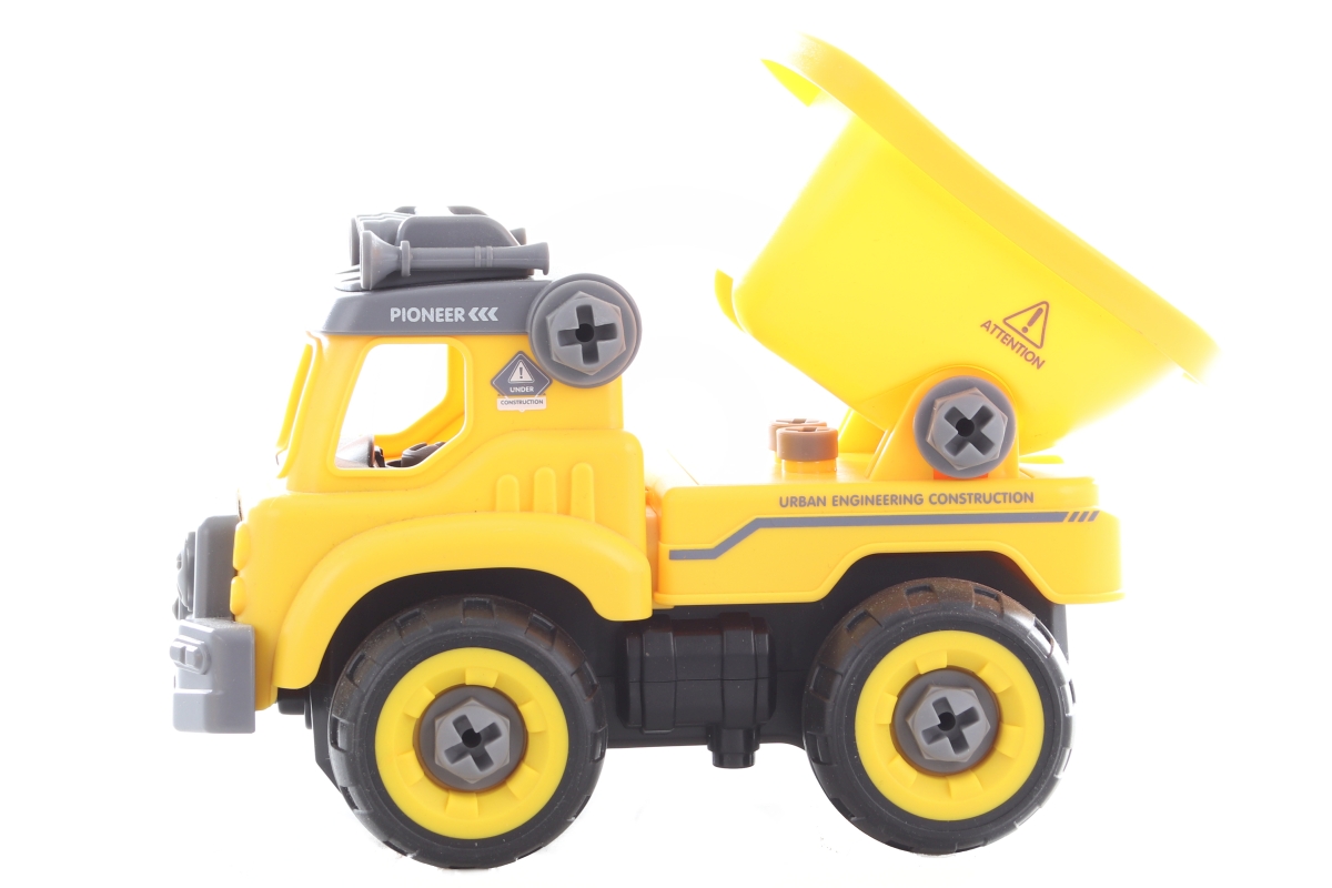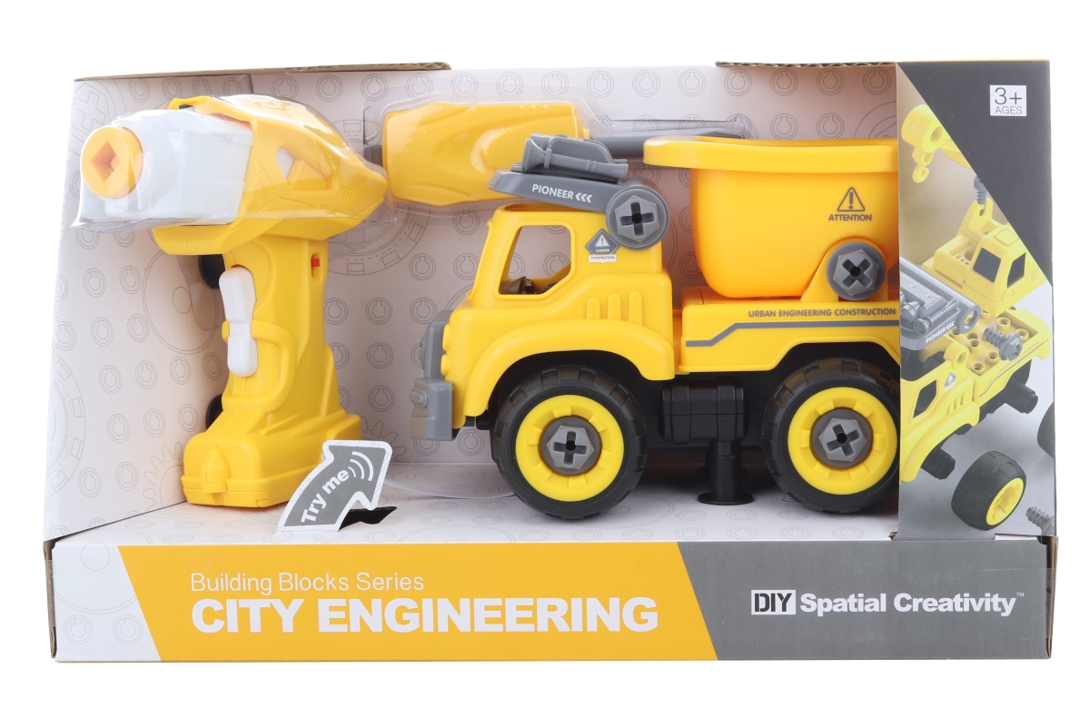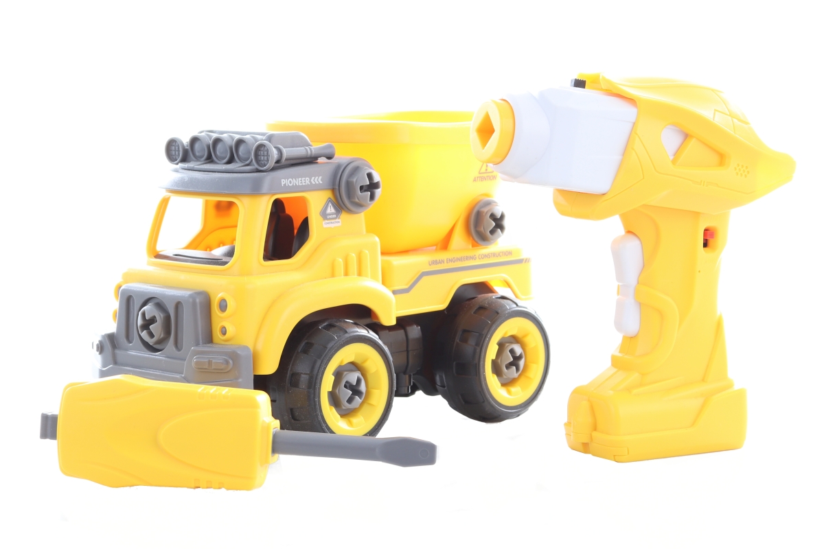 Šroubovací sklápěčka na dálkové ovládání. Auto lze sešroubovat pomocí přiloženého šroubováku nebo vrtačky. Z vrtačky lze vyndat motorek, který se vloží do auta a to poté jezdí pomocí ovládání dopředu a dozadu. Auto také vydává zvuky. Napájení na 4 AA baterie (nejsou součástí) a na 3 AG13 baterie (jsou součástí). Rozměry auta cca 20 x 12,5 x 11 cm. Rozměry balení cca 33 x 19,5 x 13,5 cm. Věk 3+