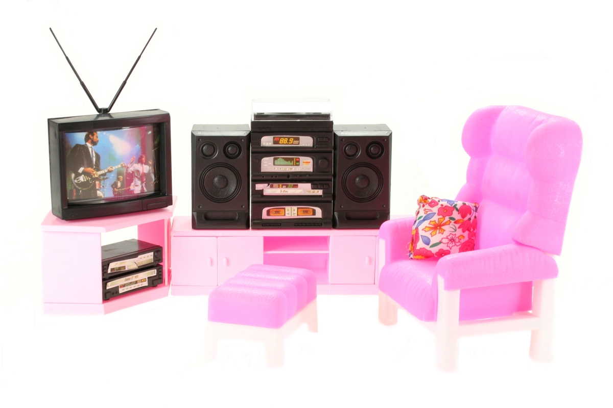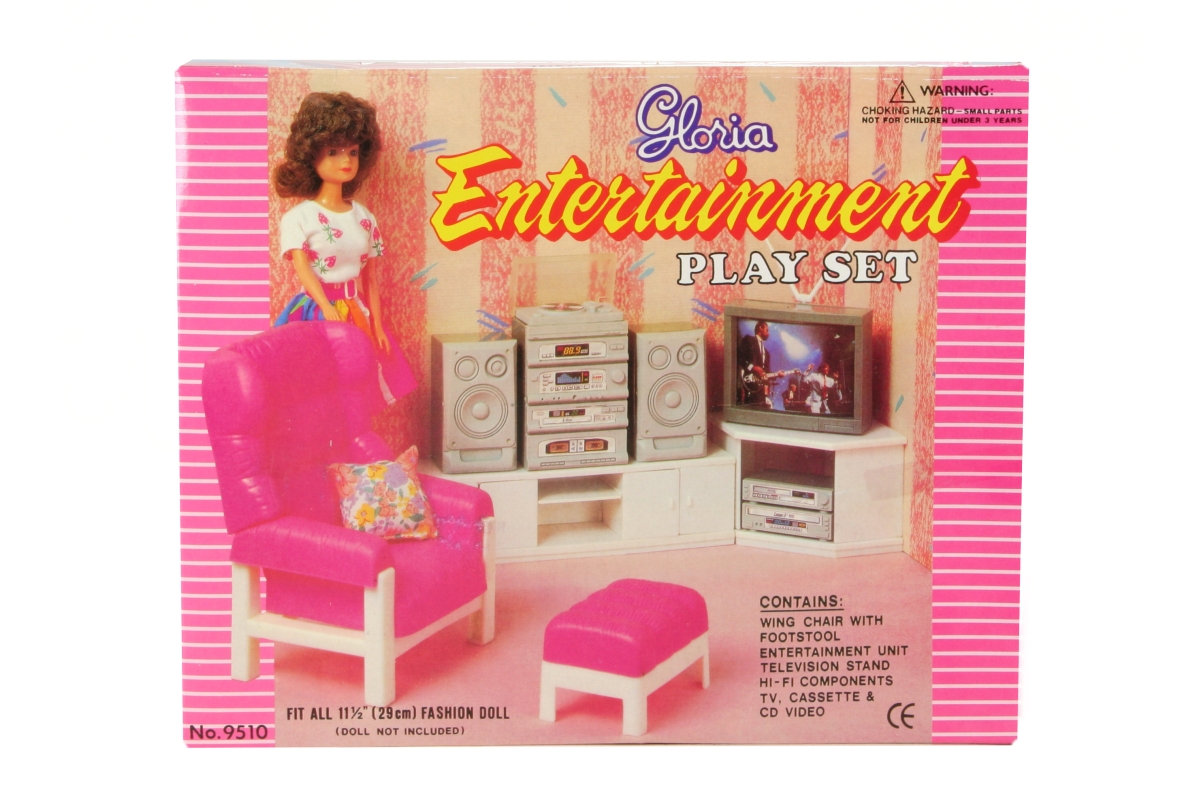 Glorie Obývací stěna obsahuje plastové křeslo o rozměrech cca 18 cm x 9 cm x 13 cm,podnožku cca 9 cm x 5 cm x 5,5 cm, obývací stěnu s dvířkami cca 21,5 cm x 6 cm x 4,8 cm, rohovou skříňku 10 x 10 x 8 cm, televizi s anténou 10 x 8 x 6 cm, video 6,5 x 4 x 3,5 cm, hifi soupravu s reproduktory 17 x 4 x 10,5 cm. Panenka není součástí balení.Věk 3+
