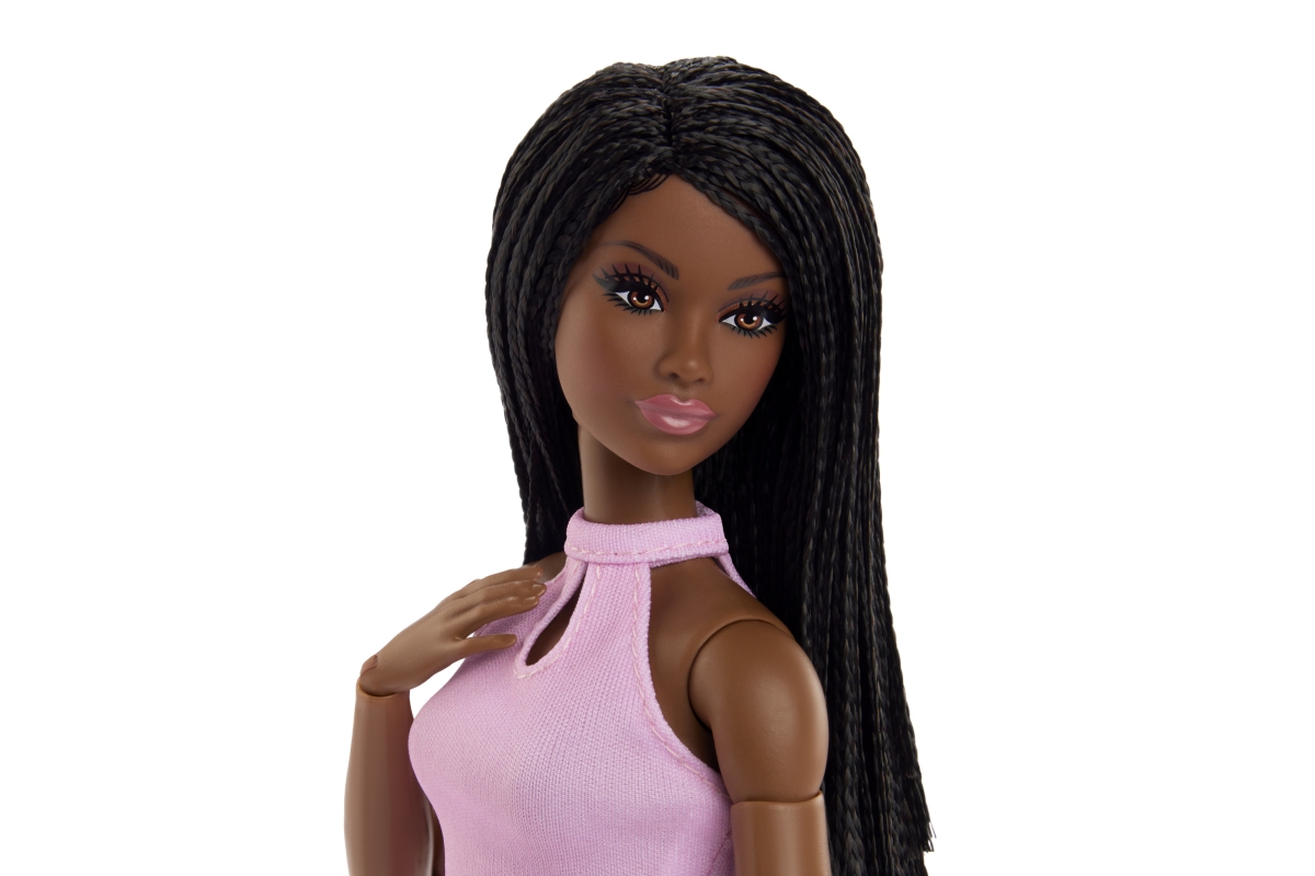 Panenka Barbie® Looks™ s copánky v růžovém outfitu. Tato módní panenka je vždy připravena na fotografování a inspiruje stylistku, která se v dětech skrývá. Nejnovější řada je plná pastelových a metalických barev a inspiruje se stylem 90. let. Tato polohovatelná panenka Barbie® Looks™ s vlnitými černými vlasy má na sobě dvoudílný obleček s botami nad kolena.