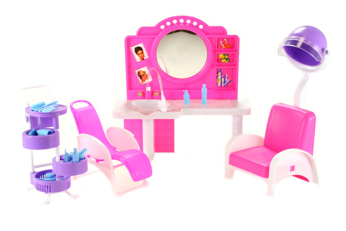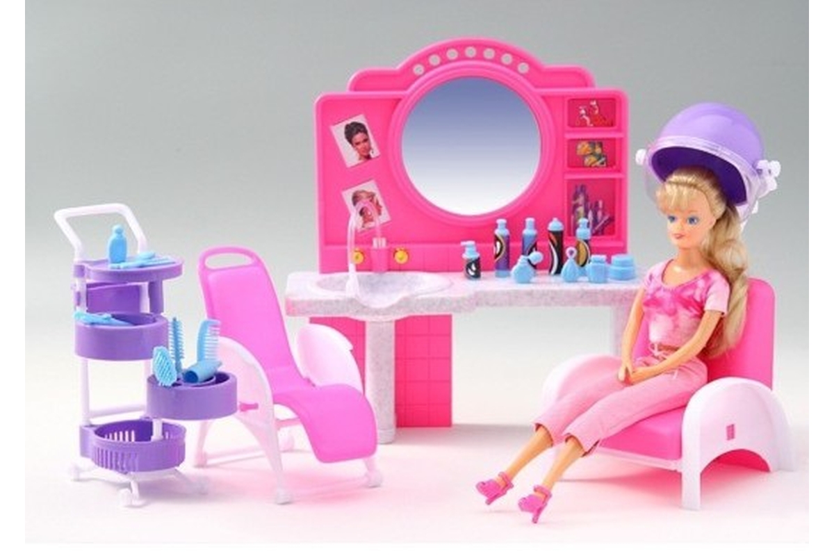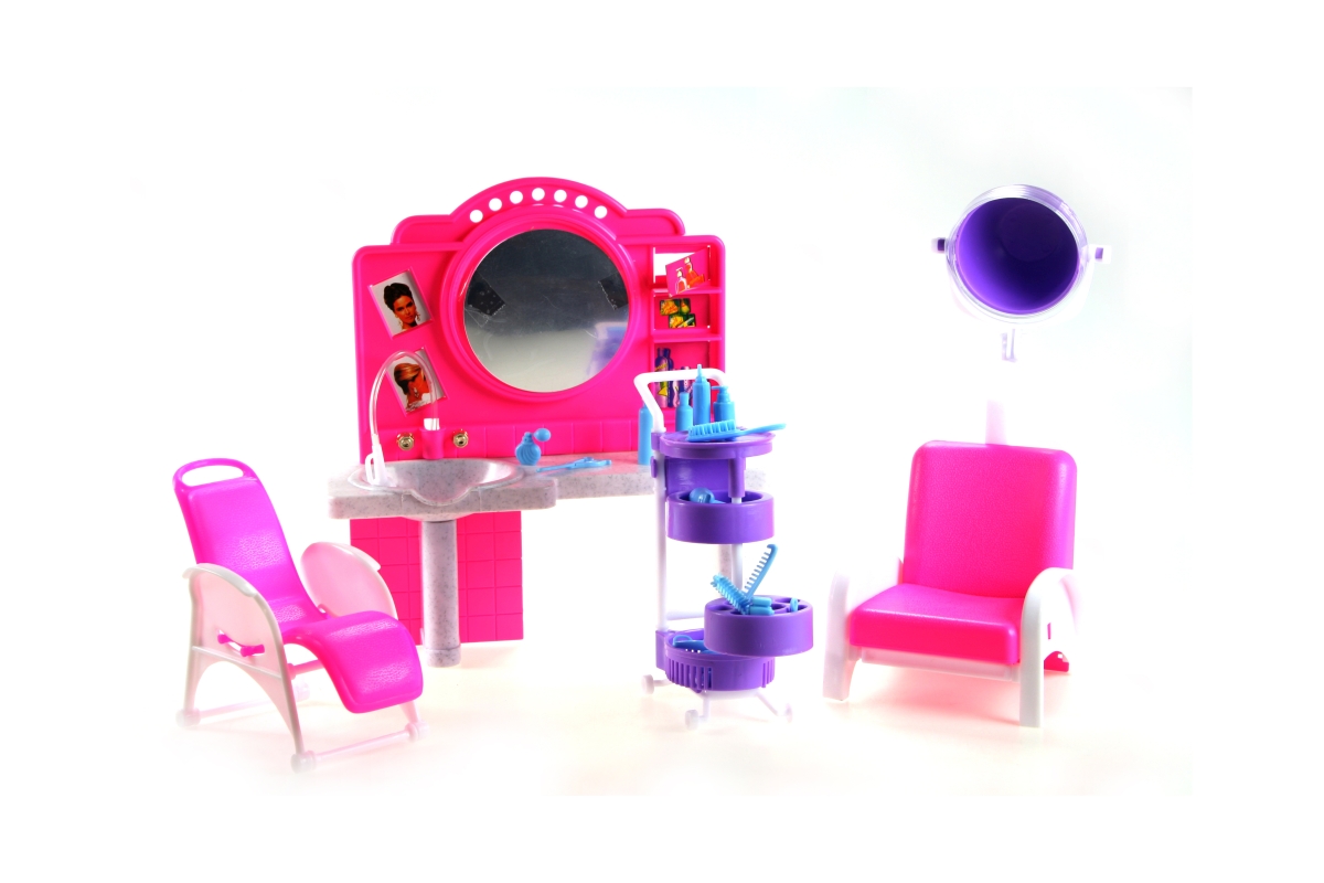Glorie Kadeřnický salon obsahuje kadeřnickou toaletku se zrcadlem,umyvadlem a odkládací polchou o rozměrech cca 25 cm X 8 cm X 27 cm, kadeřniské křeslo cca 8 cm X 13 cm,kadeřnické křeslo se sušákem na vlasy o výšce cca 26 cm - není funkční,vozík s přihrádkami a spoutou doplňků pro kadeřnice - hřebínky,kartáče,lahvičky.Vyrobeno z plastu.Panenka není spučástí balení.Věk 3+