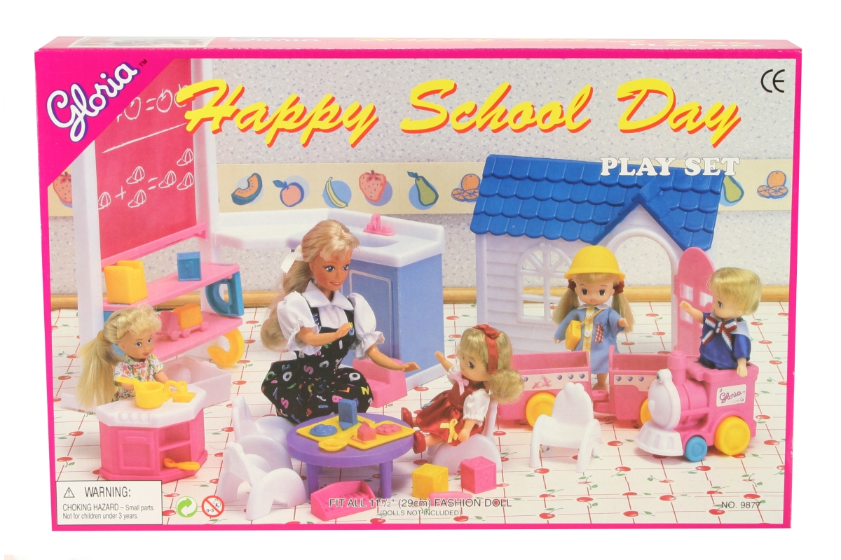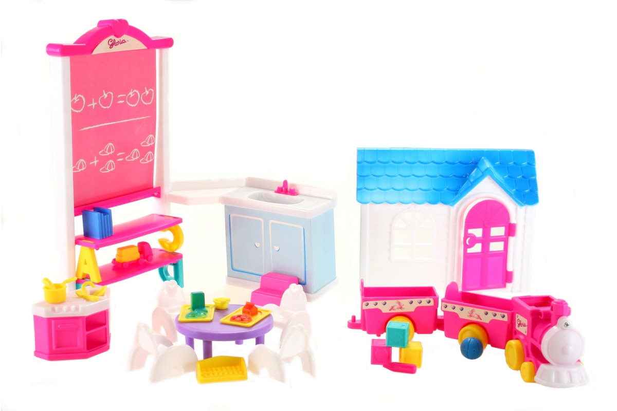 Glorie školka obsahuje velkou tabuli s policemi 28,5 x 16 cm, která se napojuje na umyvadlo 11,5 x 11 cm. Dále domeček s otevíracími dvířkami, 20 x 5 x 6 cm. 4 dětské židličky 4,3 x 4,3 x 5 cm, dětský stoleček, malý dětský vařič 8 x 4,6 cm, dětský vláček se třemi vagony délůka 25,5 cm, šířka cca 4,8 cm. A teké plno dětskávh doplňků, hraček a nádobí. Panenky nejsou součástí balení. Rozměry balení cca 36 x 23,5 x 6,5 cm. Věk 3+.