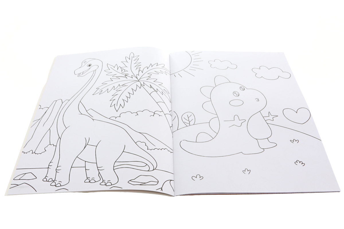 Omalovánky s motivy dino. Sešit obsahuje 12 listů s omalovánkami a 2 archy se samolepkami. Rozměry 21,5x28,5 cm. Výrobek není hračka...