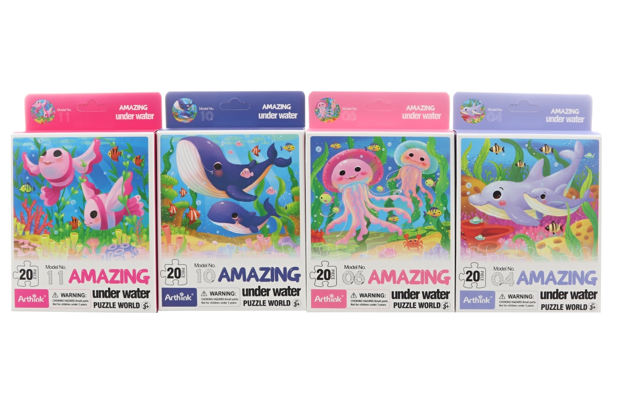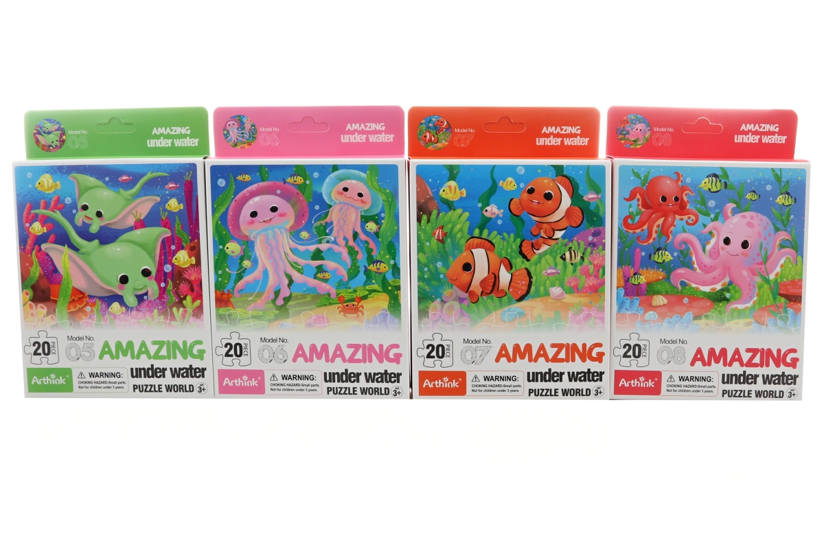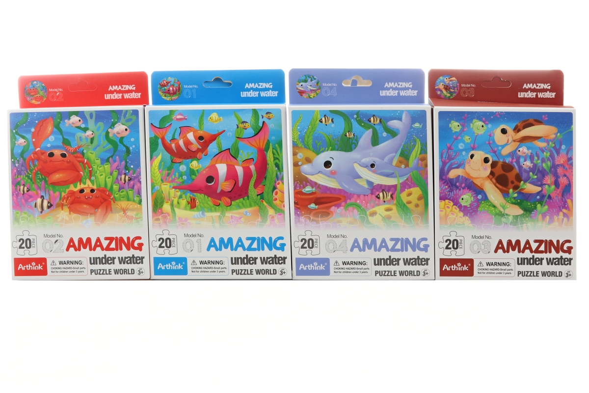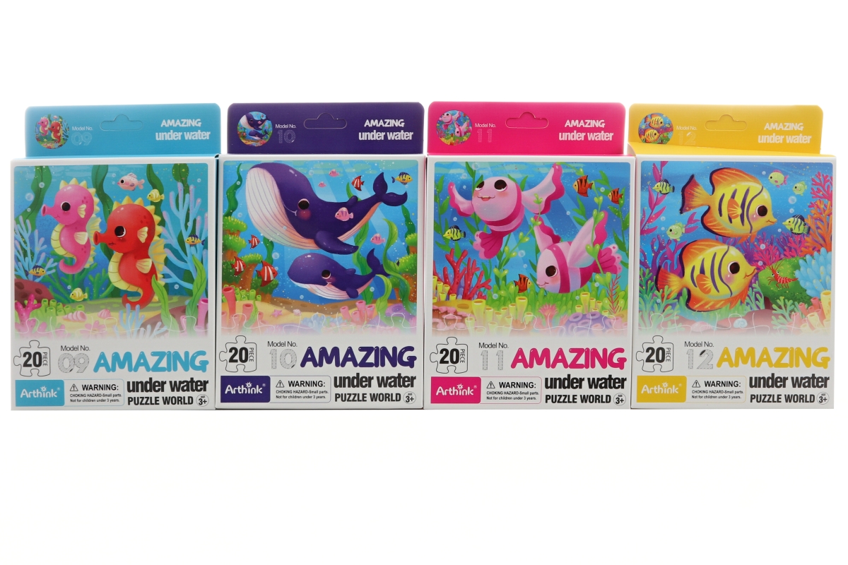 Puzzle s motivem mořského světa. 20 dílků. Velikost sestaveného puzzle 21x19 cm. 12 druhů - dodáváme dle skladové dostupnosti. Věk 3+..