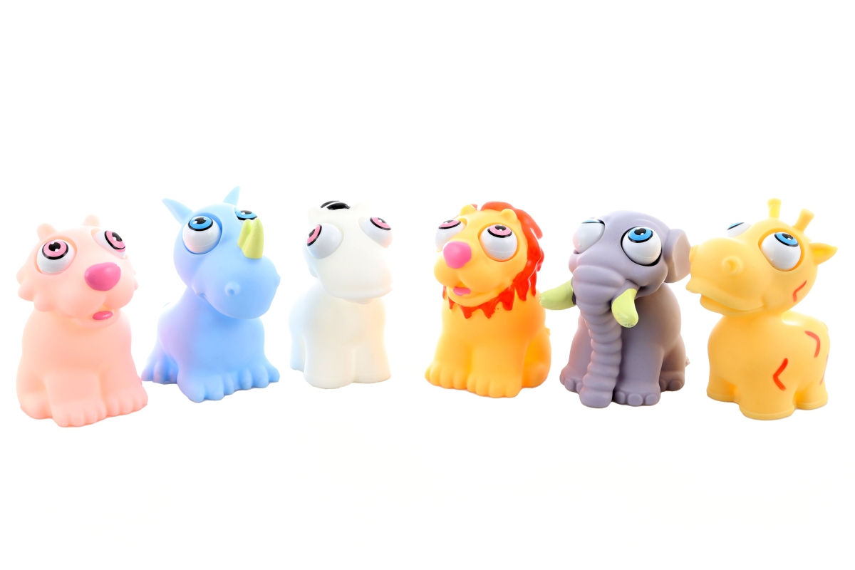 Mačkací zvířátka. Materiál měkký plast. Po zmačknutí zvířátko vykulí očka ven. Více barev - dodáváme dle skladové dostupnosti. Rozměry 7x8x4 cm. Věk 3..