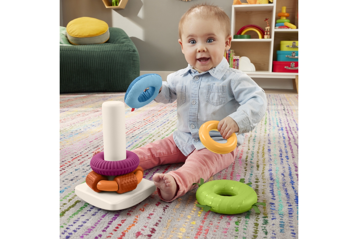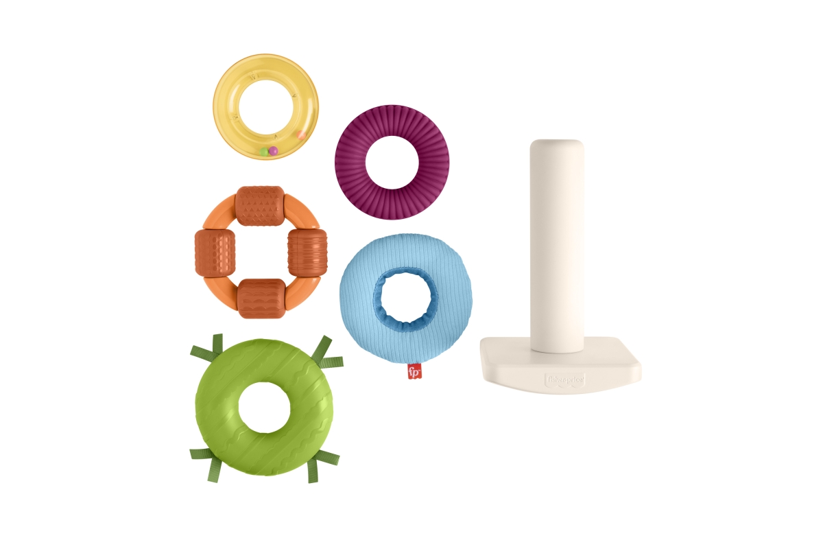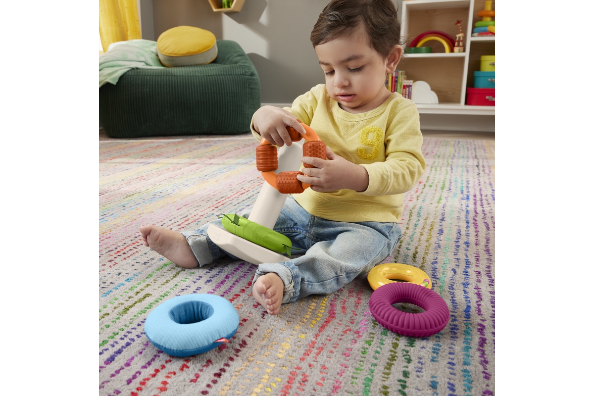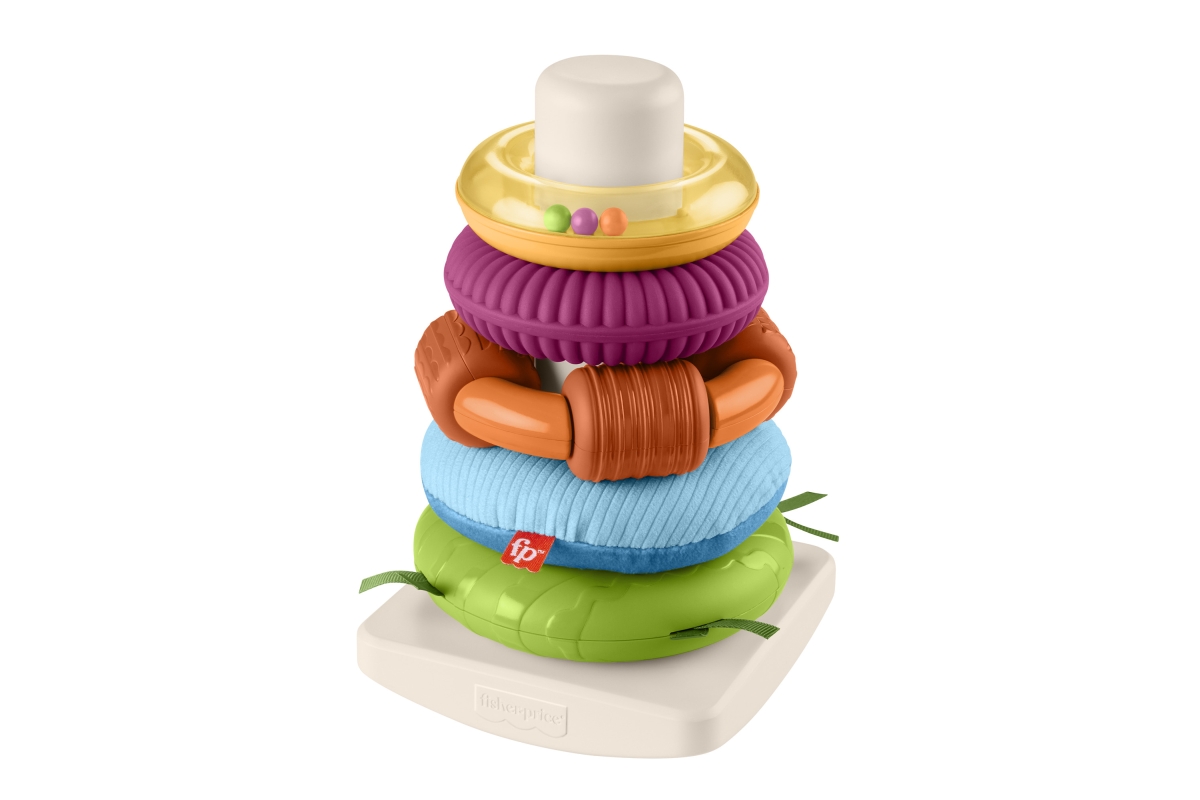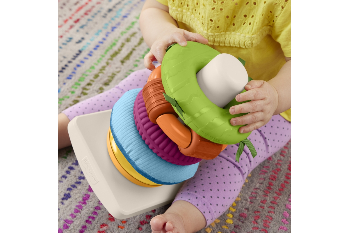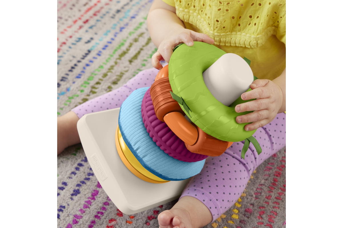 Senzorická hračka od Fisher-Price® přináší do klasického skládacího modelu nový prvek zábavy. Každý z 5 barevných kroužků má různé textury, látky a zn..