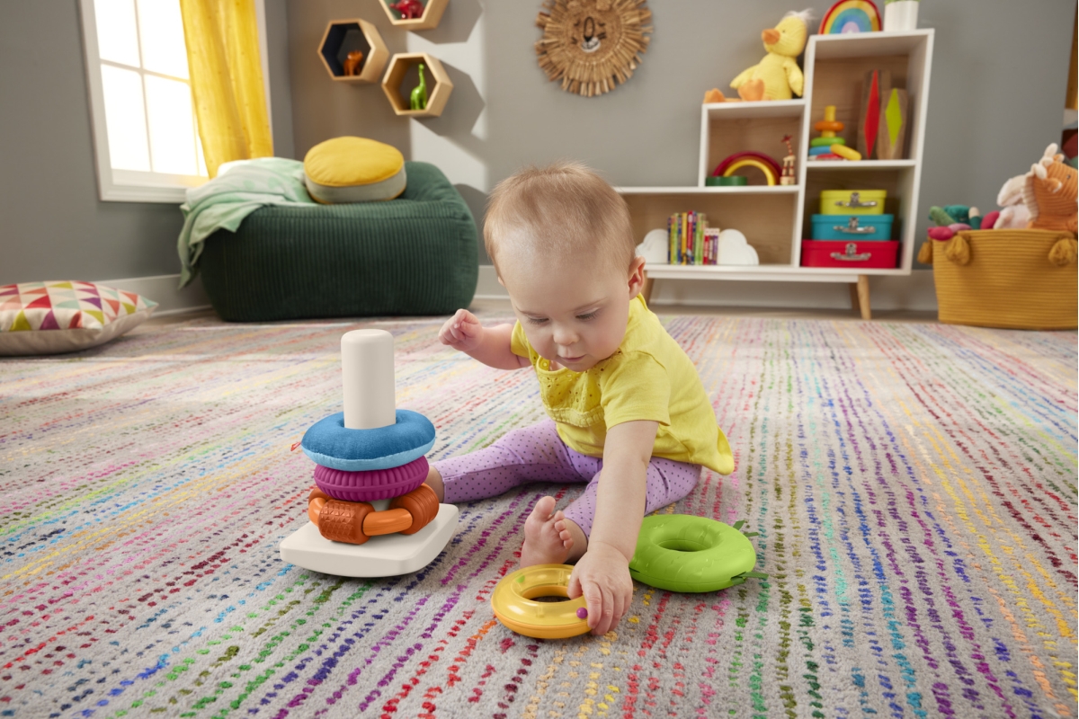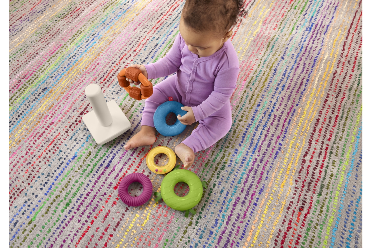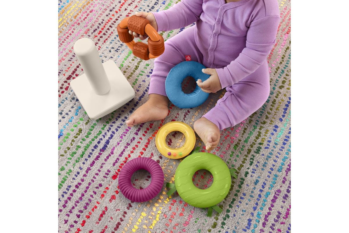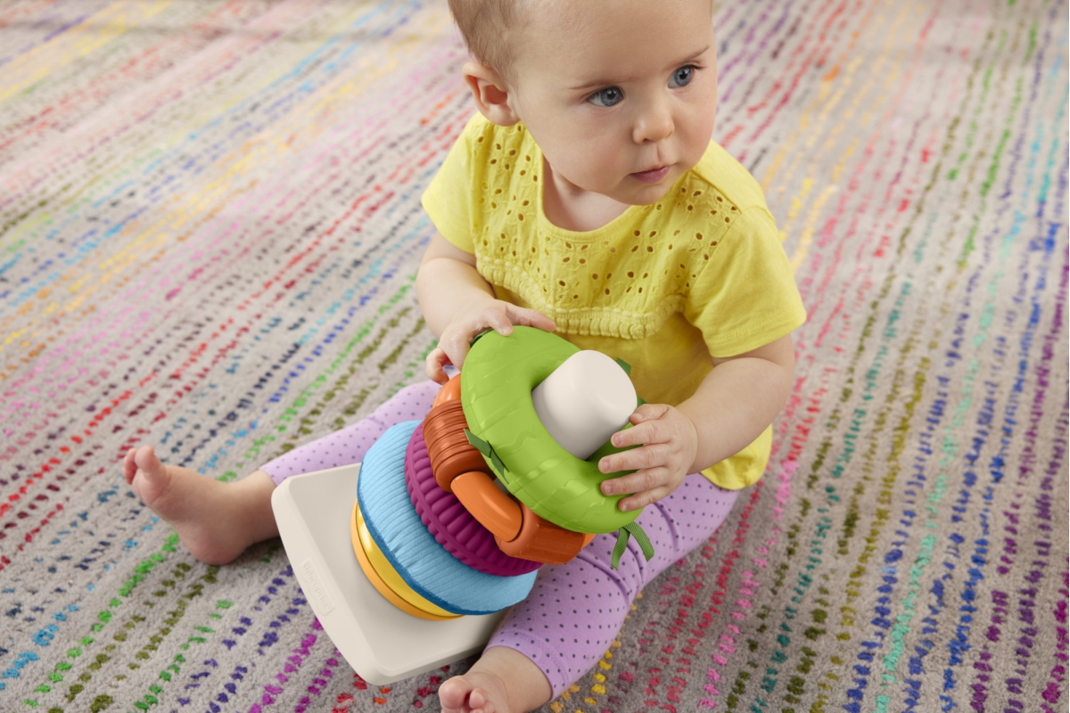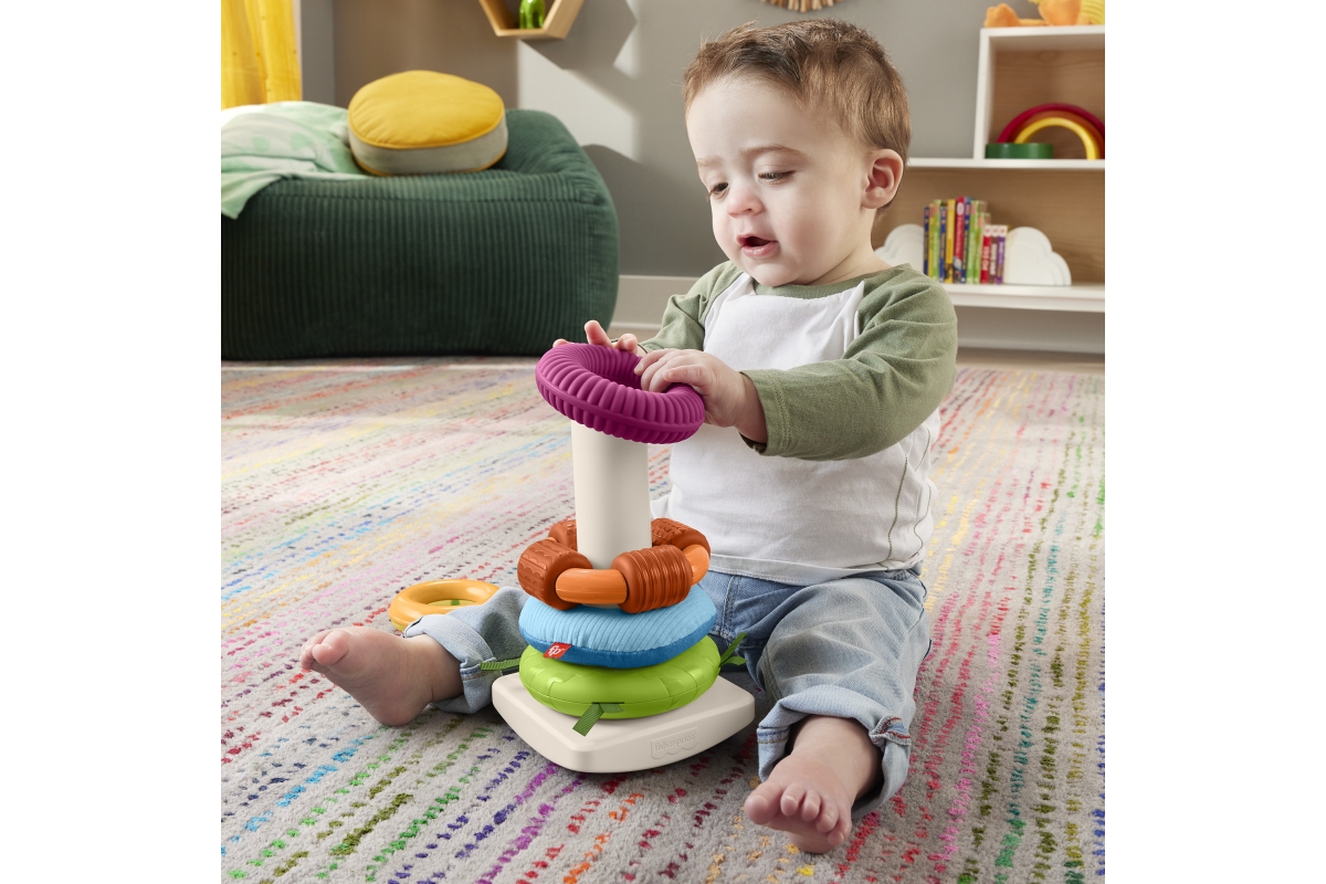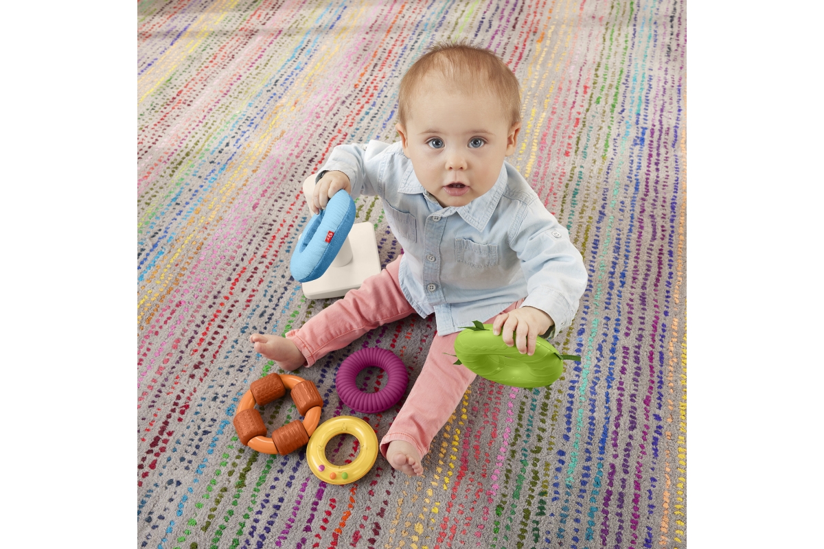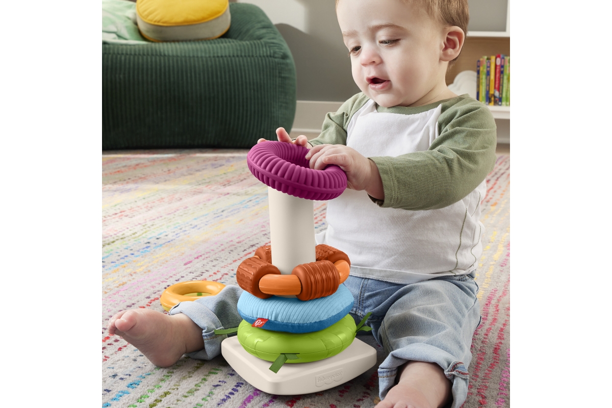 Senzorická hračka od Fisher-Price® přináší do klasického skládacího modelu nový prvek zábavy. Každý z 5 barevných kroužků má různé textury, látky a zn..