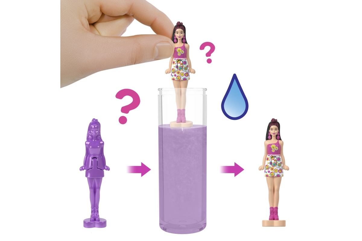 Vstupte do světa panenky Barbie® s Mini BarbieLandem - místem, kde si můžete i s malou hračkou představovat velké věci! S panenkami Mini BarbieLand Color Reveal vás čeká velká zábava i překvapení při rozbalování. Otevřete malou tubu, vytáhněte mini panenku pokrytou speciální barevnou vrstvou a použijte vodu podle návodu, abyste odhalili vzhled panenky - je to tak jednoduché! Kterou panenku odhalíte? Každá 4 cm velká panenka se ohýbá v pase a stojí na podstavci ve tvaru srdce, který se hodí do herních setů Mini BarbieLand (prodávají se samostatně). Fanoušci ve věku od 4 let budou chtít všechny tyto roztomilé panenky sbírat, aby si mohli postavit svůj vlastní mini svět! Každá panenka se prodává samostatně v závislosti na dostupnosti. Barvy a vzhled výrobku se mohou lišit.
