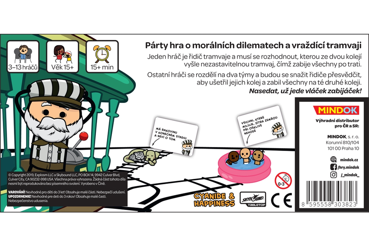 Párty hra o morálních dilematech a vraždící tramvaji. Jeden hráč je řidič tramvaje a musí se rozhodnout, kterou ze dvou kolejí vyšle nezastavitelnou tramvaj, čímž zabije všechny po trati. Ostatní hráči se rozdělí na dva týmy a budou se snažit řidiče přesvědčit, aby ušetřil jejich kolej a zabil všechny na té druhé koleji. Nasedat, už jede vláček zabijáček! Věk 15+