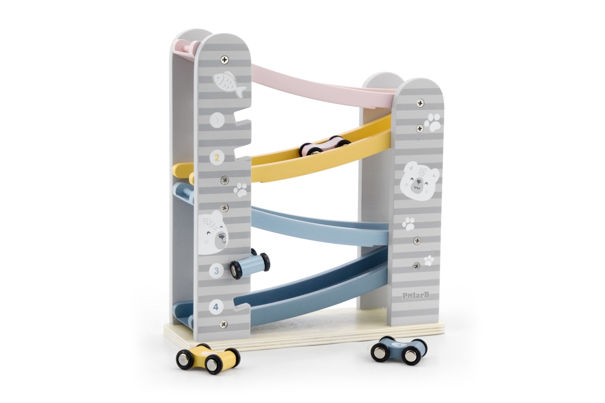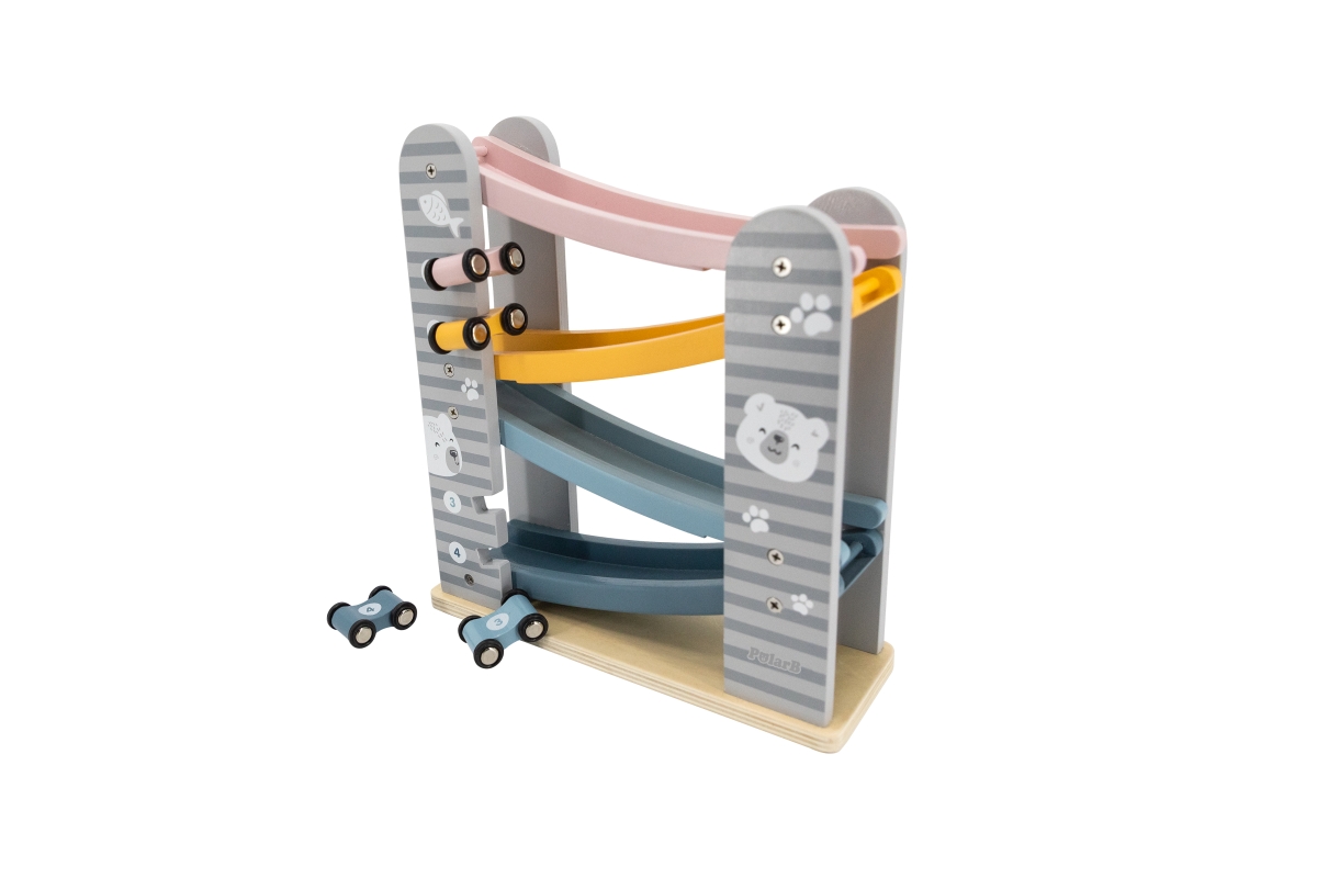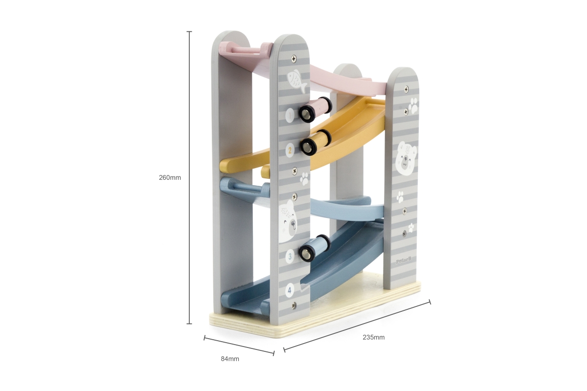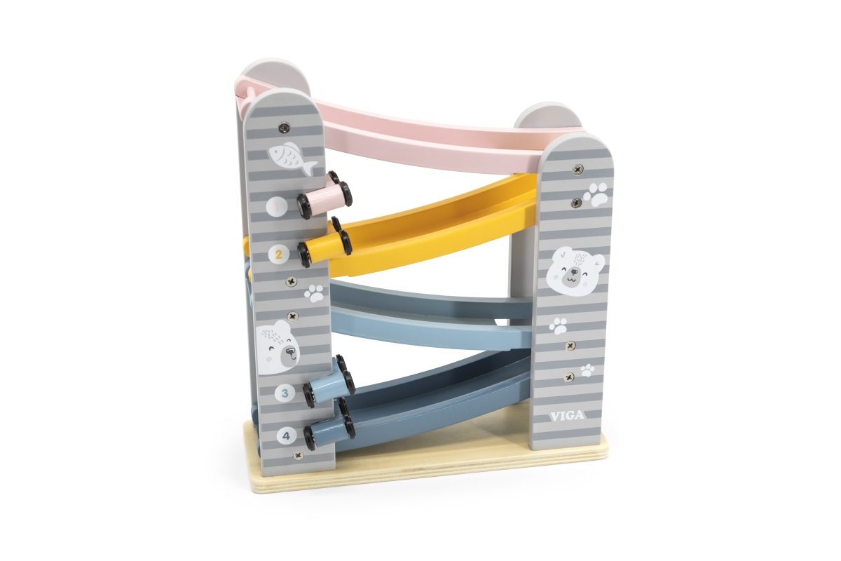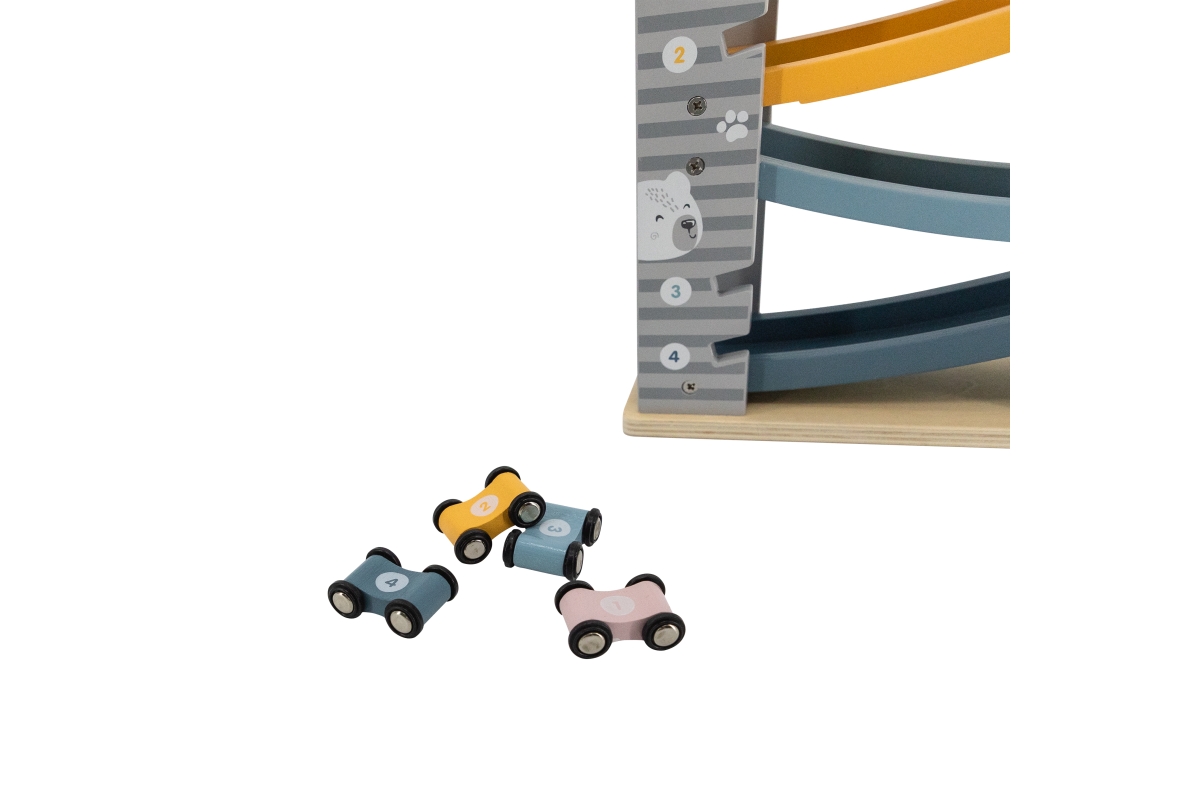 Dřevěná klouzačka s autíčky. Balení obsahuje 4 autíčka. Rozměry dráhy cca 26 x 23,5 x 8,5 cm. Rozměry balení cca 24,5 x 27,5 x 9,5 cm. Věk 18m+..