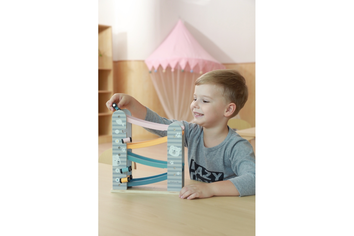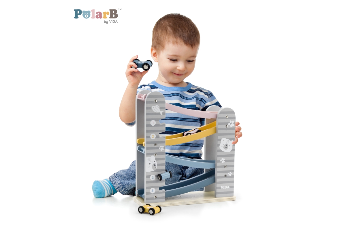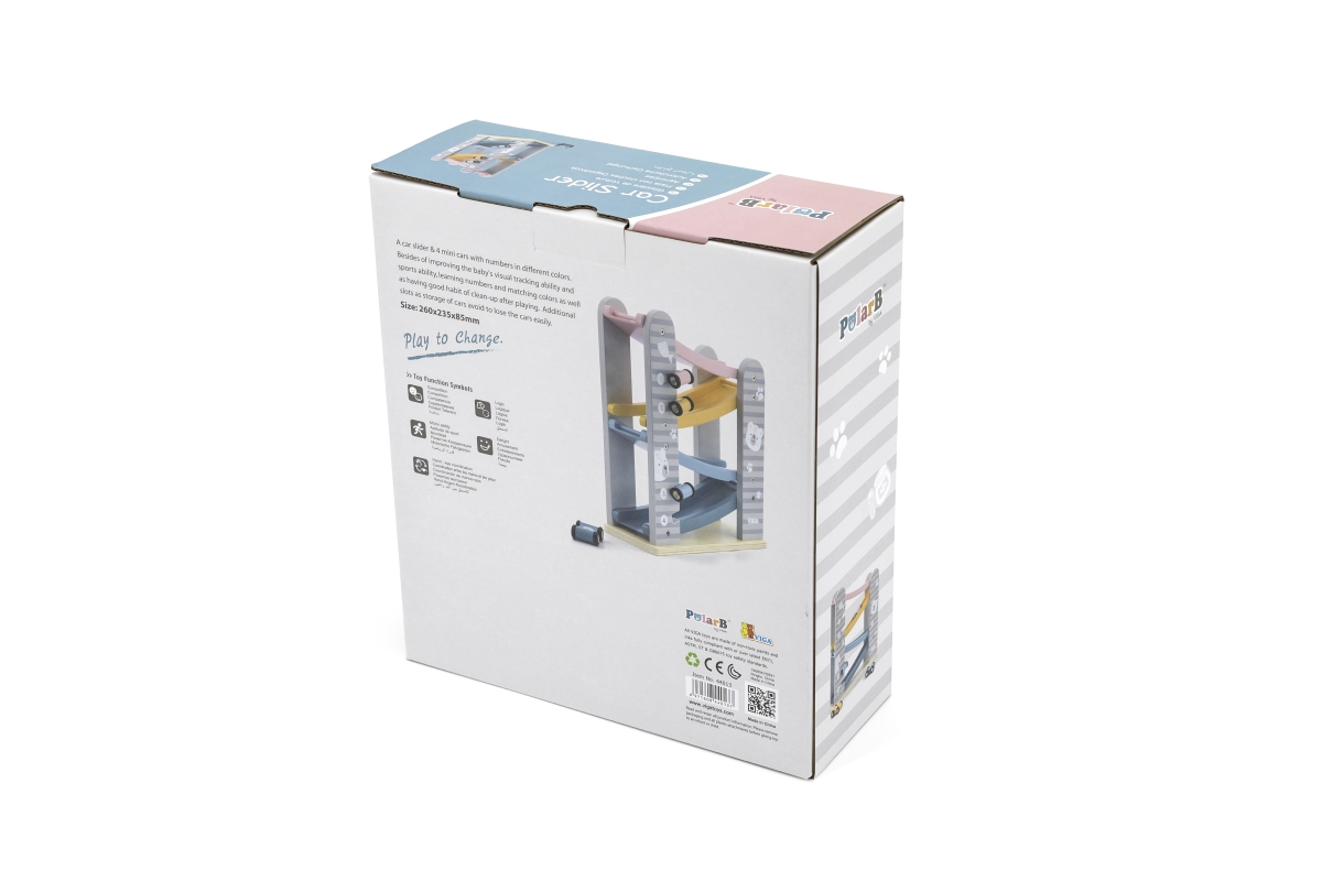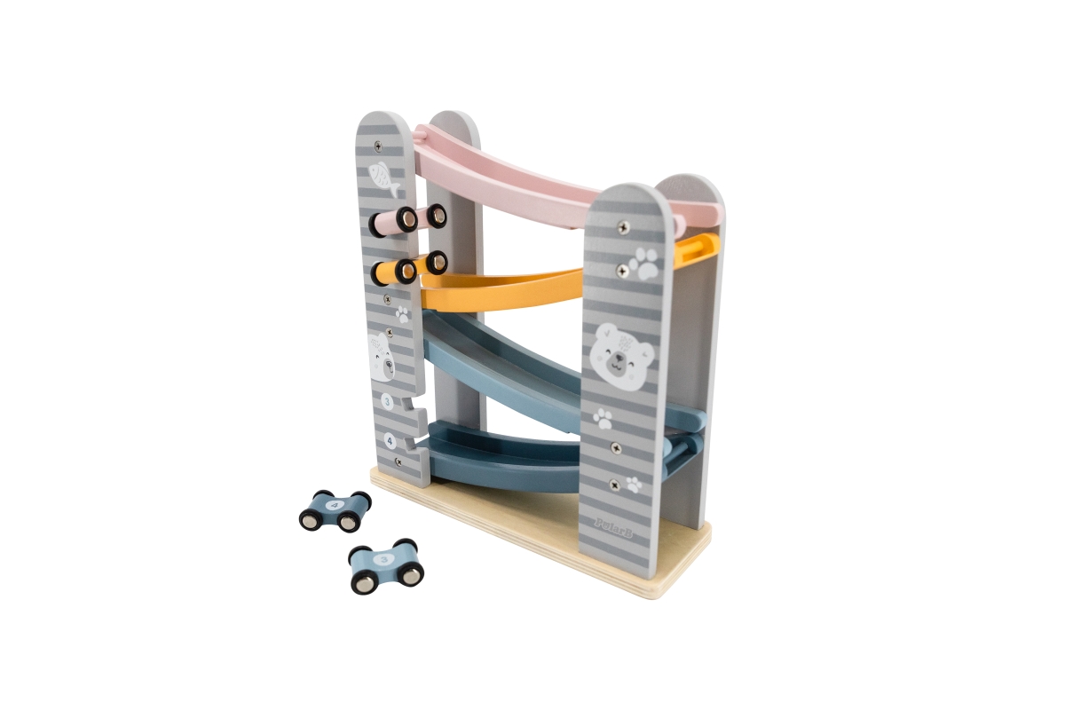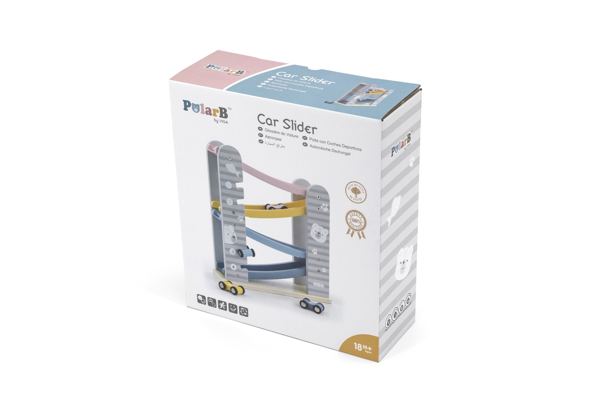Dřevěná klouzačka s autíčky. Balení obsahuje 4 autíčka. Rozměry dráhy cca 26 x 23,5 x 8,5 cm. Rozměry balení cca 24,5 x 27,5 x 9,5 cm. Věk 18m+..