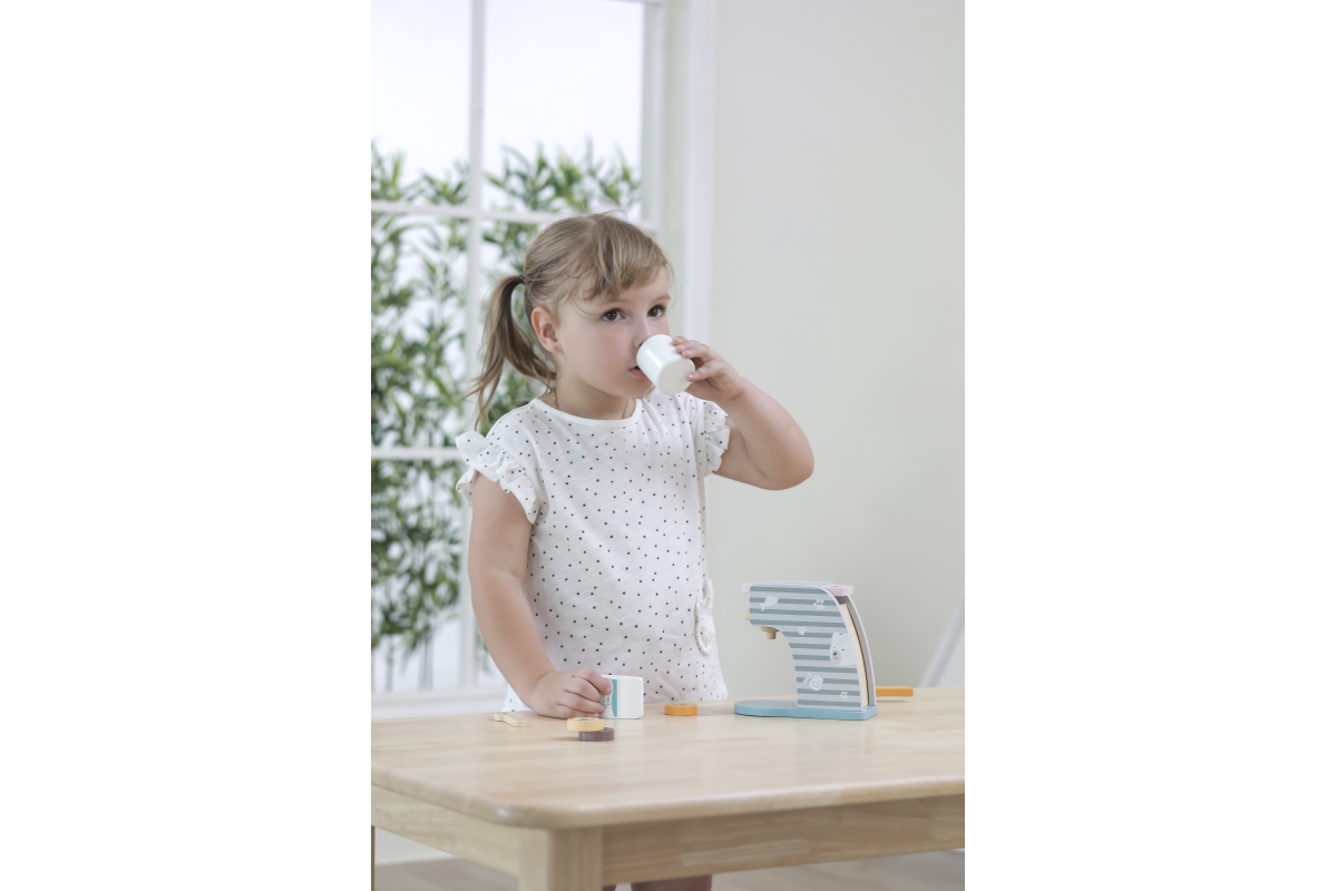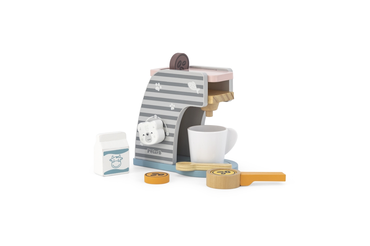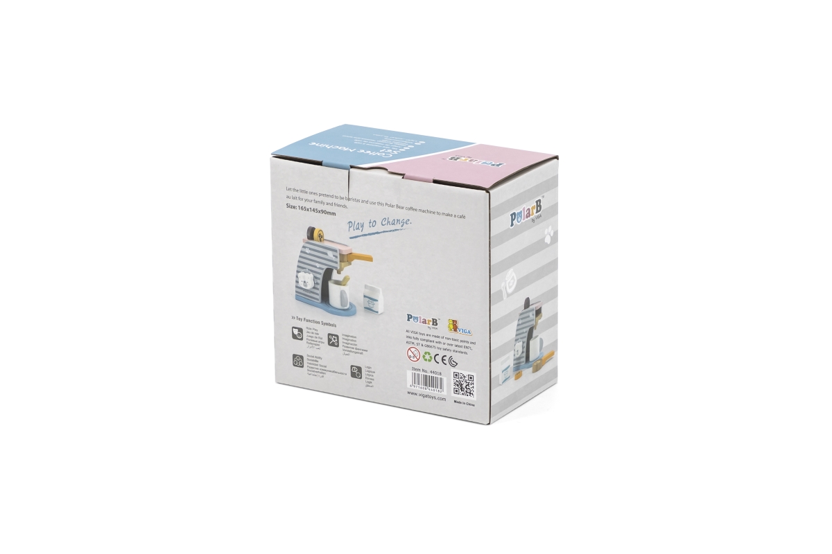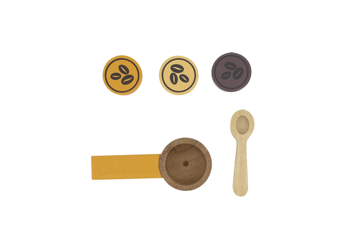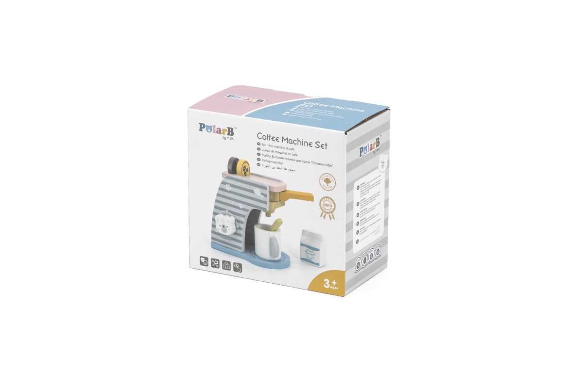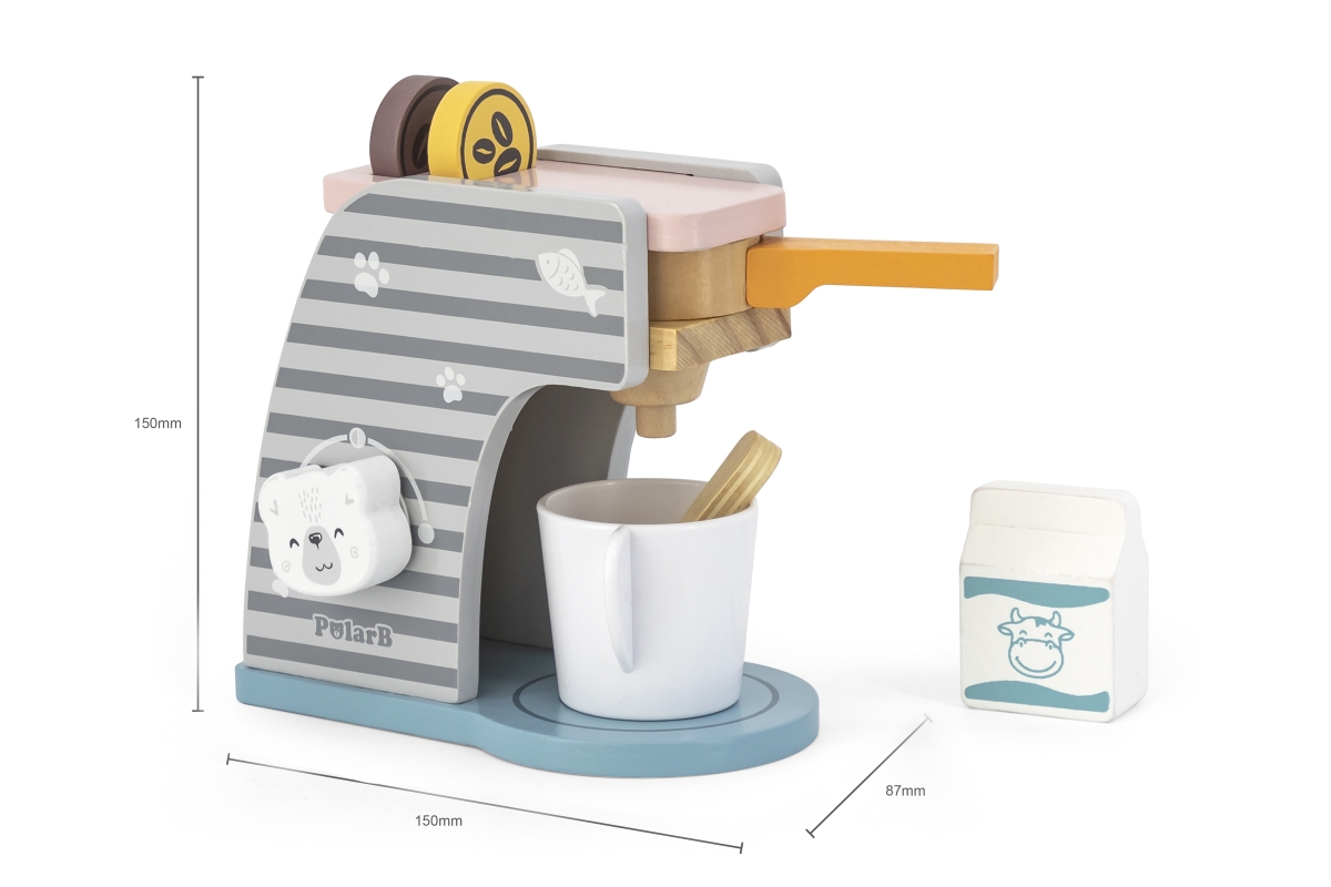 Dřevěný kávovar o velikosti cca 16,5 x 14,5 x 9 cm. Rozměry balení cca 17 x 16 x 9,5 cm. Věk 3+..