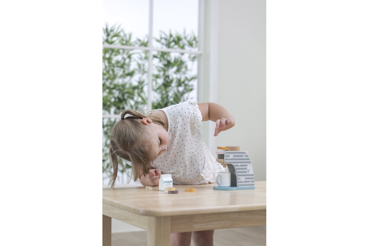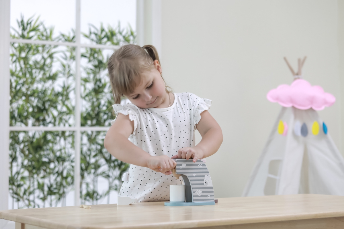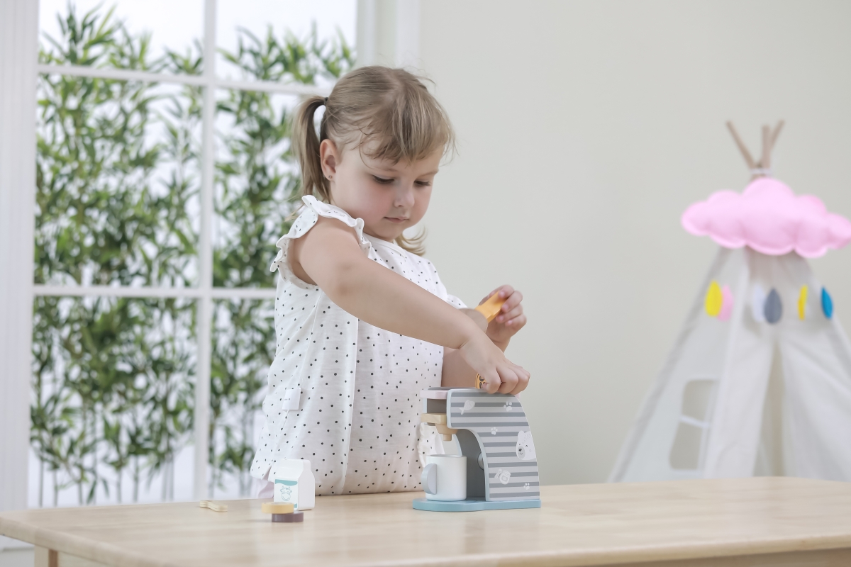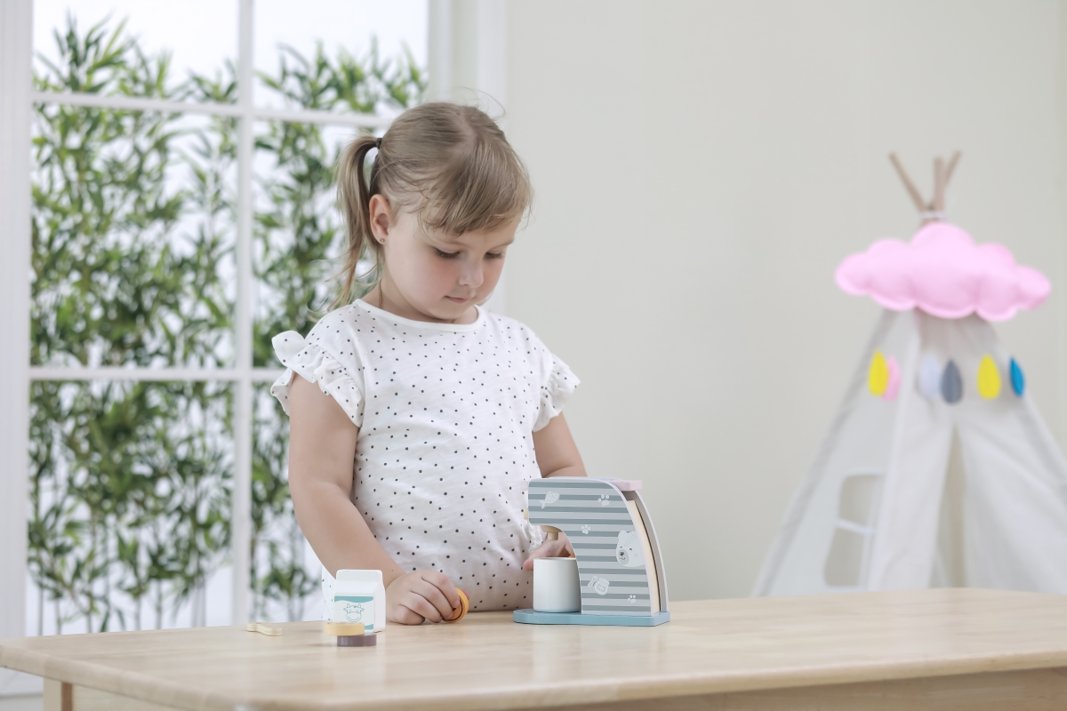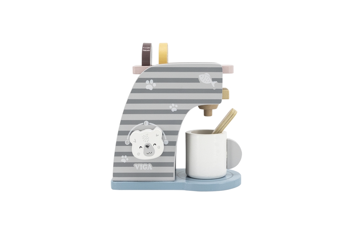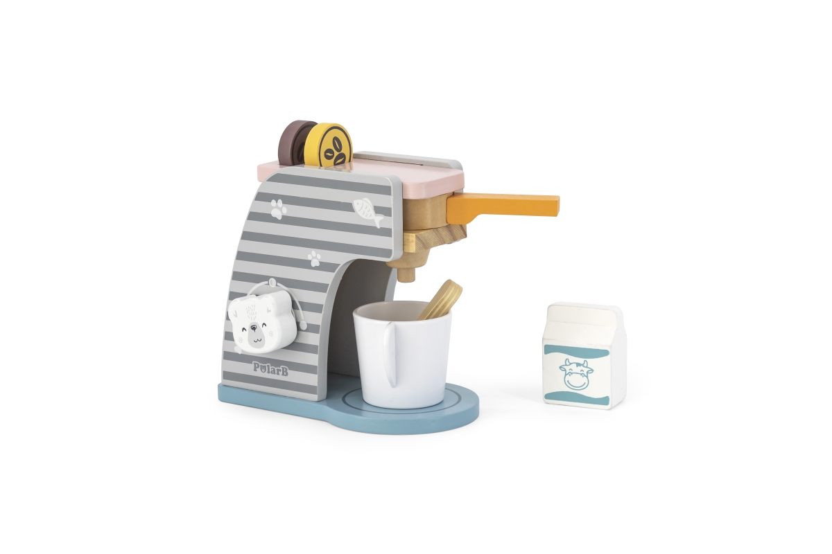 Dřevěný kávovar o velikosti cca 16,5 x 14,5 x 9 cm. Rozměry balení cca 17 x 16 x 9,5 cm. Věk 3+..
