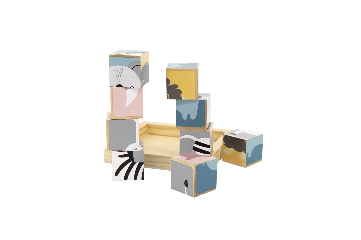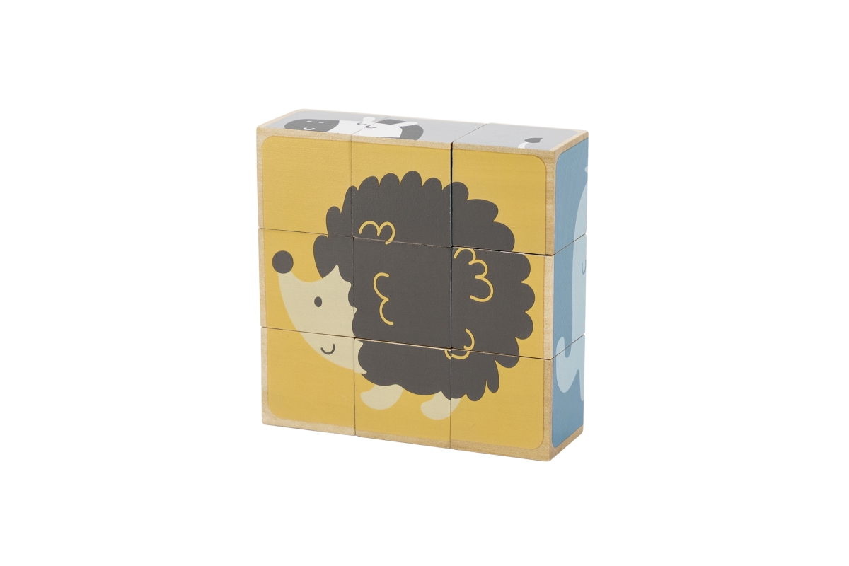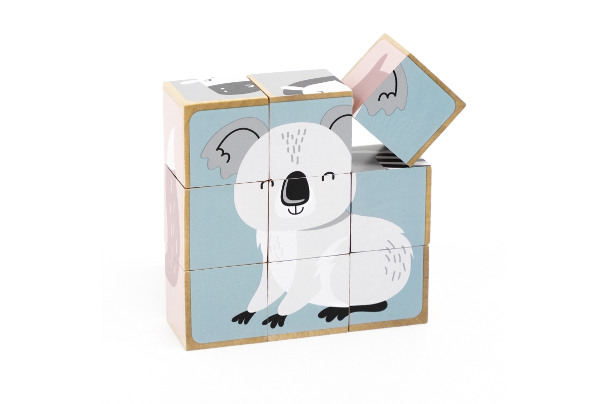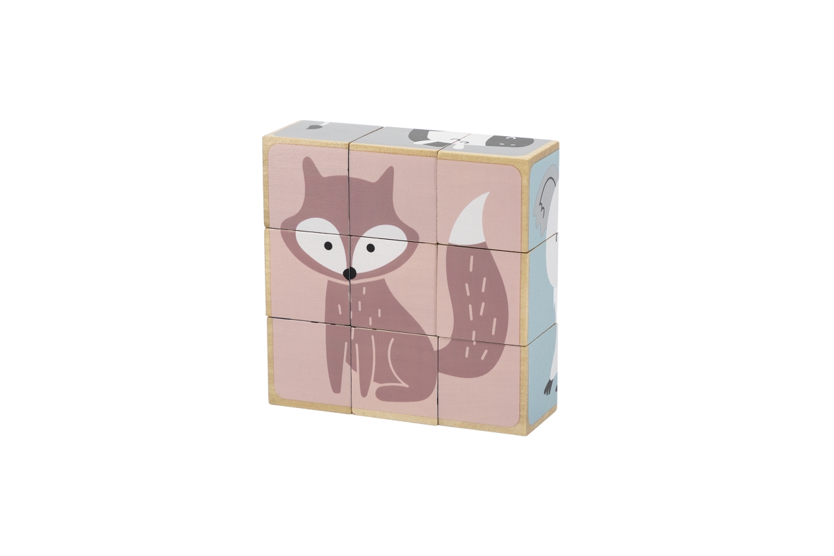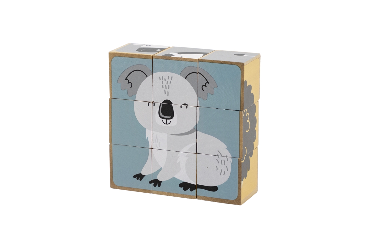 Dřevěné kostky, ze kterých lze složit 6 obrázků zvířátek. Celkem 9 ks kostek. Rozměry kostky cca 3,5 x 3,5 cm. Rozměry balení cca 13,5 x 14 x 5 cm. Vě..
