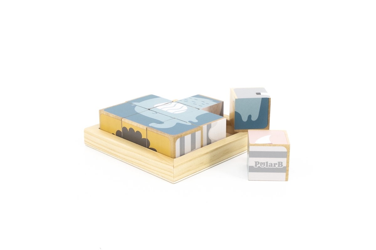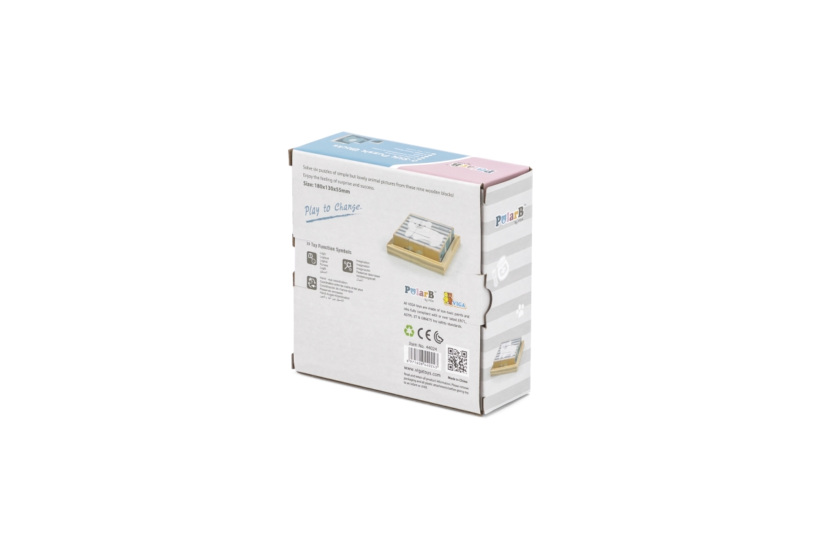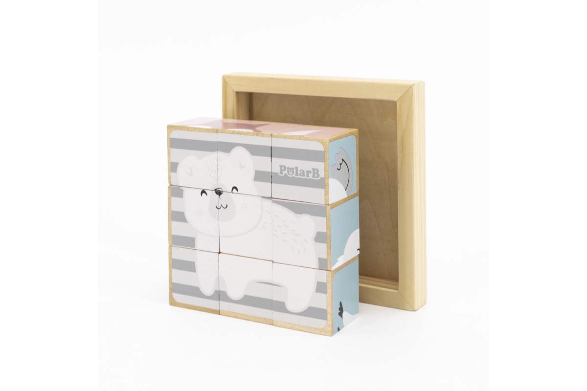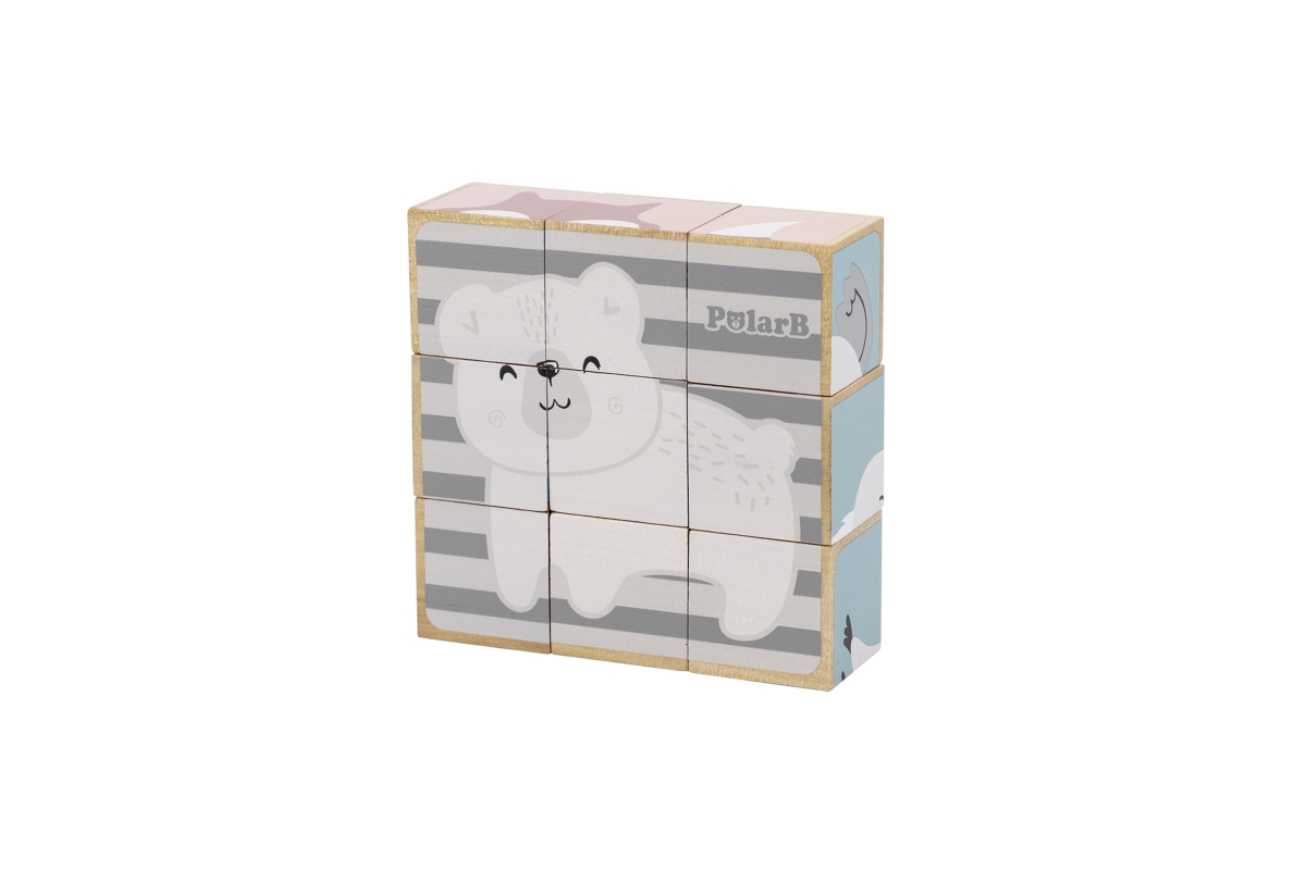 Dřevěné kostky, ze kterých lze složit 6 obrázků zvířátek. Celkem 9 ks kostek. Rozměry kostky cca 3,5 x 3,5 cm. Rozměry balení cca 13,5 x 14 x 5 cm. Vě..