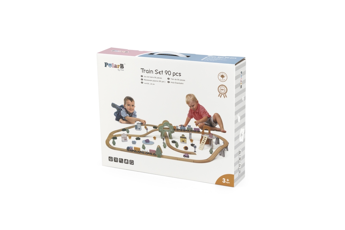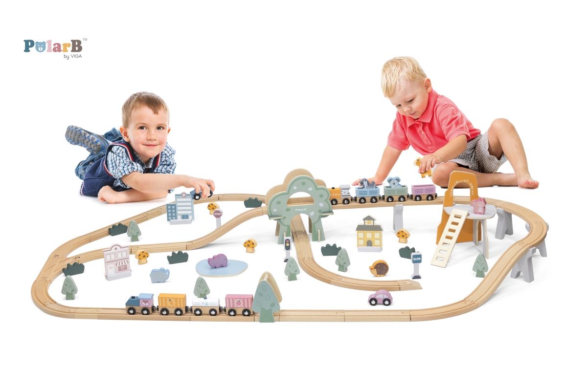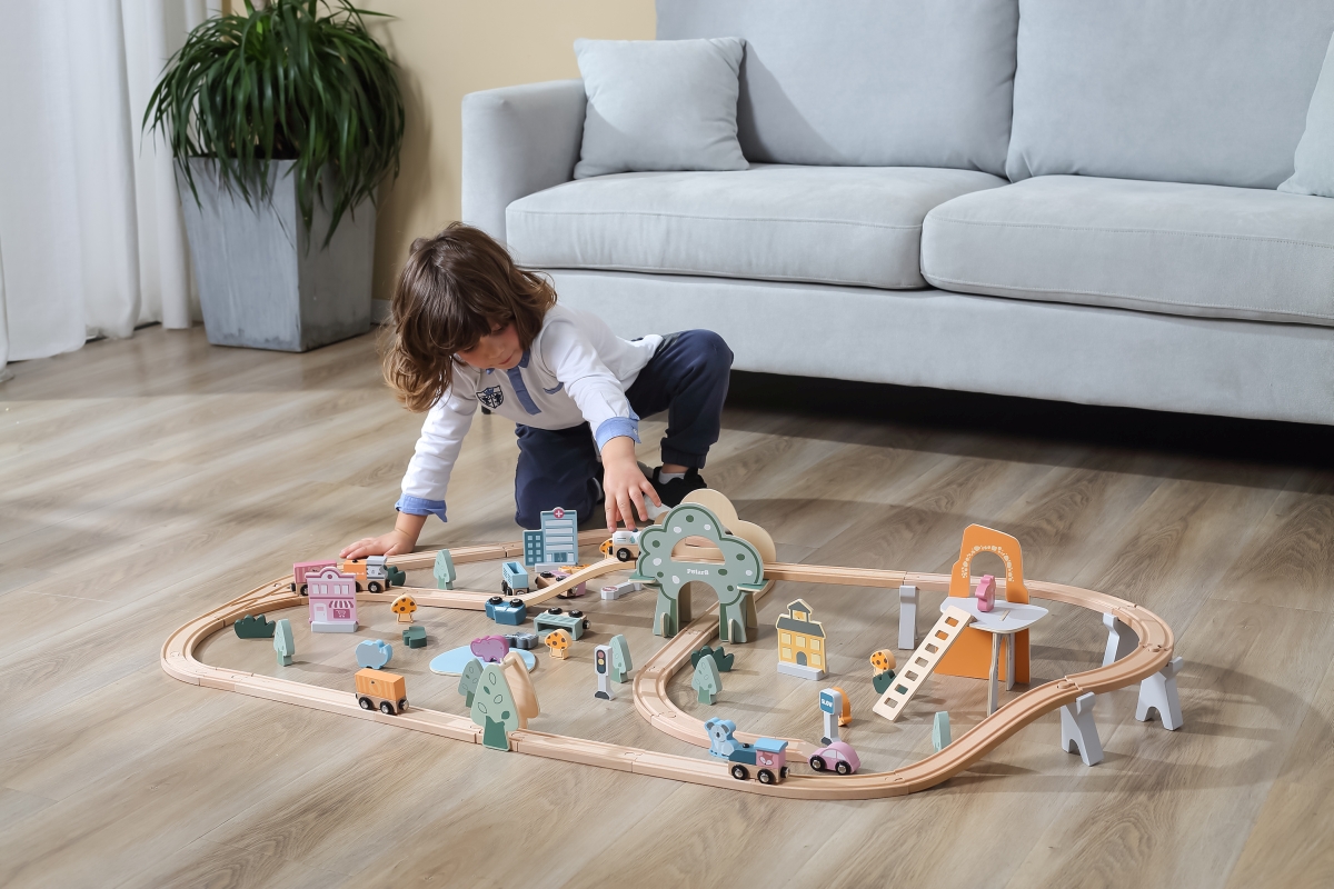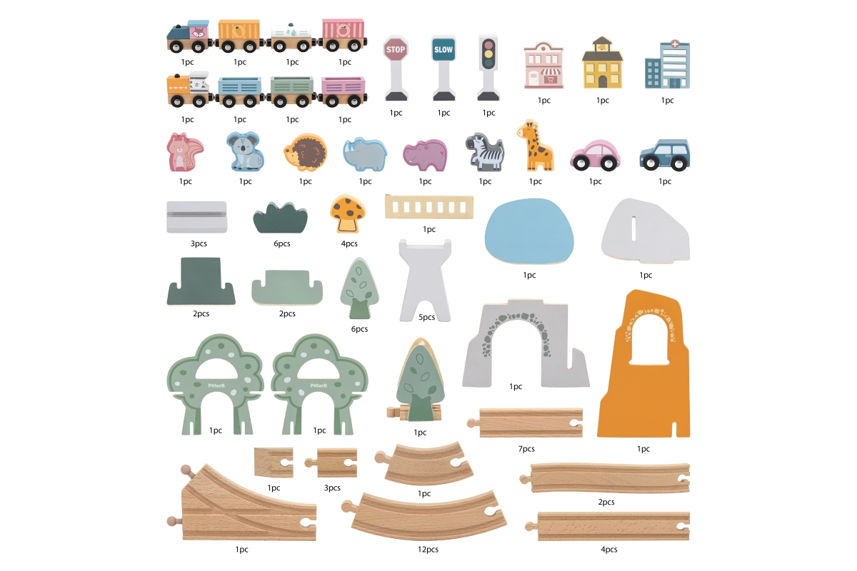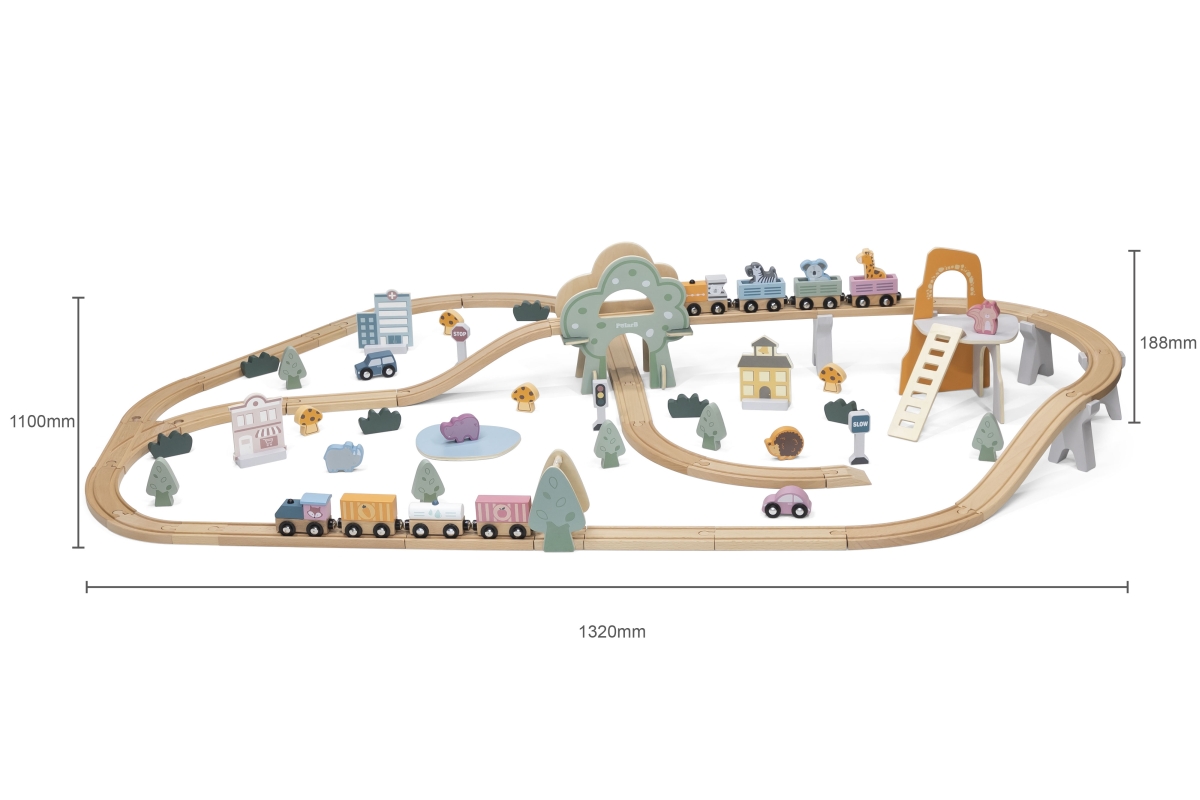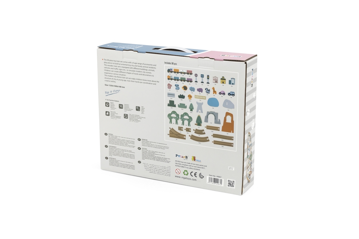 Tato 90dílná sada vláčků obsahuje širokou škálu doplňků a herních figurek k vybudování zábavného města s krásnými zvířecími obyvateli. Tato dřevěná vlaková souprava je vybavena různými budovami, zvířaty, vozidly a dopravními značkami, aby simulovala moderní městské scény. Děti mohou vytvářet různé tvary drah a dekorací, aby si vyzkoušely různé situace. Díky této moderní vlakové soupravě s tématikou města mohou děti vědět více o struktuře města v mladém věku, trénovat jejich koordinaci ruka-oko a kreativní schopnosti. Rozměr balení cca 44 x 36 x 9 cm.