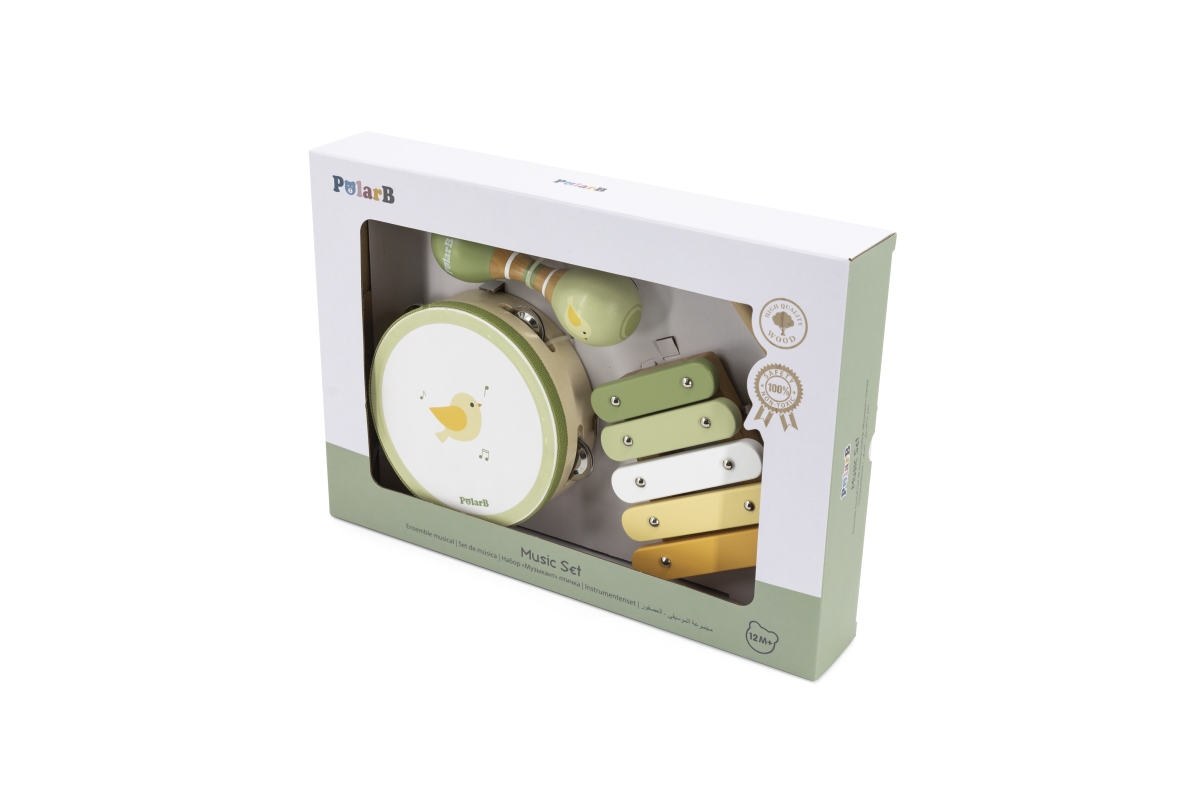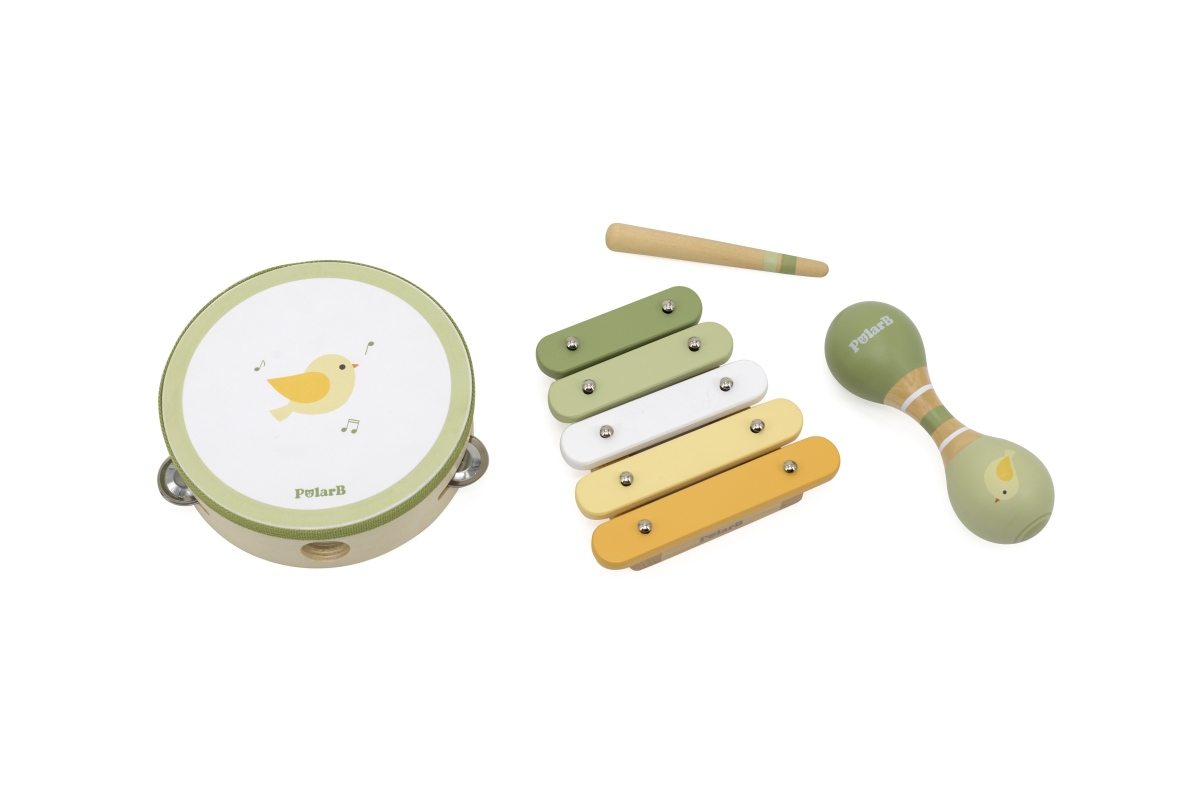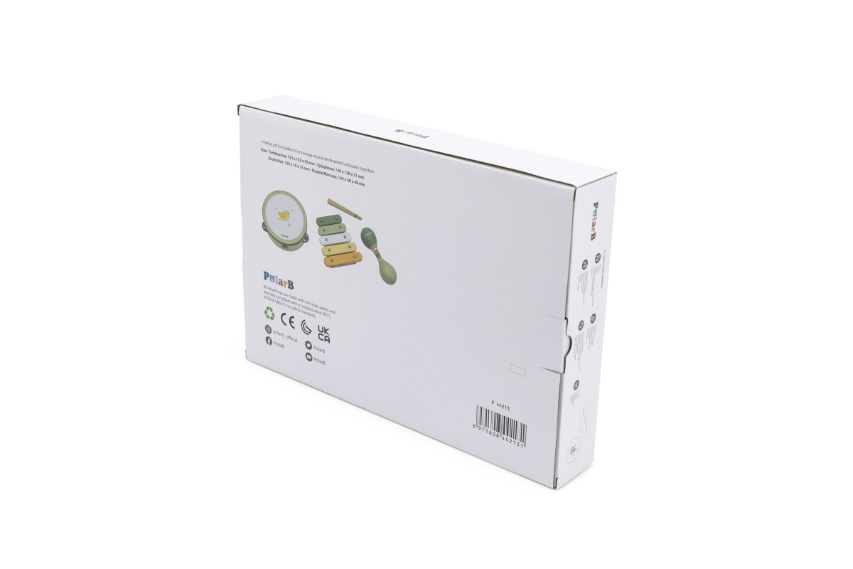 Sada dřevěných hudebních nástrojů. Balení obsahuje rumbakouli, xylofon s paličkou a bubínek. Rozměry balení cca 36x25x6 cm. Věk 12m+..