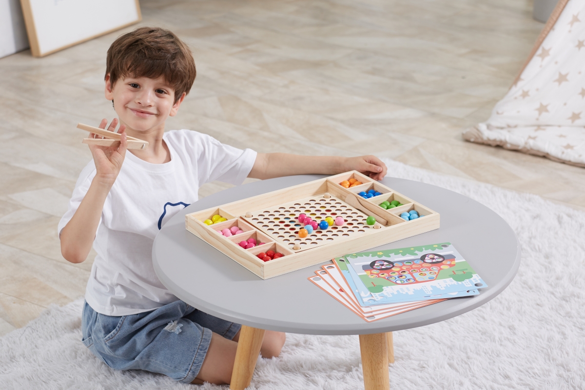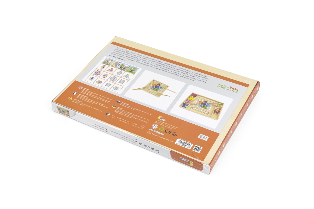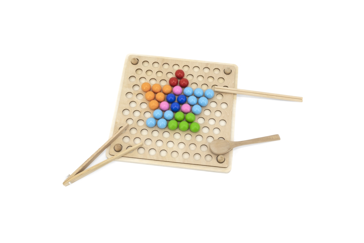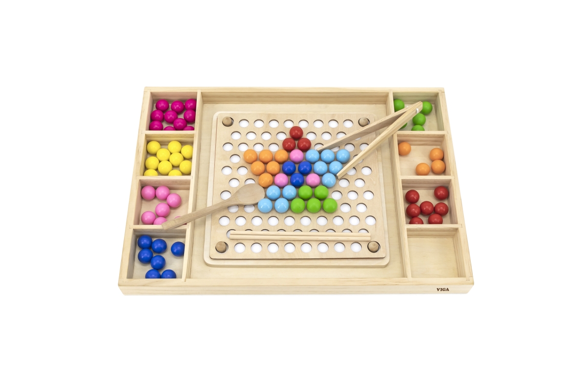 Dřevěná mozaika obsahuje 10 karet s předlohami, 80 dřevěných korálků ,dřevěnou pinzetu na možné vkládání korálků.Vše v dřevěném boxu,ve kterém lze př..
