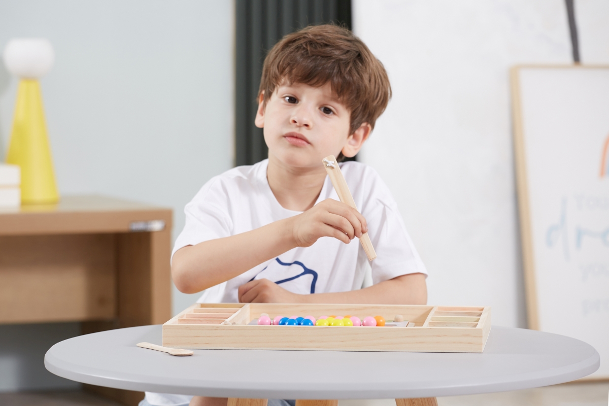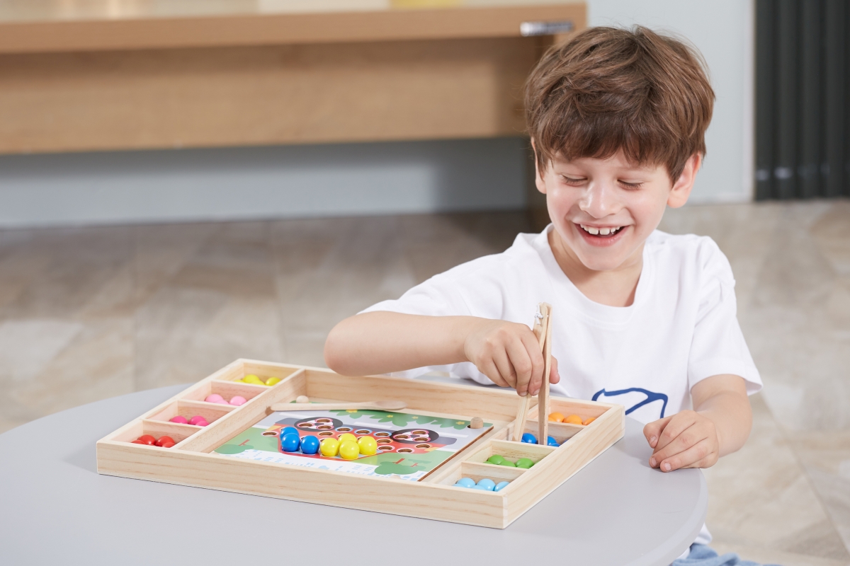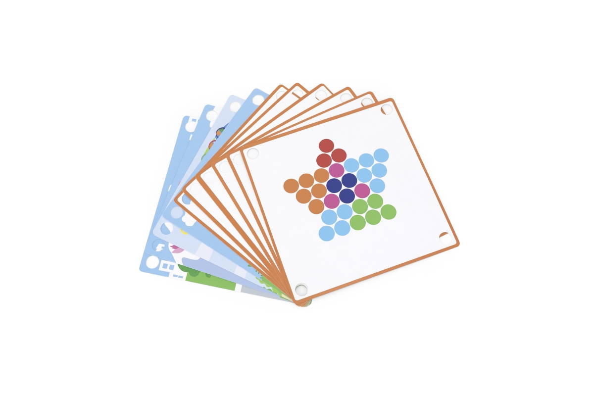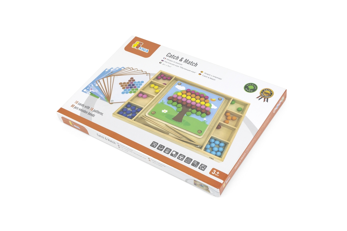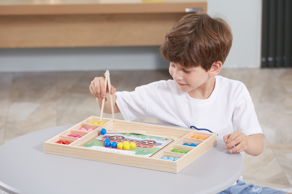 Dřevěná mozaika obsahuje 10 karet s předlohami, 80 dřevěných korálků ,dřevěnou pinzetu na možné vkládání korálků.Vše v dřevěném boxu,ve kterém lze př..
