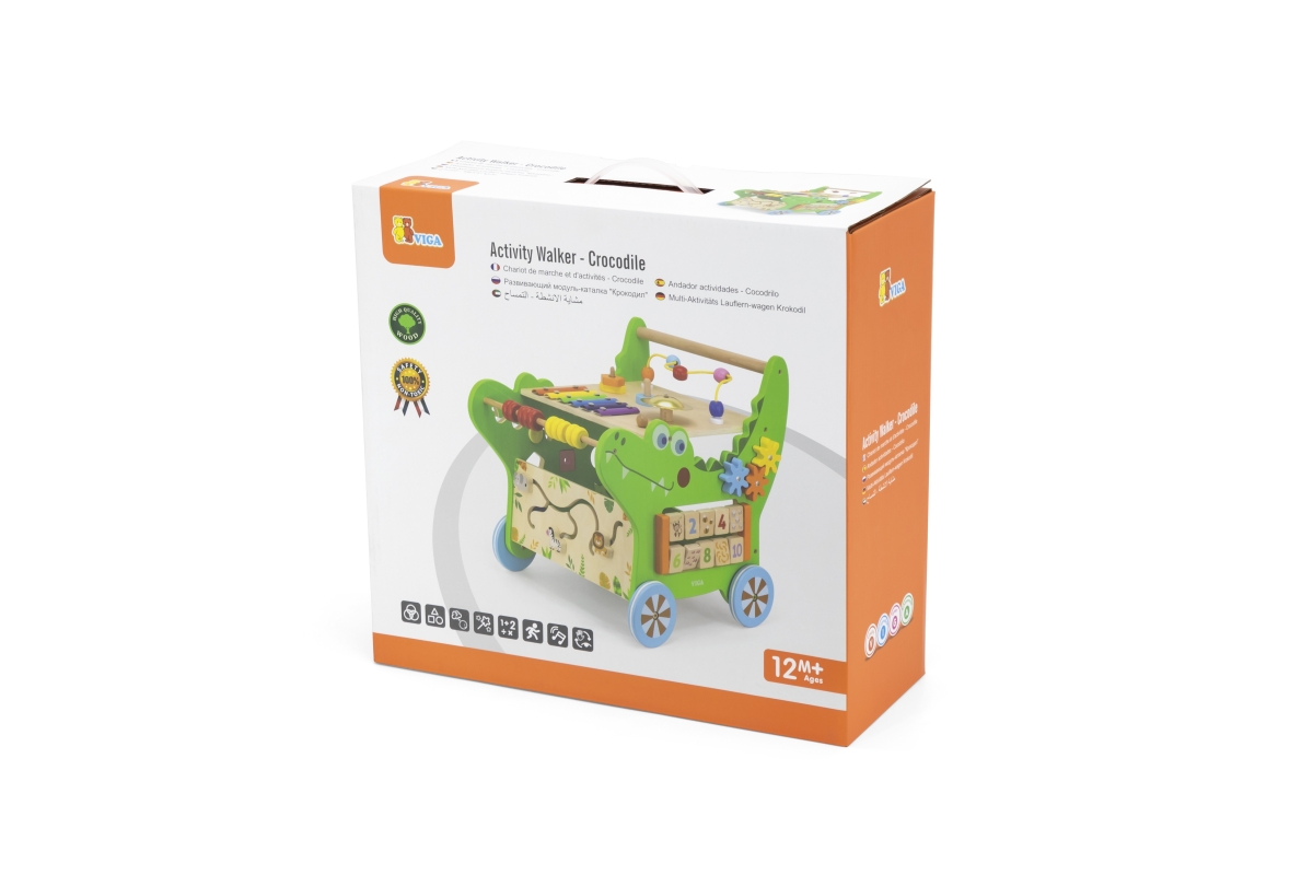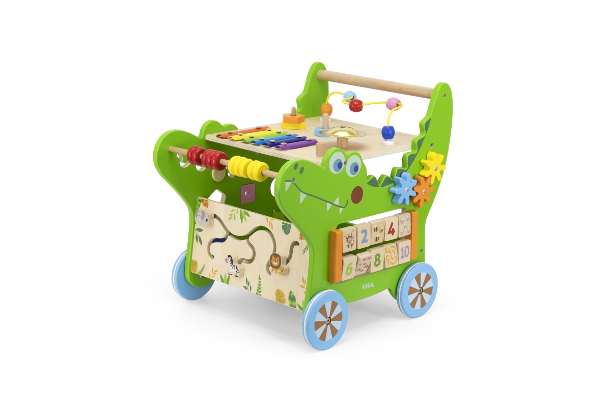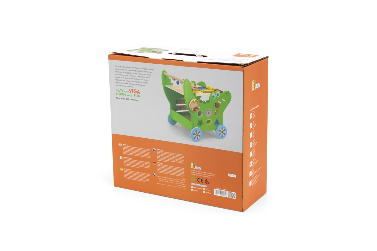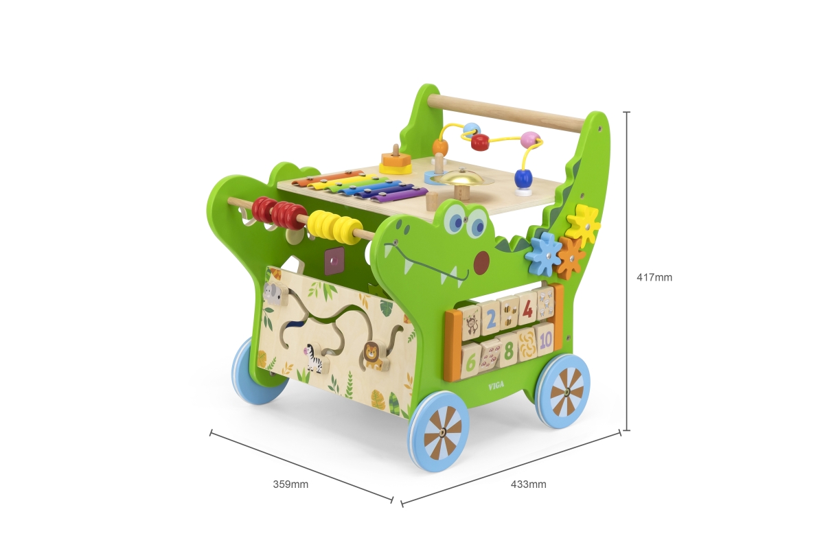 Dřevěný krokodýl chodítko od značky VIGA obsahuje celou řadu vzrušujících aktivit pro batole: labyrint zvířátek, xylofon, ozubená kola, třídič tvarů, počítadlo a mnoho dalších. Odolná konstrukce nabízí stabilní oporu, aby se miminko mohlo začít učit sebevědomě chodit a pomáhá mu udržovat rovnováhu. Rozměr cca 43,3 x 41,7 x 35,9 cm. Věk 12m+