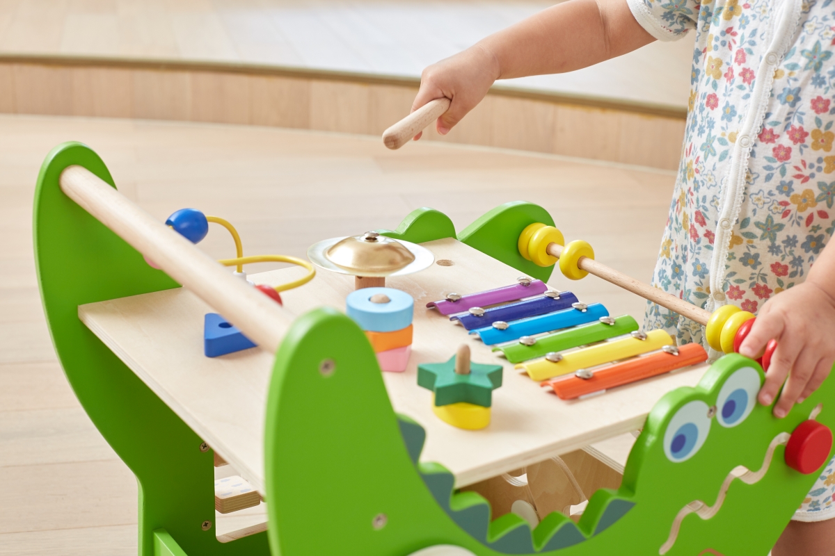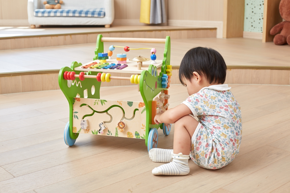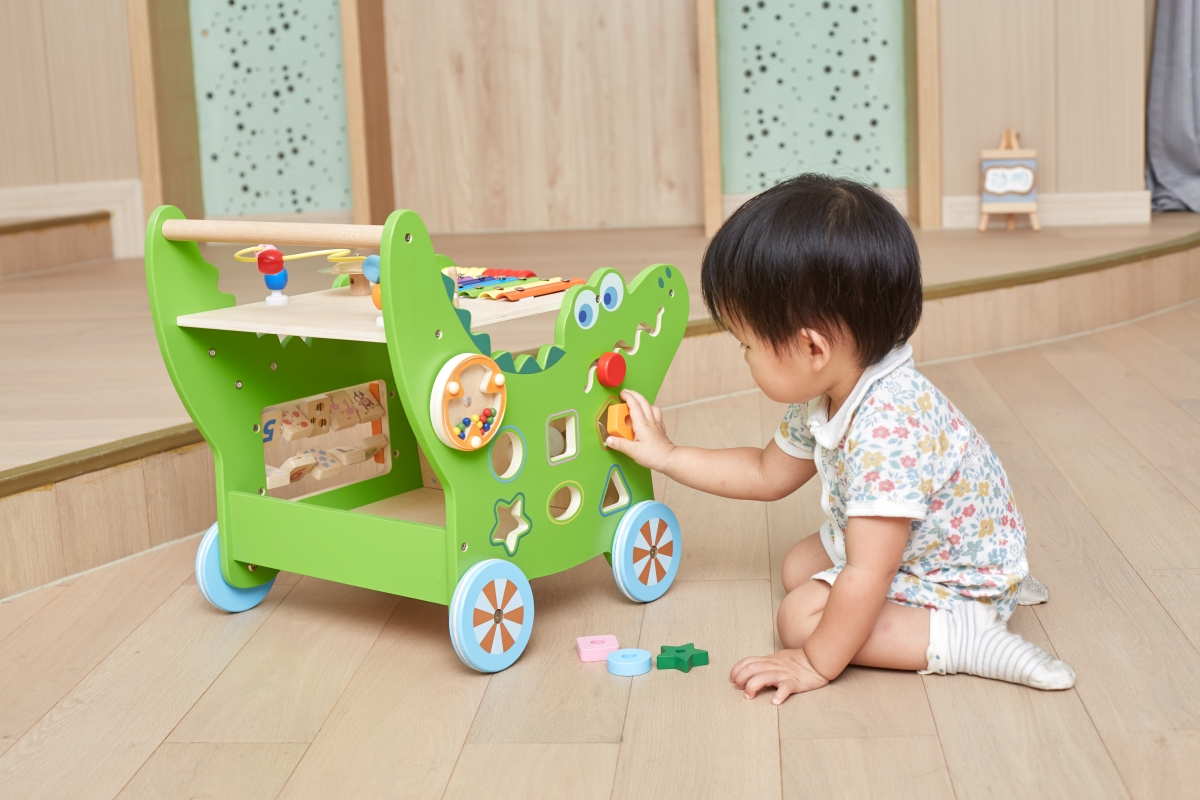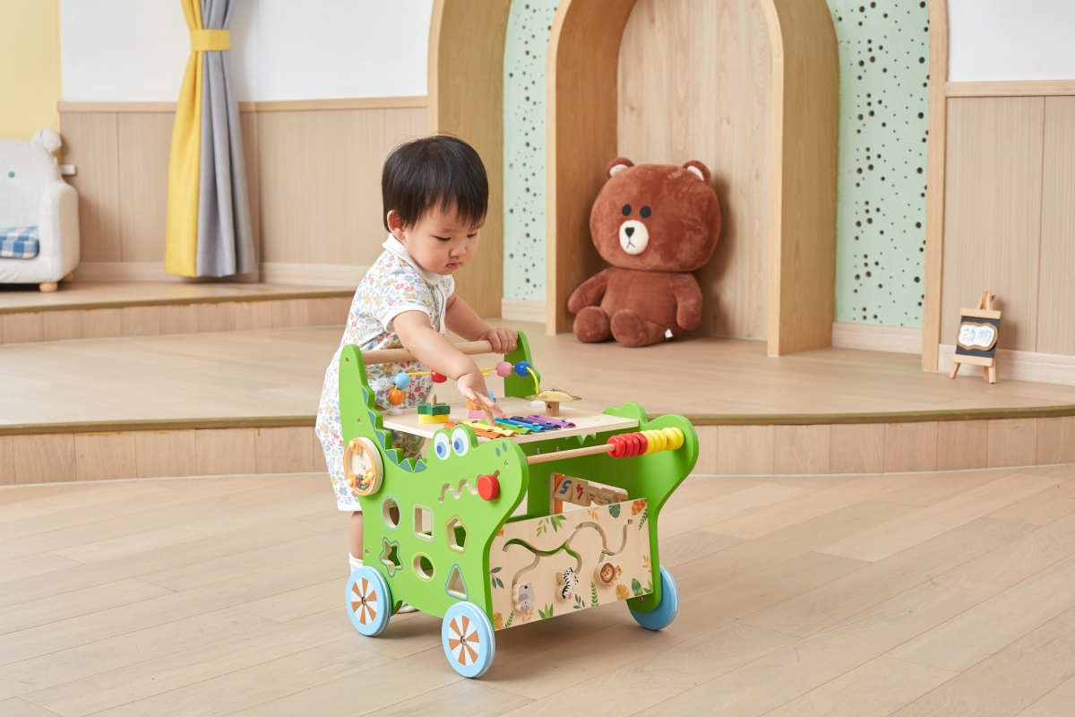 Dřevěný krokodýl chodítko od značky VIGA obsahuje celou řadu vzrušujících aktivit pro batole: labyrint zvířátek, xylofon, ozubená kola, třídič tvarů, ..