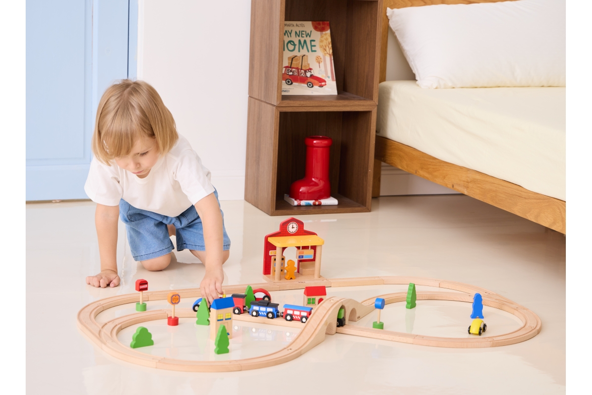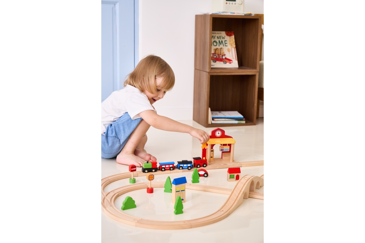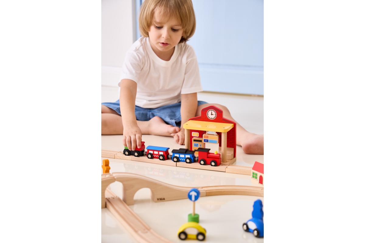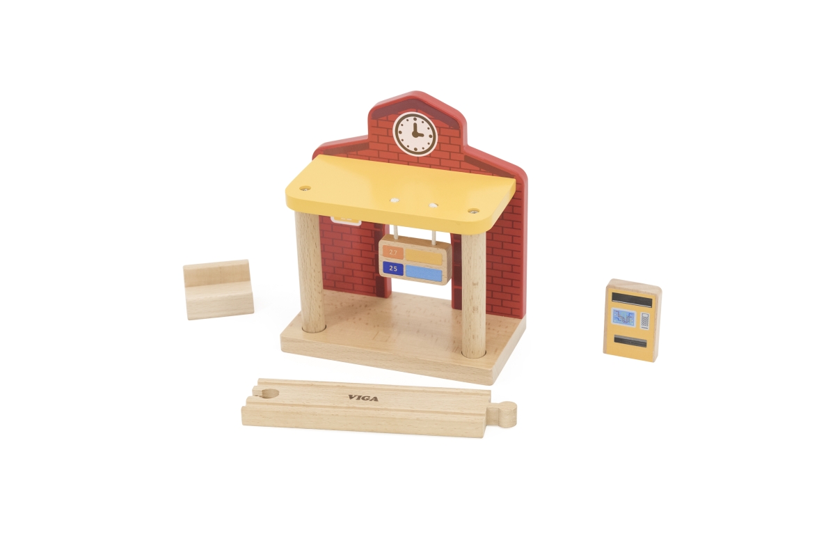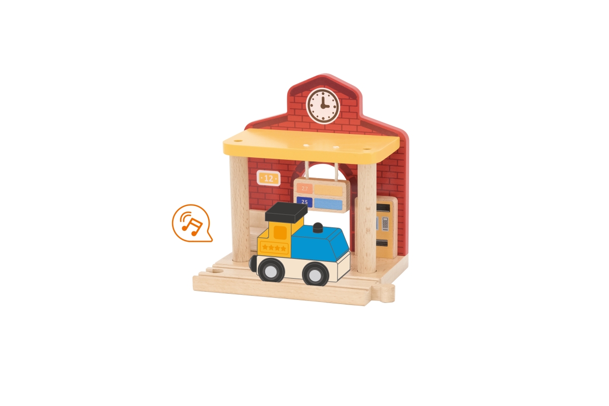 Dřevěné nádraží. Napájení na 2 knoflíkové baterie. Rozměry nádraží 16,2x11,8x1,6 cm. Rozměry balení 16x17,5x8,5 cm. Věk 3+..