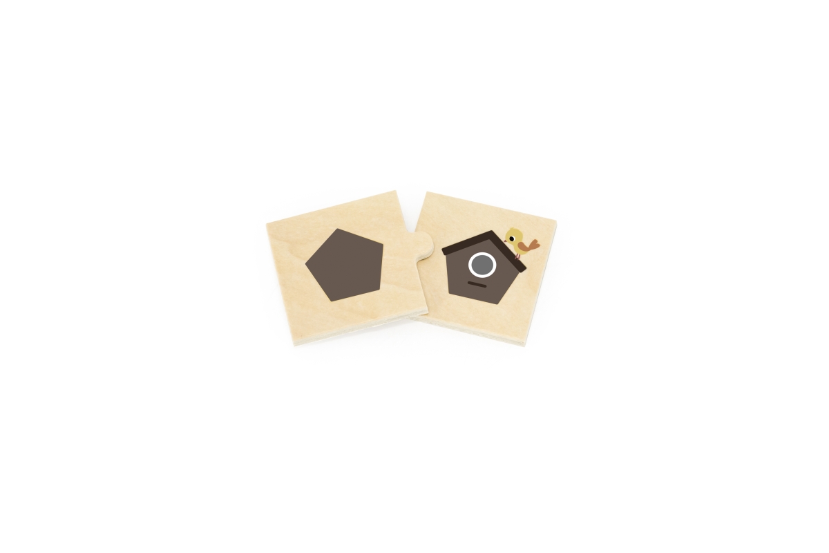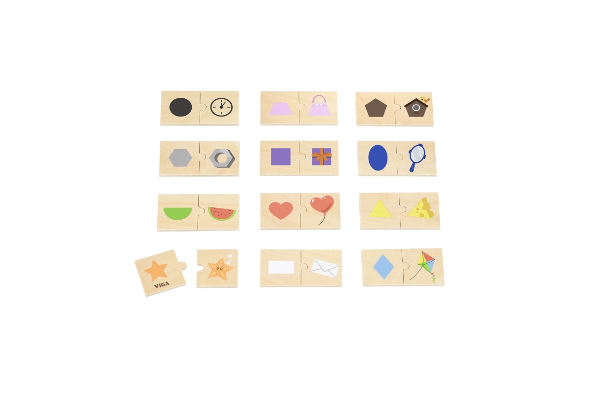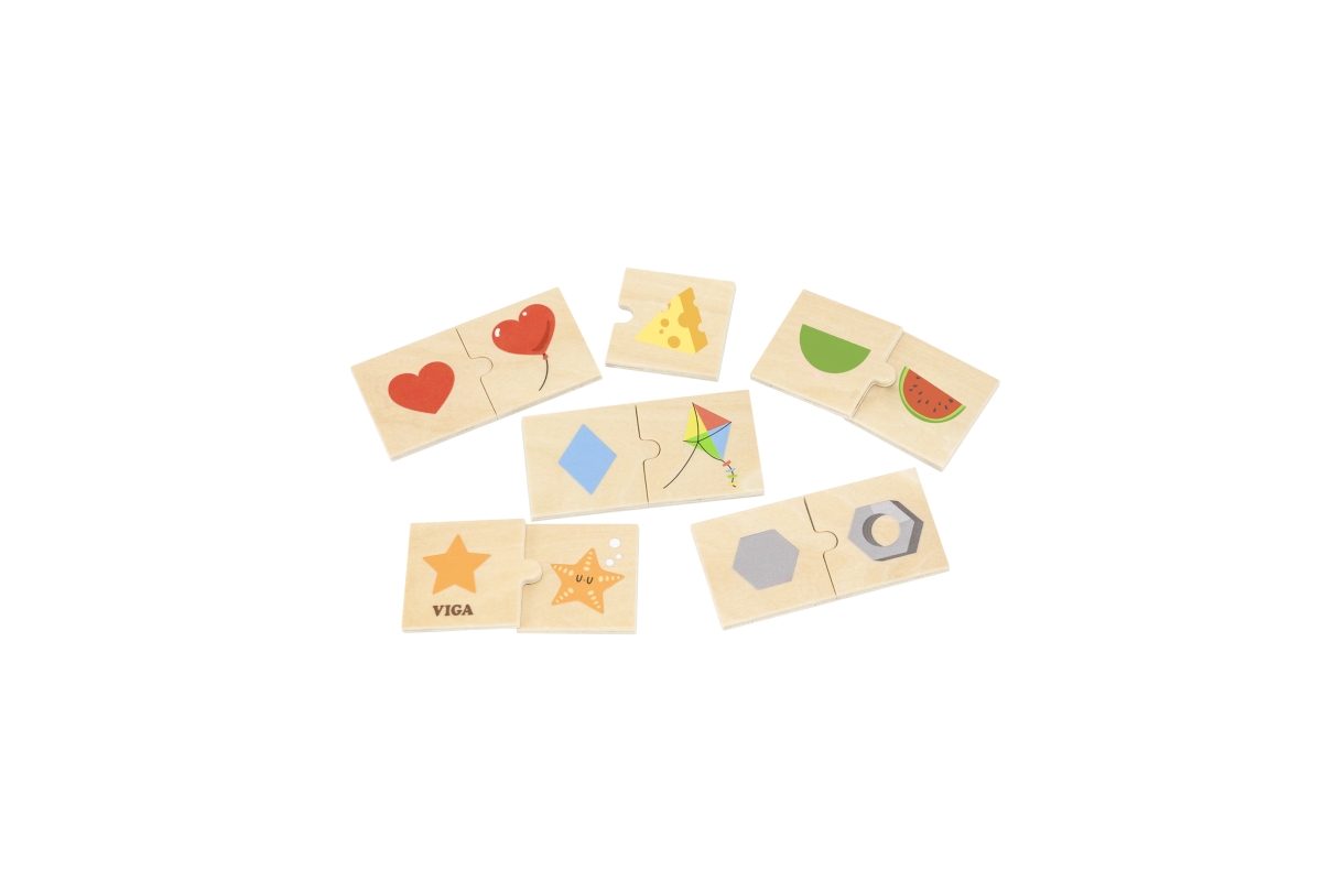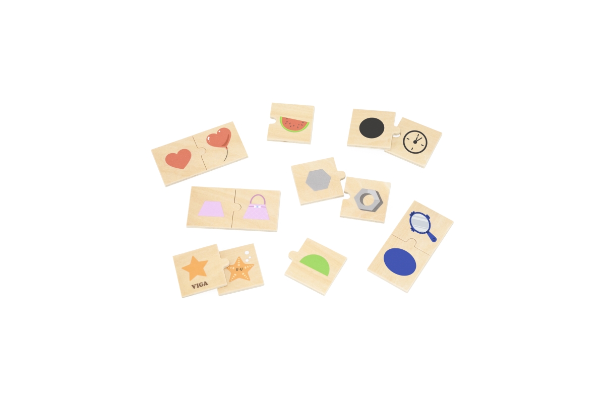 Dřevěné puzzle dvojice - tvary (vždy k sobě patří tvar + obrázek stejného tvaru). Baleno v krabici. Rozměry balení 20x19x4,5 cm. Věk 18m+..