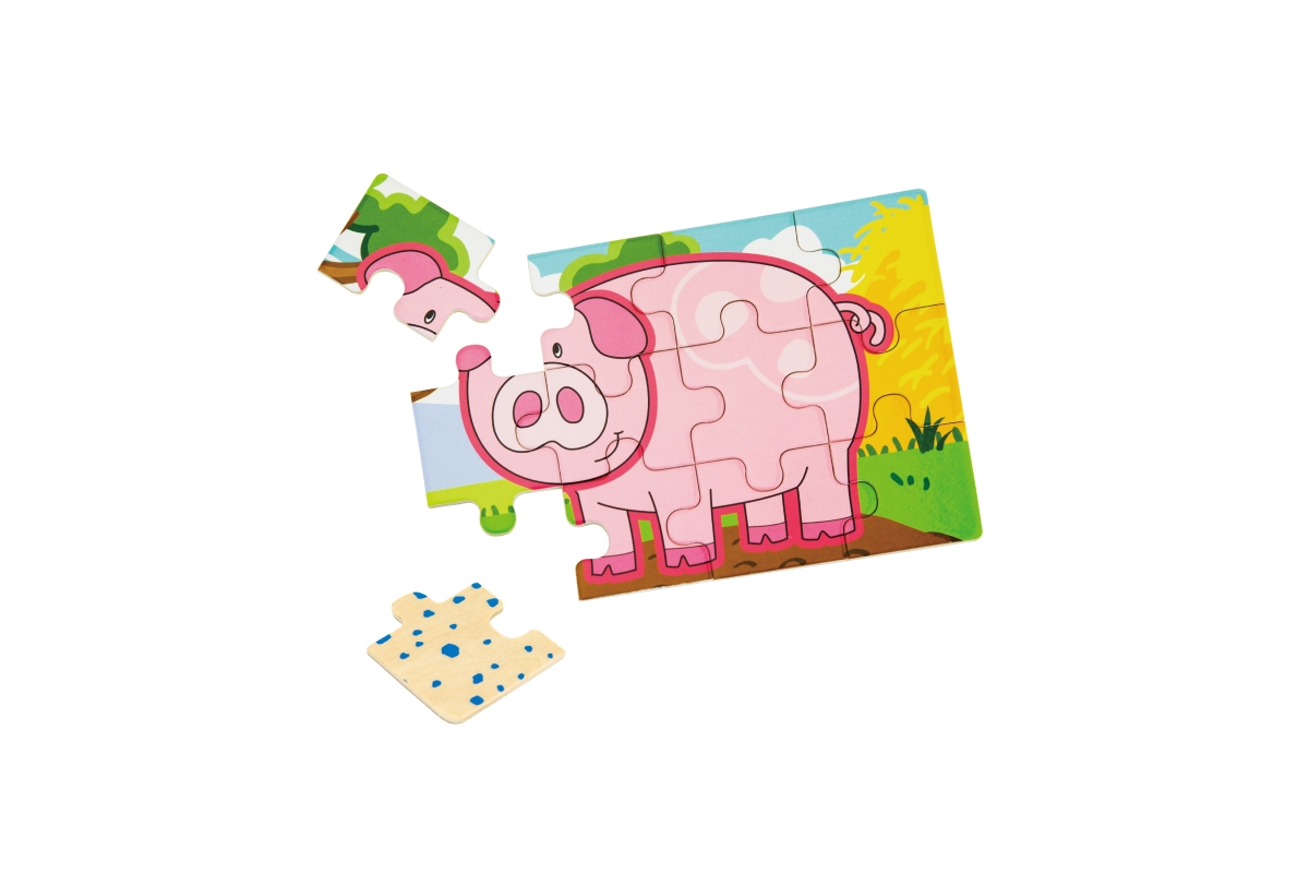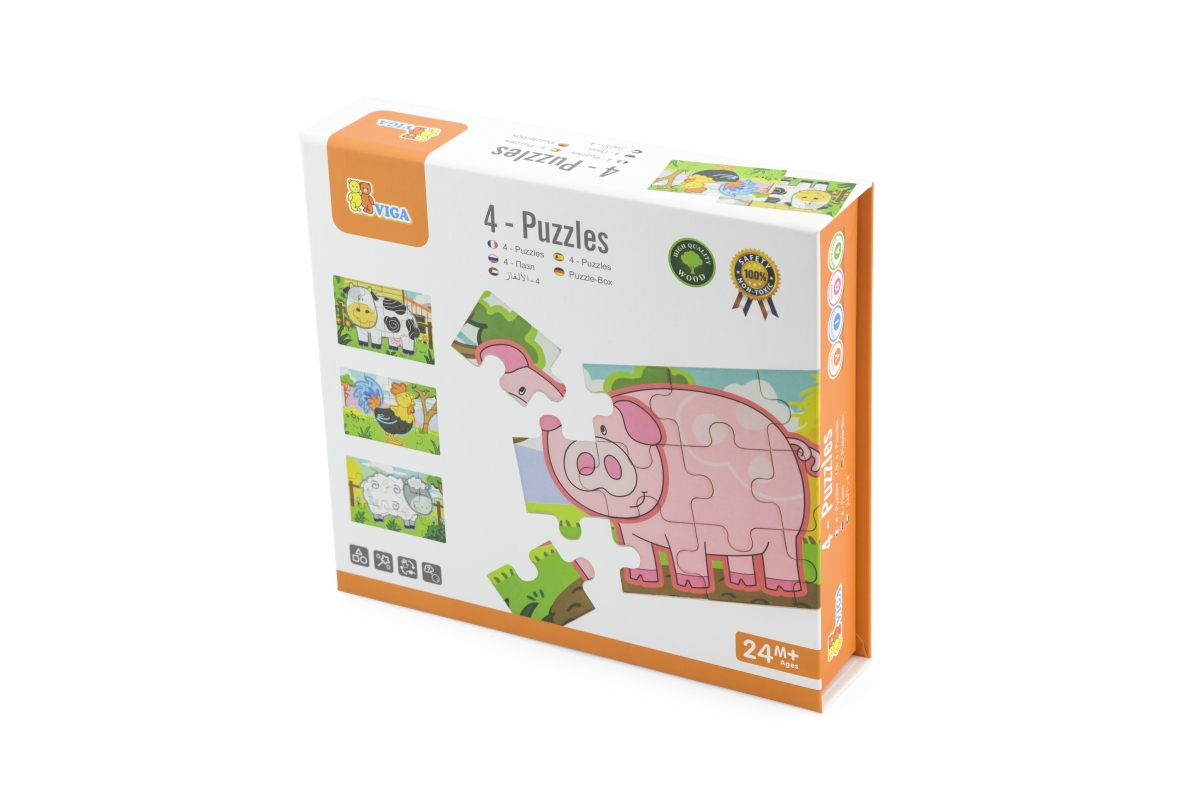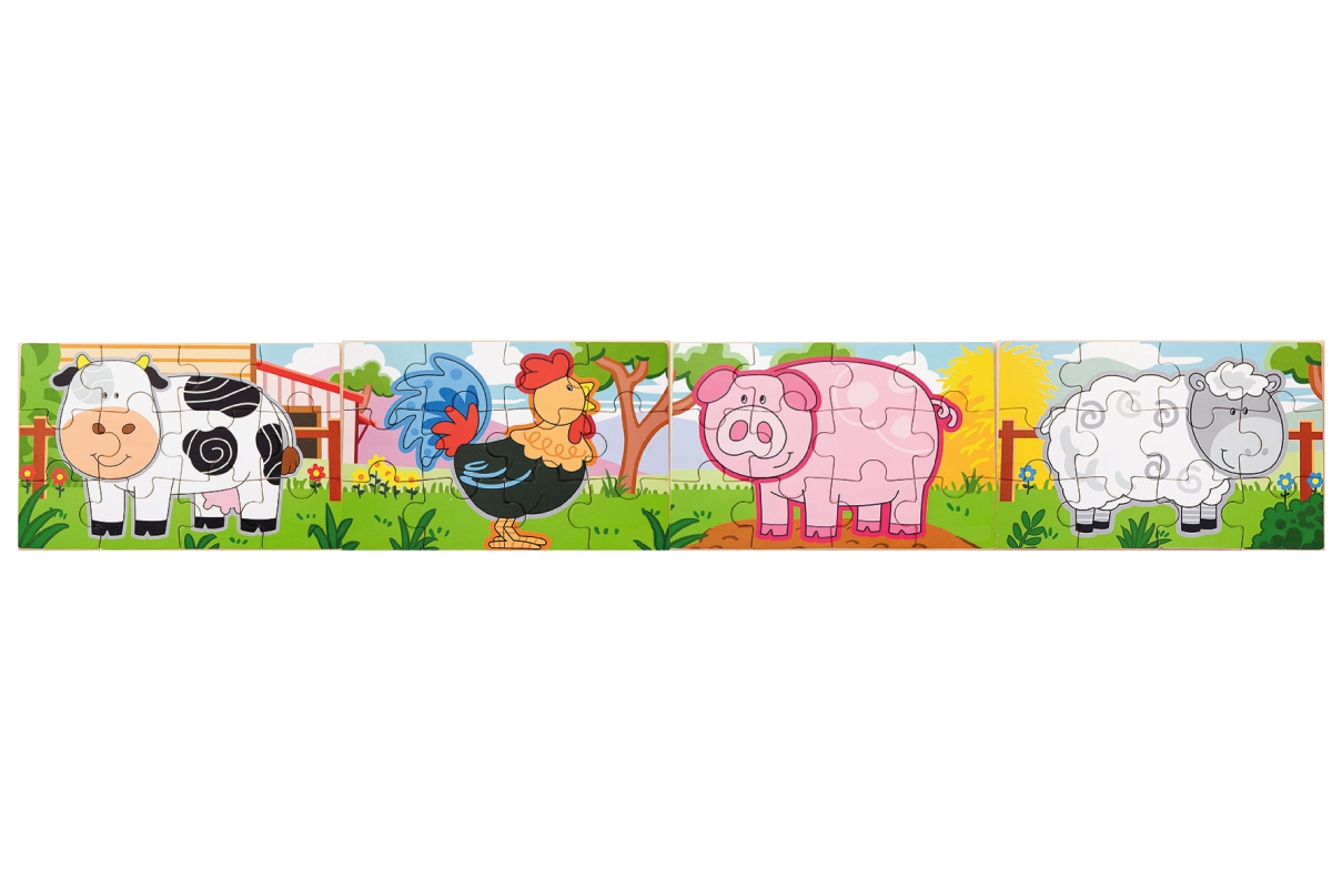 Dřevěné puzzle s motivy farmy. Balení obsahuje celkem 4 obrázky (celkem 48 dílů). Z puzzlí lze postavit jeden dlouhý obrázek všech 4 zvířátek. Rozměry..