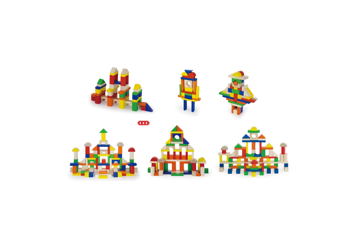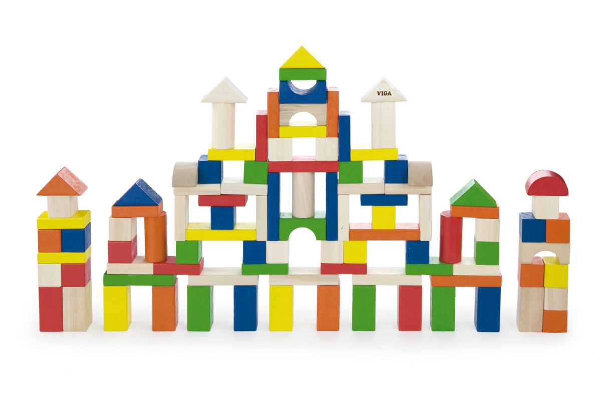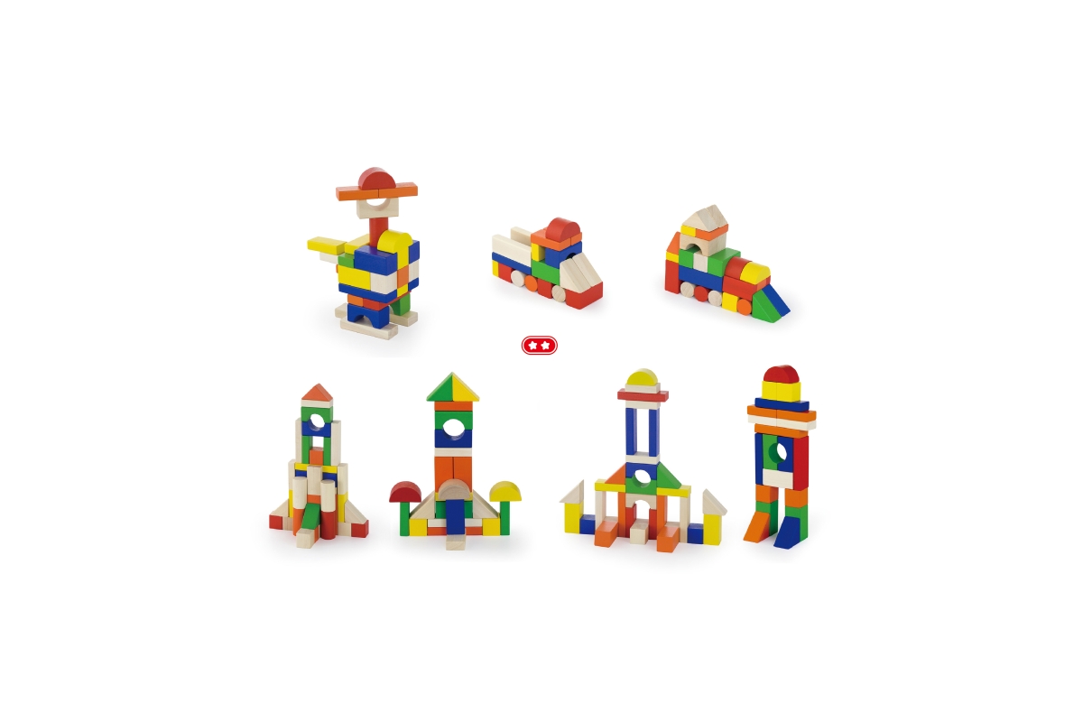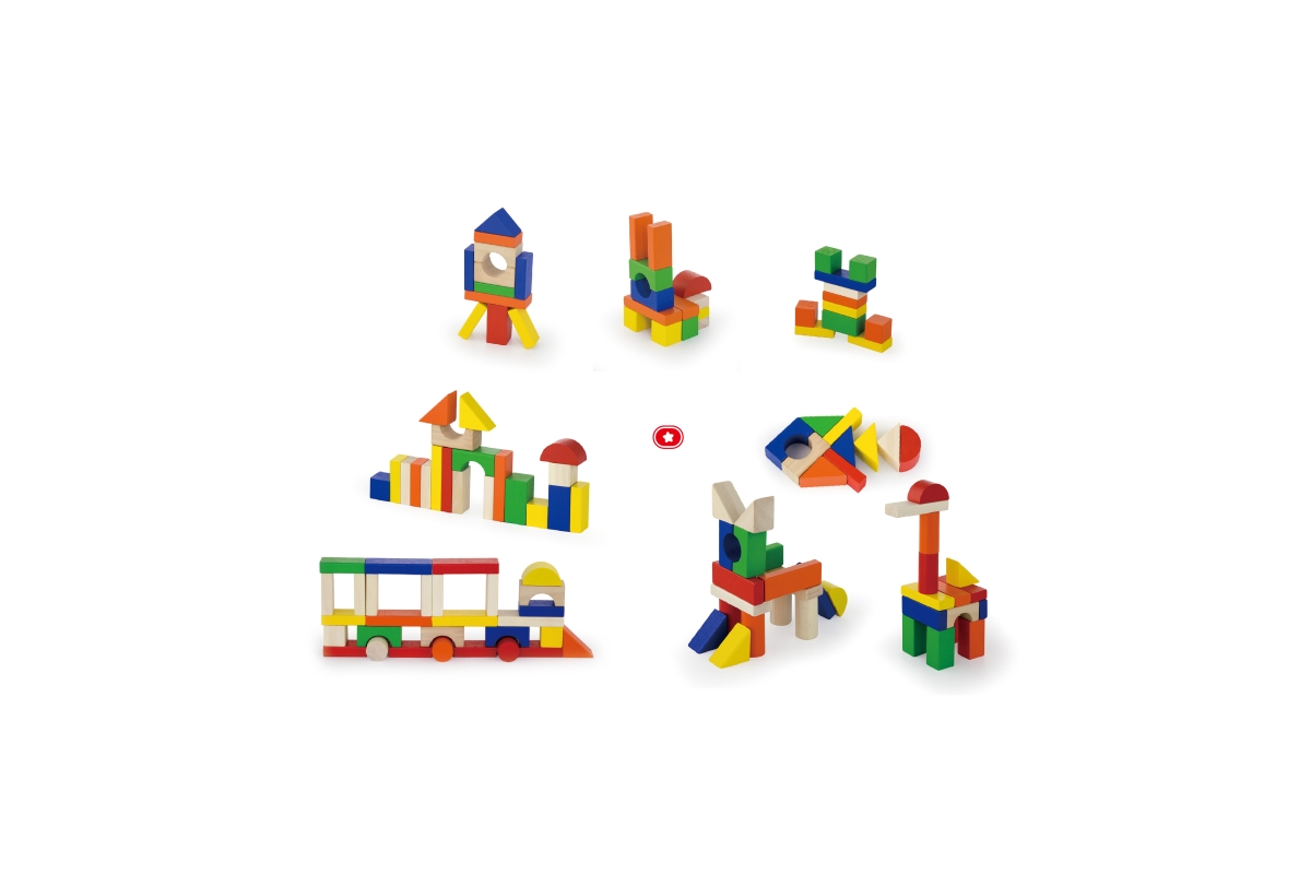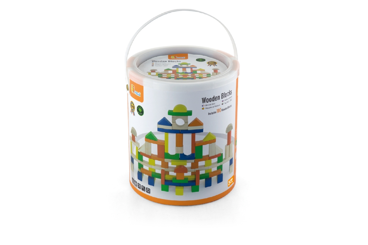 Dřevěná stavebnice v kyblíku. Obsahuje 100 dílků a obrázkovou brožuru s návody na stavění. Rozměry balení cca 18 x 21 cm. Velikost kostek 2,5 - 7,5 cm..
