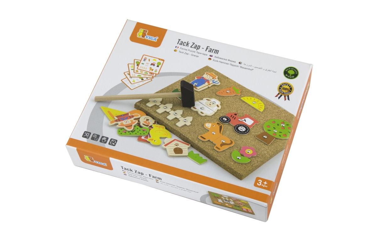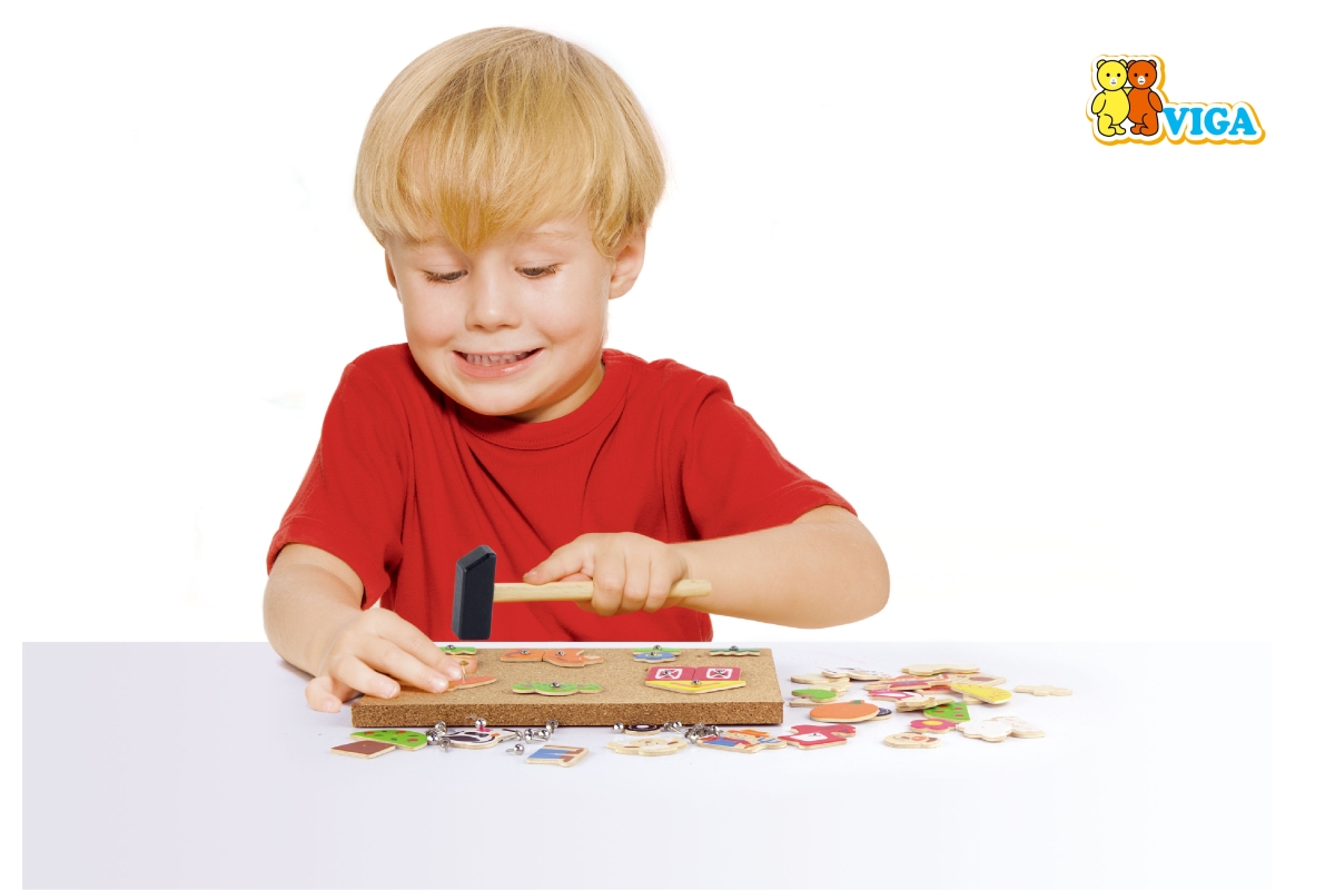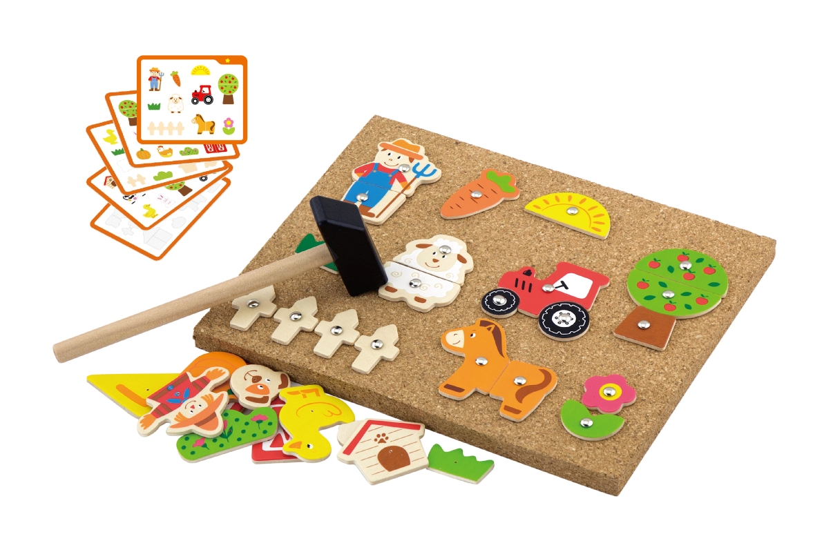 Dřevěné zatloukání obsahuje 24 různých dílků, korkovou desku a kladívko s přípínáčky. Rozměry balení cca 24,5 x 20 x 5 cm. Věk 3+..