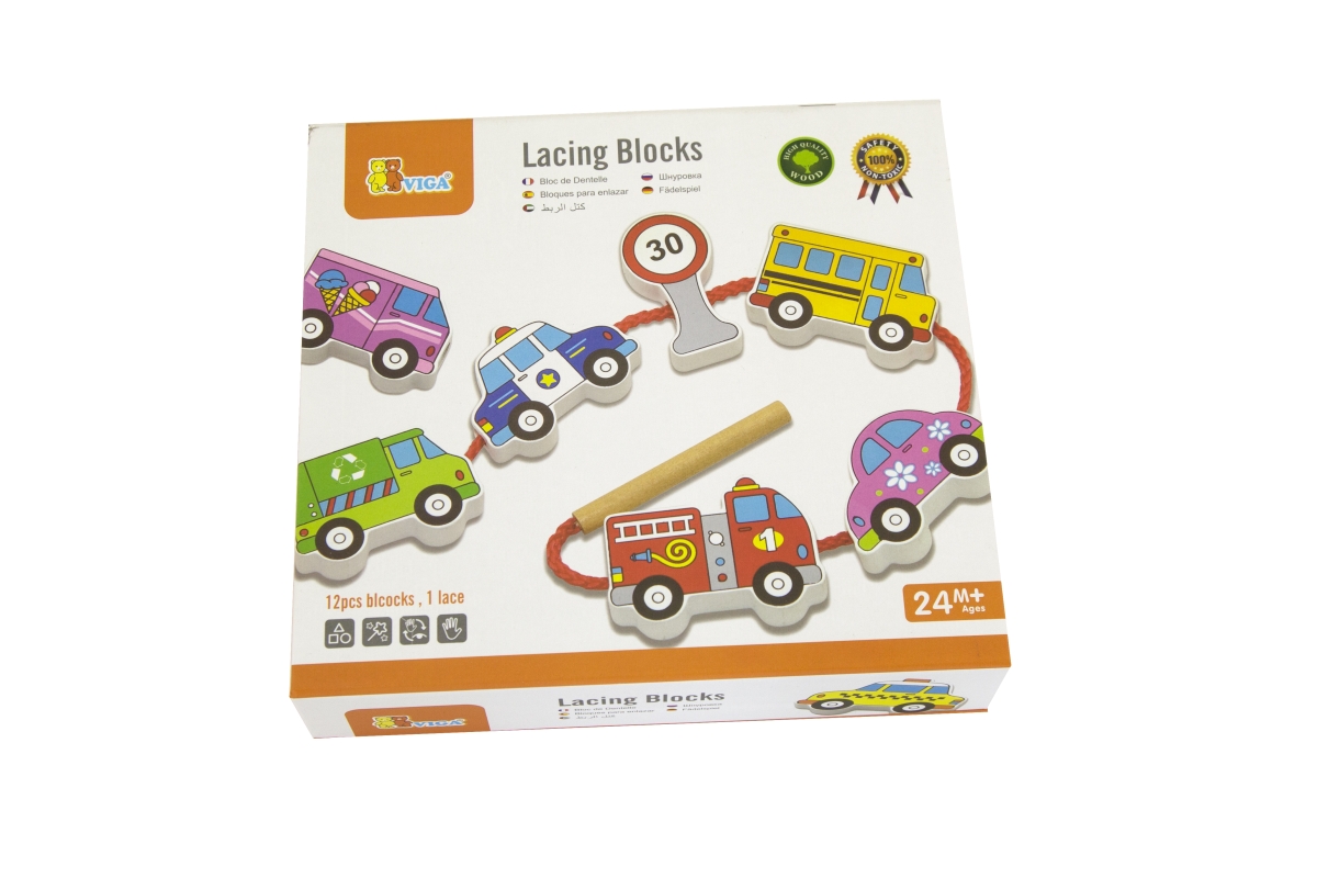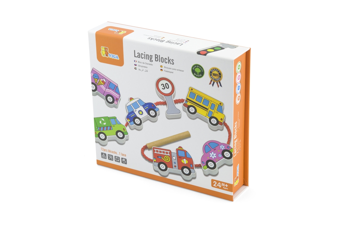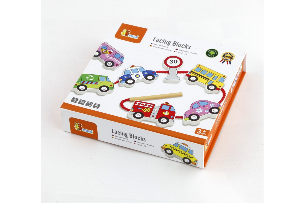 Dřevěné navlékání dopravních prostředků. Obsahuje 12 dřevěných bloků a 1 navlékací provázek. Baleno v krabičce, která slouží jako úschovný box. Rozměr..