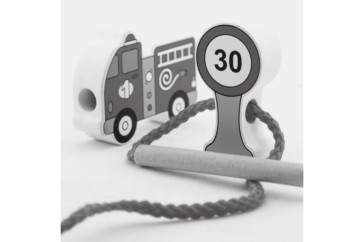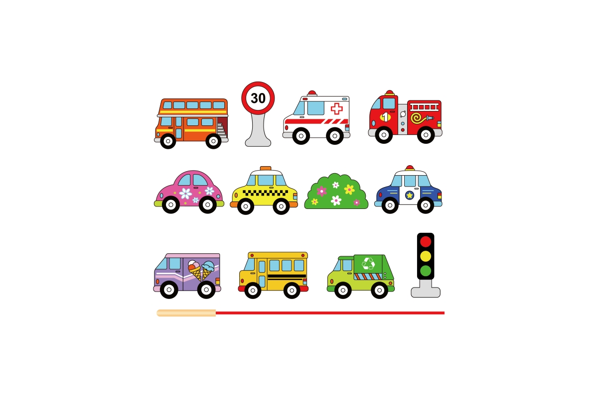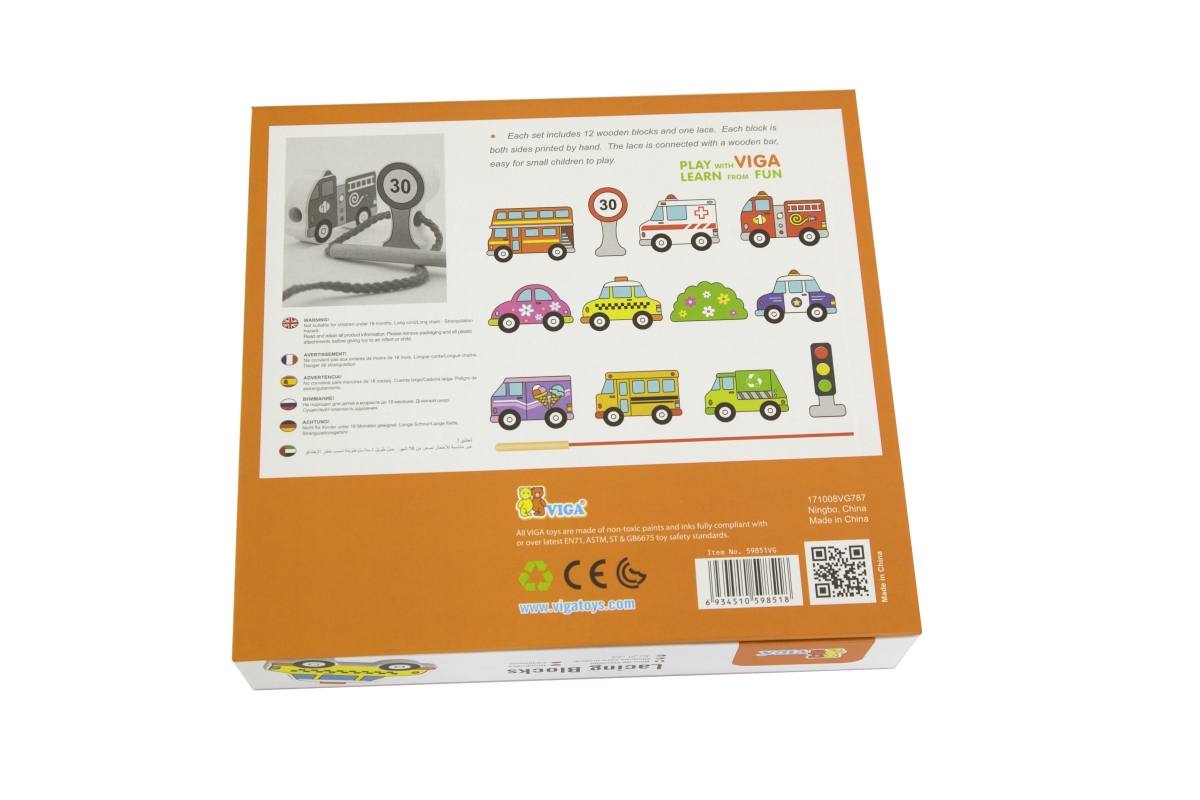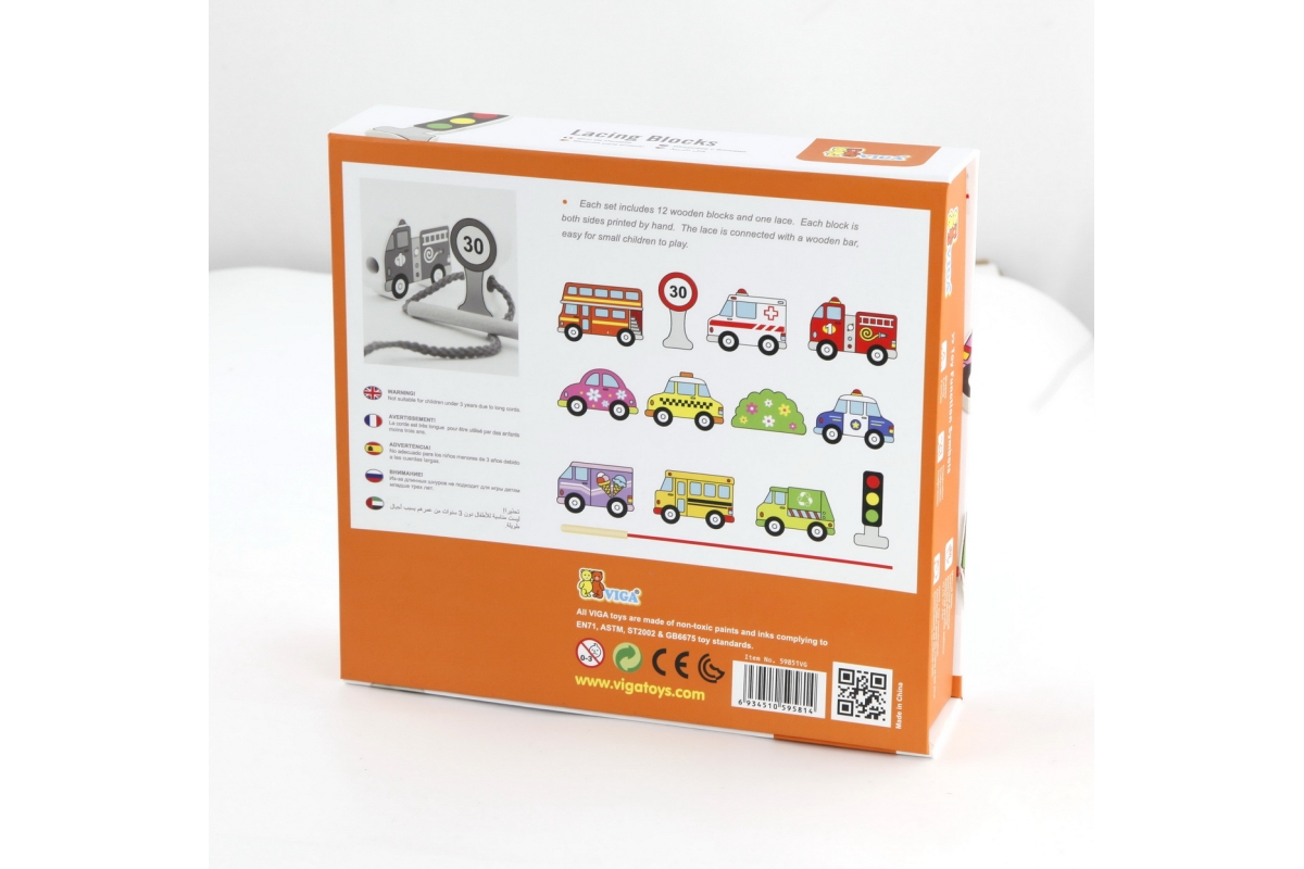 Dřevěné navlékání dopravních prostředků. Obsahuje 12 dřevěných bloků a 1 navlékací provázek. Baleno v krabičce, která slouží jako úschovný box. Rozměr..