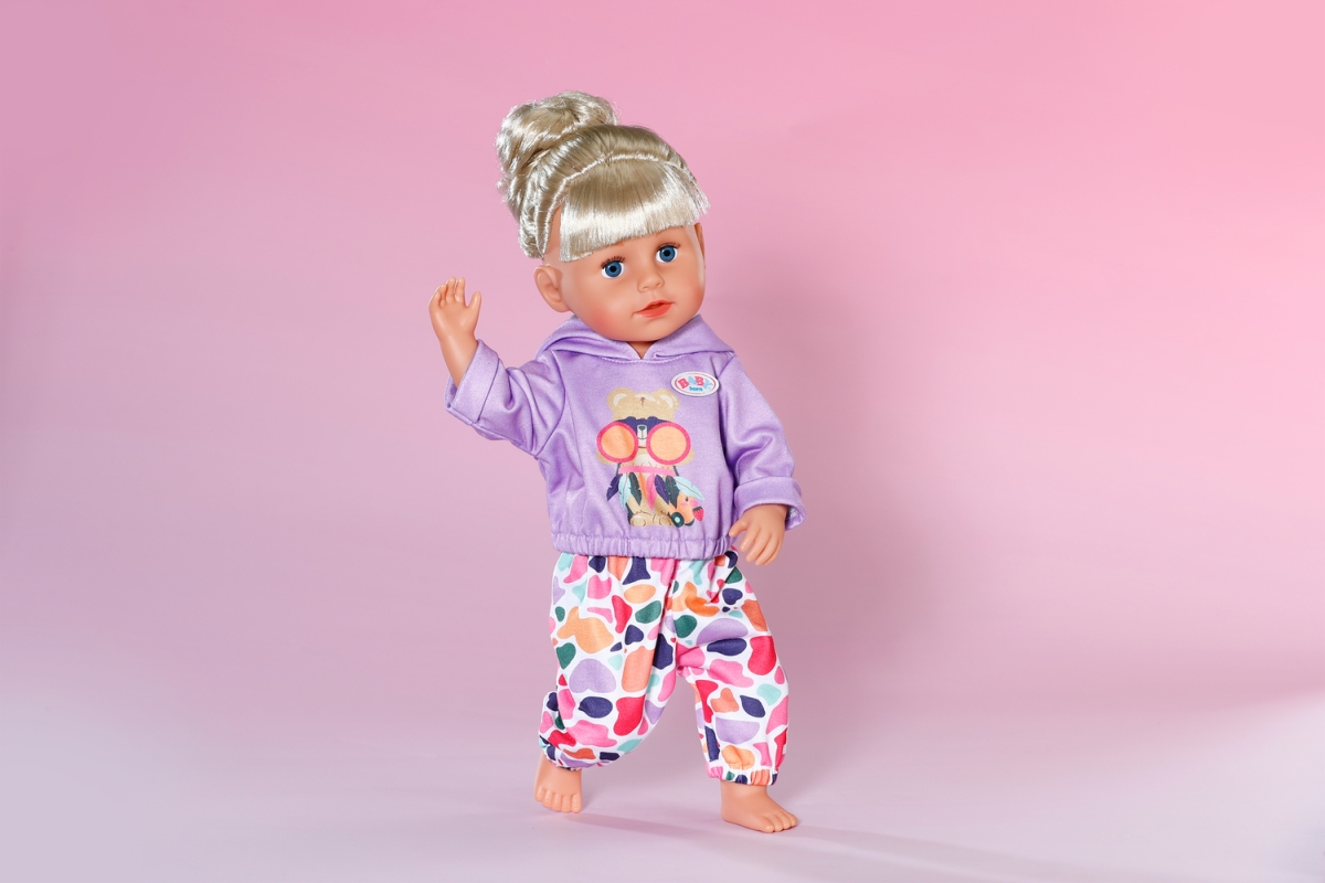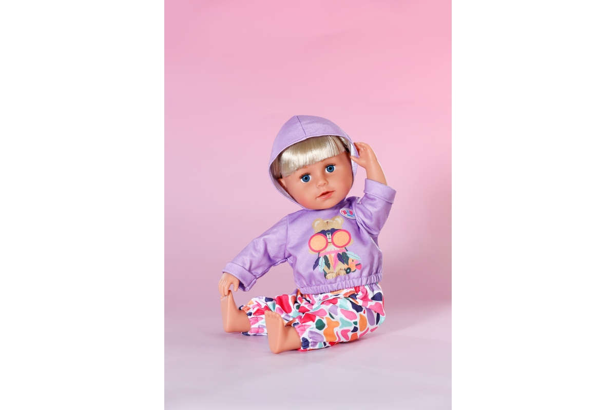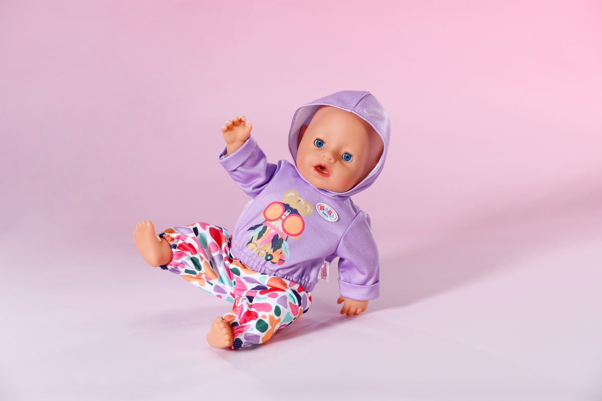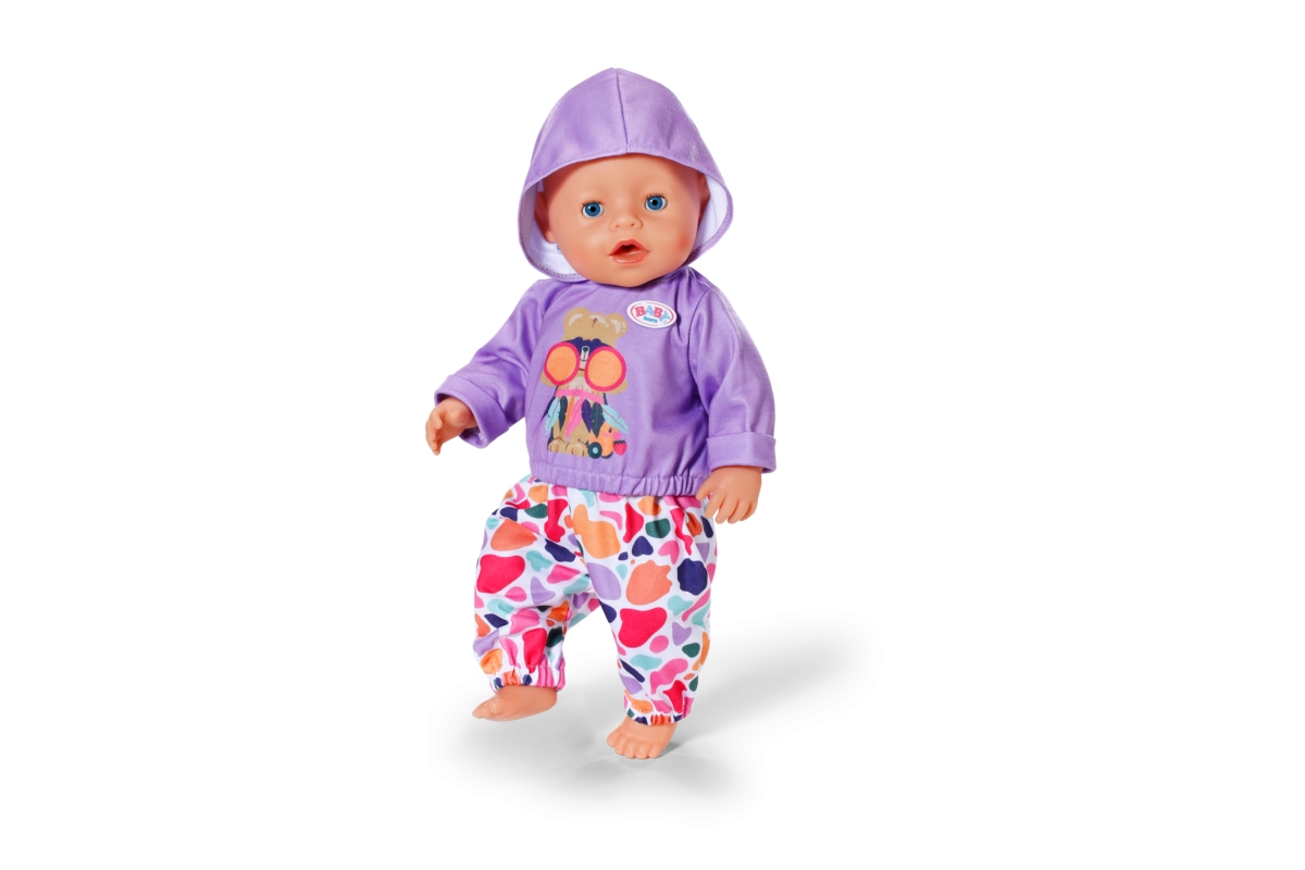 Oblečení velikosti 43 cm. Sada obsahuje fialovou mikinu a barvné kalhoty. Věk 3+..