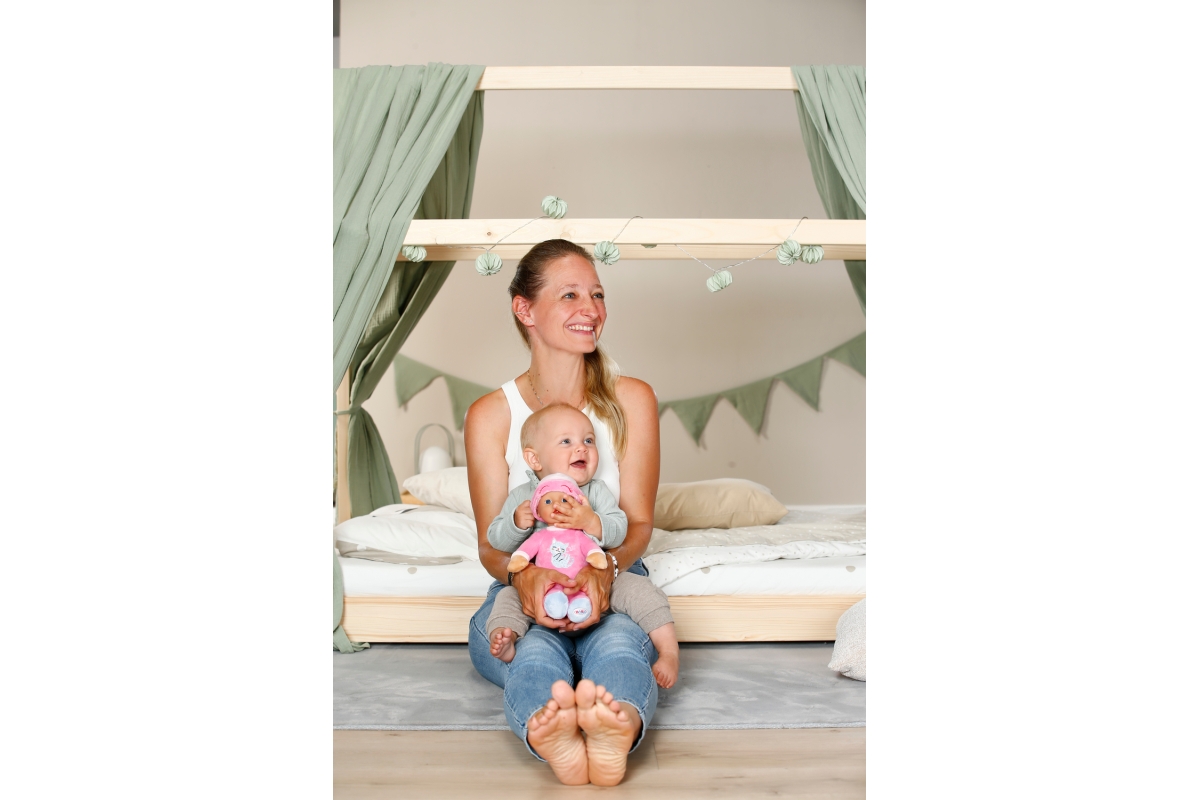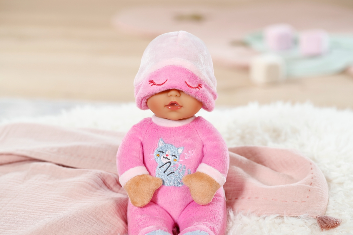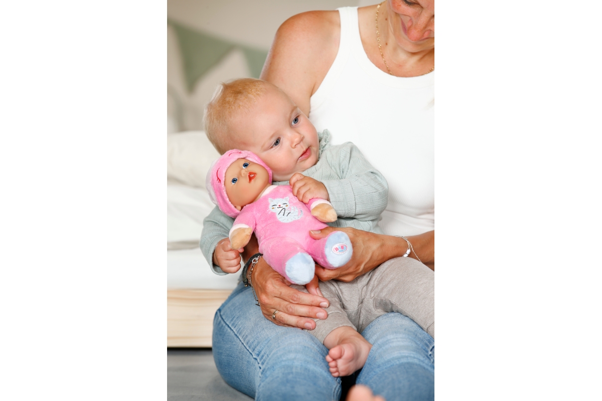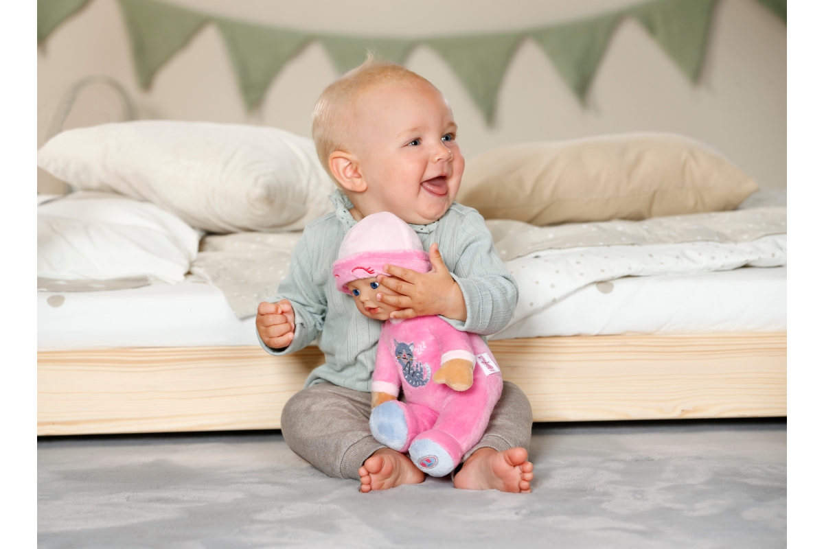 Čepičku dolů, čepičku nahoru, zavřít oči, otevřít oči... Panenka si vesele zakrývá a pak opět odkrývá oči, hra na schovávanou ji ohromně baví. S roztomilým Spinkáčkem mohou nejmenší objevitelé už od narození procvičovat uchopení a hmat. Tělíčko panenky velikosti 30 cm je měkce vycpané a uvnitř má chrastítko. Růžový overal panenky má na sobě výšivku s psím kamarádem Bellem, který surfuje na velkém listu. Látka čepičky, manžet a na chodidlech je zdobena květinovým potiskem. Pokud se Spinkáček venku trochu ušpiní, lze jej snadno vyprat v ruce na 30° C. Věk 0+