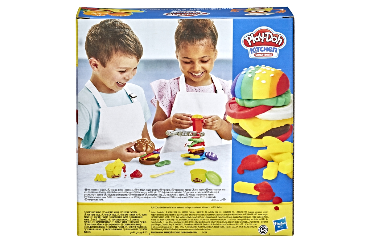 Balení obsahuje formičku hamburgeru, talířek, dávkovač+tvořítko, 8 menších kelímků s modelínou a doplňky k přípravě. Rozměry balení cca 20x22x6 cm. Vě..