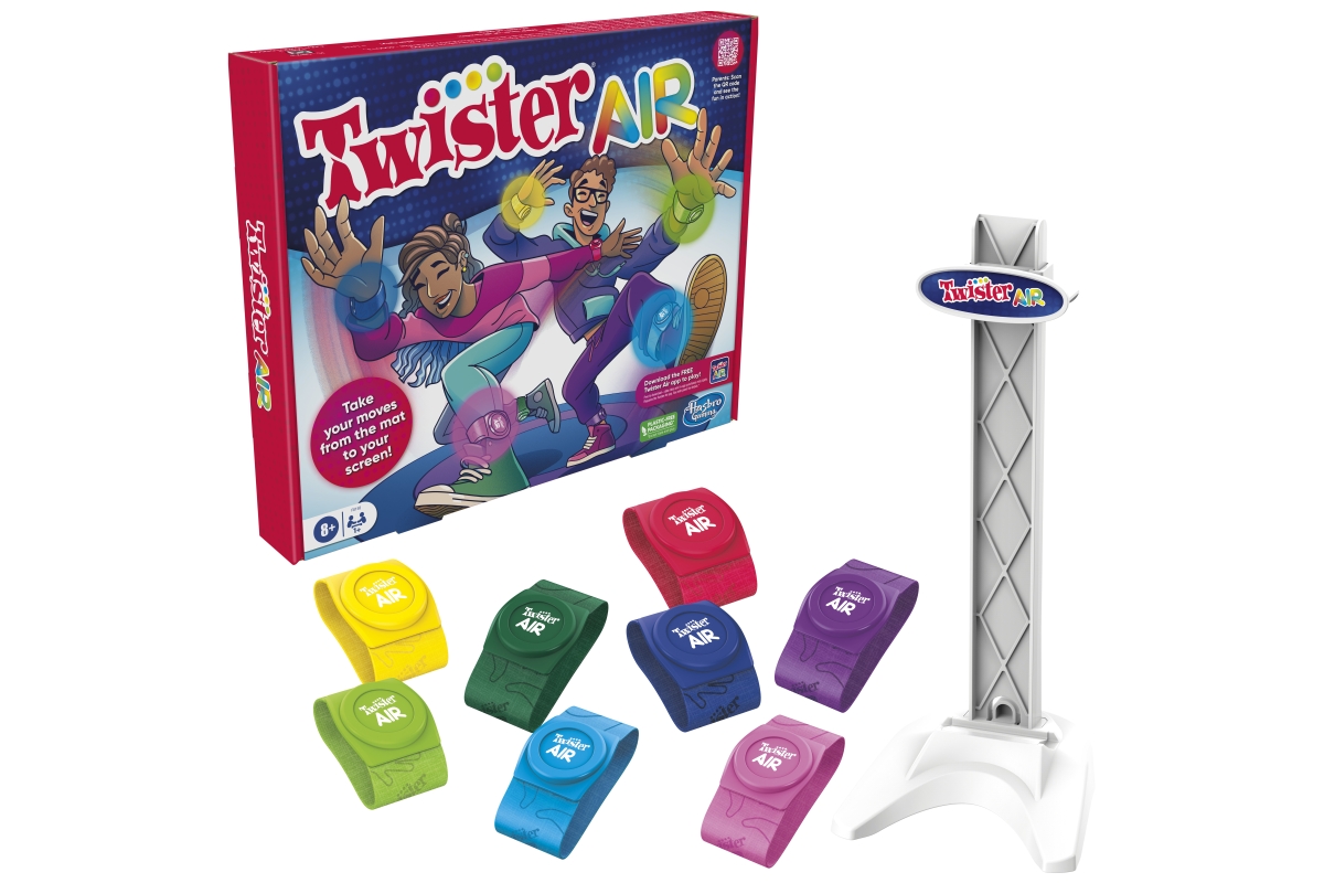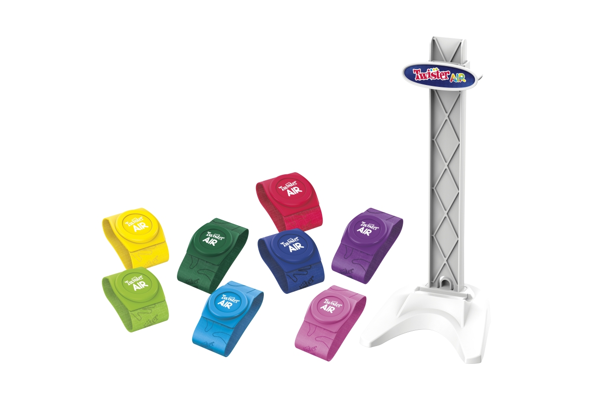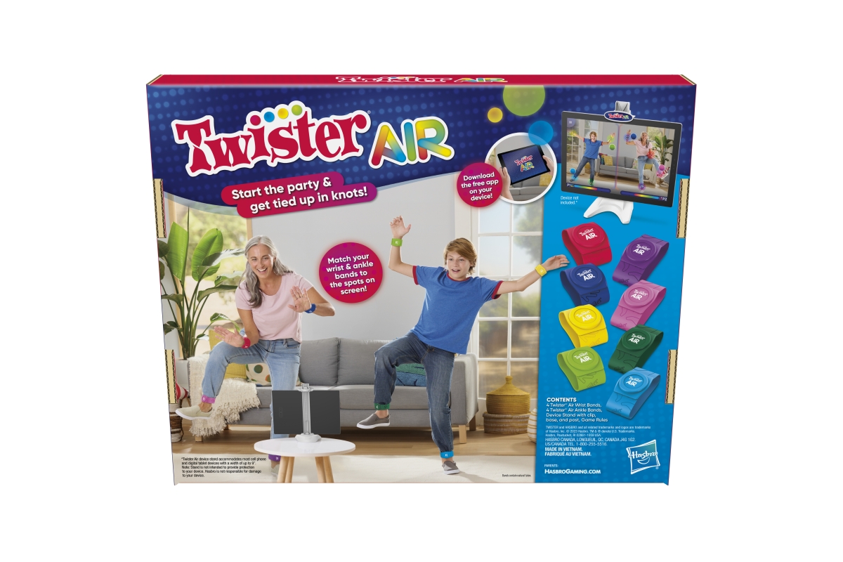Pohybujte se z podložky na obrazovku pomocí hry Twister Air! V této hře Twister s podporou aplikace se skupina přesune do chytrého zařízení hráče. Tato zábavná společenská hra obsahuje 8 barevných pásků Twister Air a stojánek na zařízení, který funguje pro jakýkoli smartphone nebo tablet. Chcete-li začít, stáhněte si aplikaci Twister Air (ke stažení zdarma – mohou být účtovány přenosové rychlosti a nákup v aplikaci) a vložte chytré zařízení do přiloženého stojanu. Poté si hráči nasadí pásky na zápěstí a kotníky a jsou připraveni k akci! Jak hraje hudba, hráči pohybují tělem tak, aby jejich kapely odpovídaly barevným skvrnám na obrazovce. Natahujte se, přejíždějte, tleskejte a dělejte bláznivé pózy. Čím více bodů zasáhne, tím vyšší skóre. Věk 8+